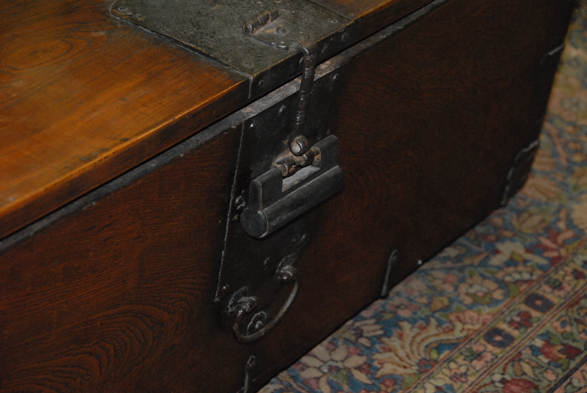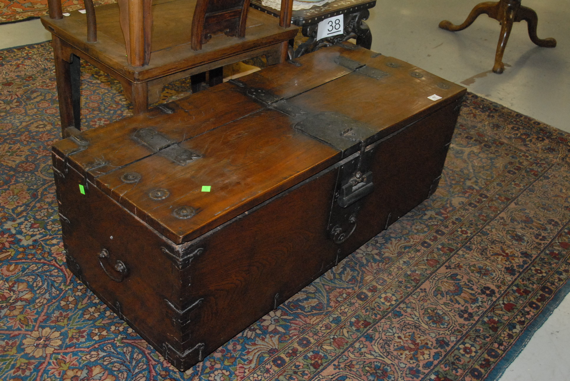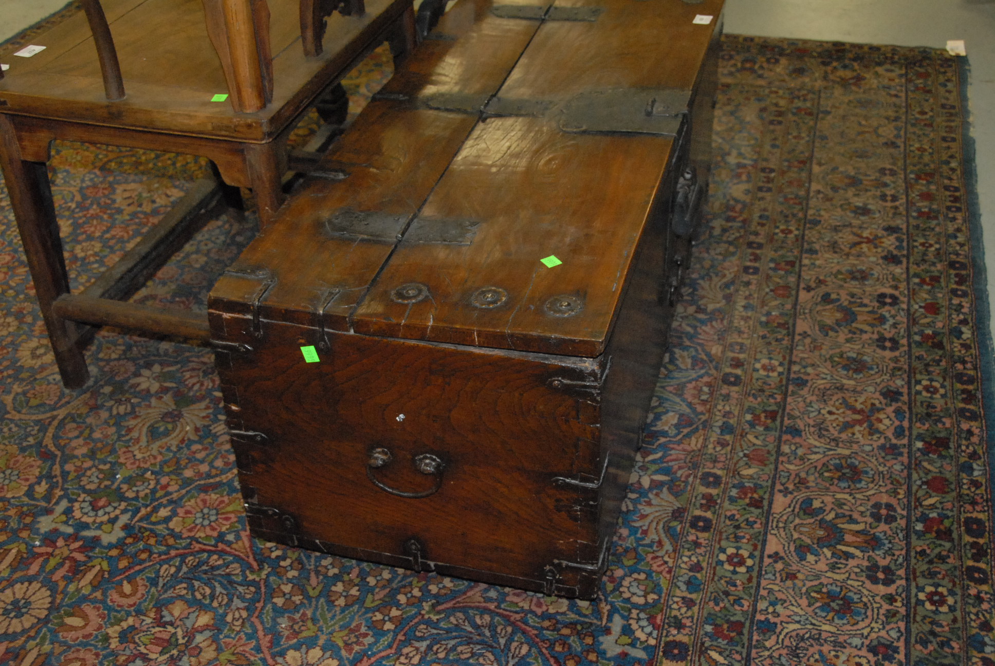 Lot 435: Large low hardwood chest Bandaji with iron hardware, single compartment with hinged top, handles and lock, possibly walnut or zelkova wood, Korea, Joseon Dynasty, 19th century or older. ht. 16in. wd. 18in. lg. 42in.