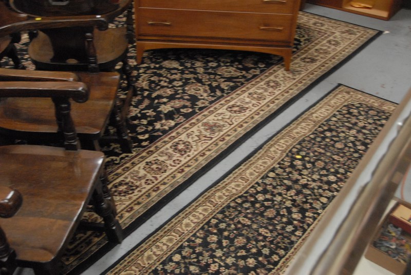 Three black and tan machine made rugs including room size 7’7 x 11′, throw rug 5’5 x 7’7, and runner 2’1 x 7’7.