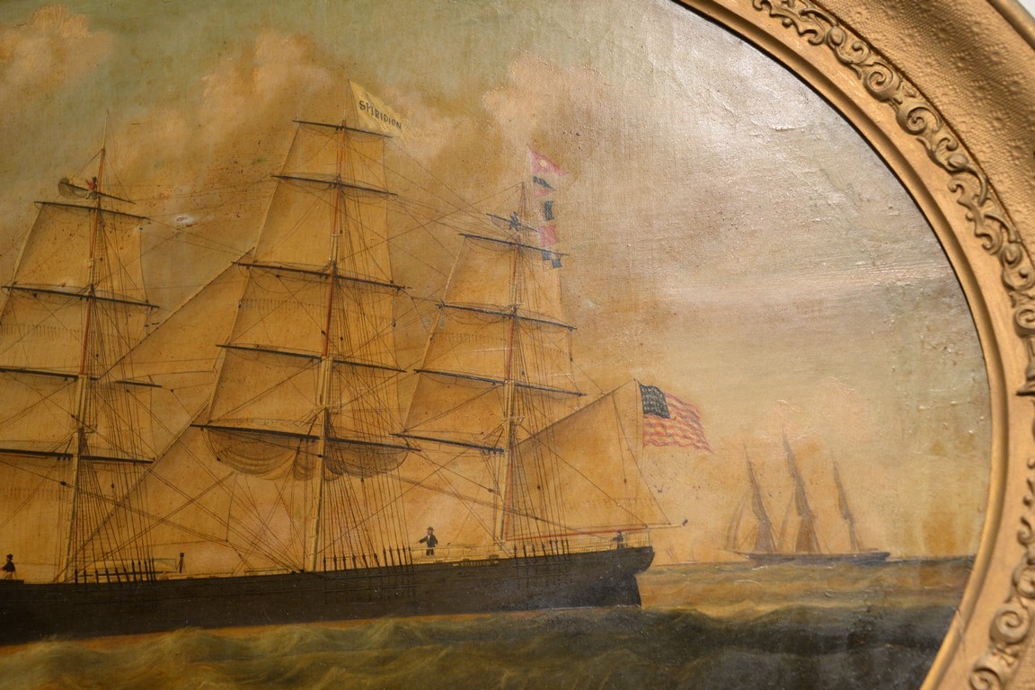 William Gay Yorke 1817-1892 oval oil on canvas American Ship SPIRIDION off Liverpool circa 1860 signed bottom center: Wm Yorke L. Pool 28 x 38 1/2 Captain William Jordan Class 1, 1148 tons with two decks, draft 21′ white oak wood vessel 18’3 x 32’6×21’6 built 1859 by R& JW Jacobs, Maine Owner R&JW Jacobs