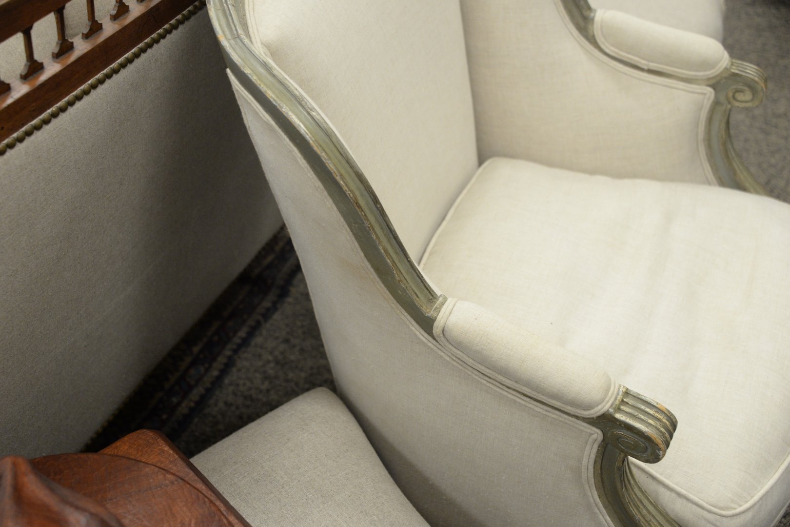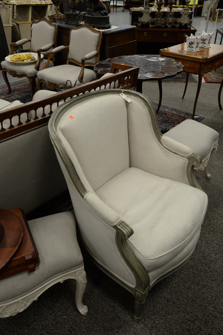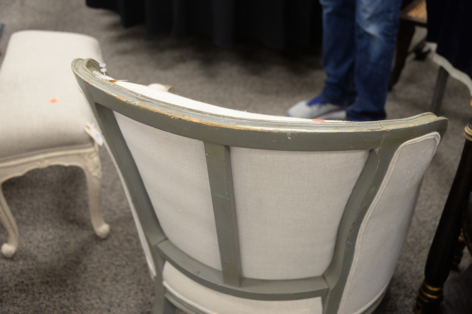 19th Century French Painted Upholstered Armchair, height 35 inches, width 28 inches.