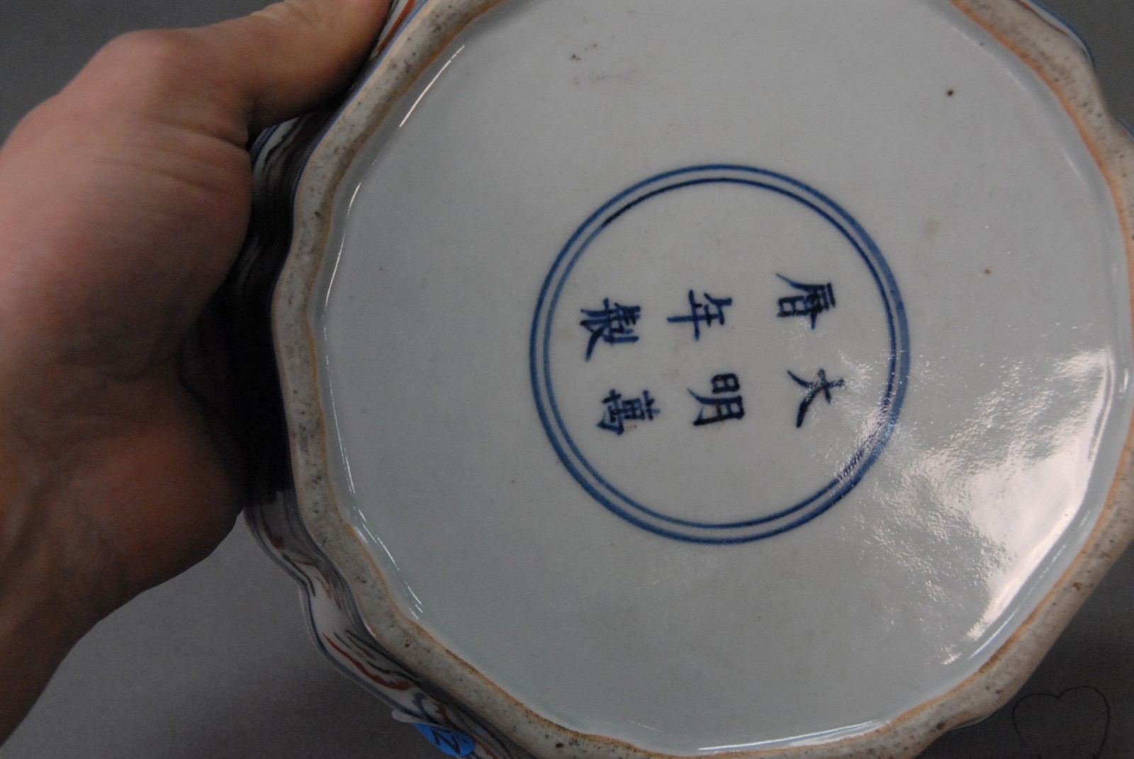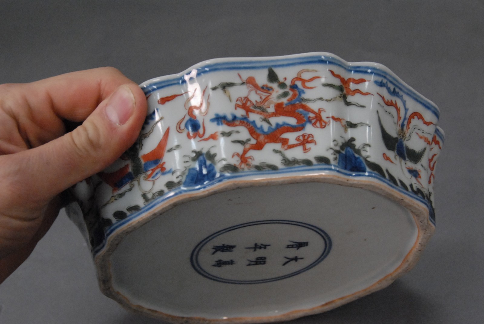 Chinese wucai lobed bowl in Wanli style, spurious Ming mark, 19th century – 20th century.