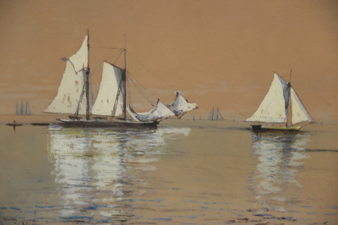 Edmund Darch Lewis 1835-1910, watercolor and gouache on paper, Landscape with Sailing Vessels off Shore, signed lower left: Edmund D. Lewis 1882, 16 x 27