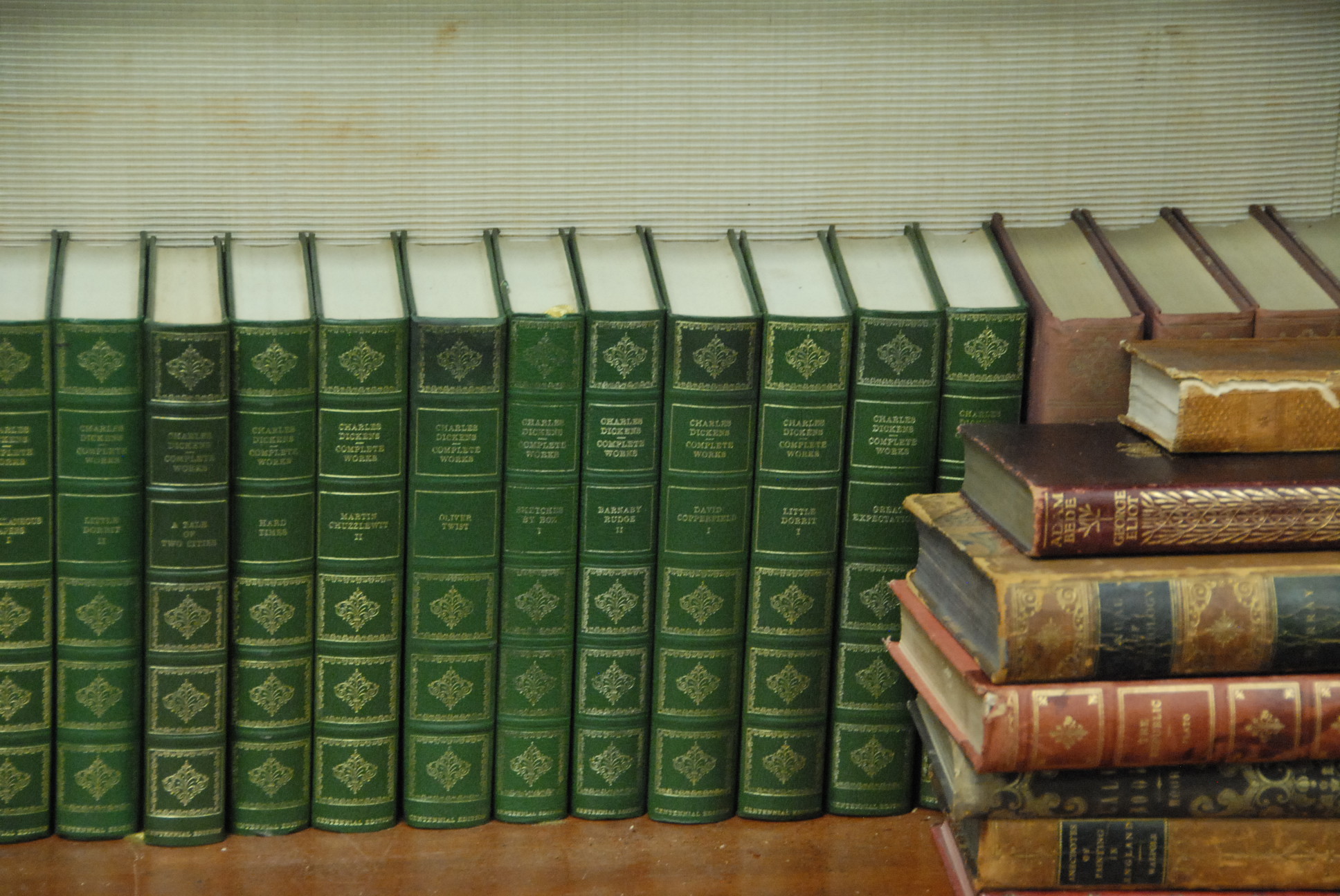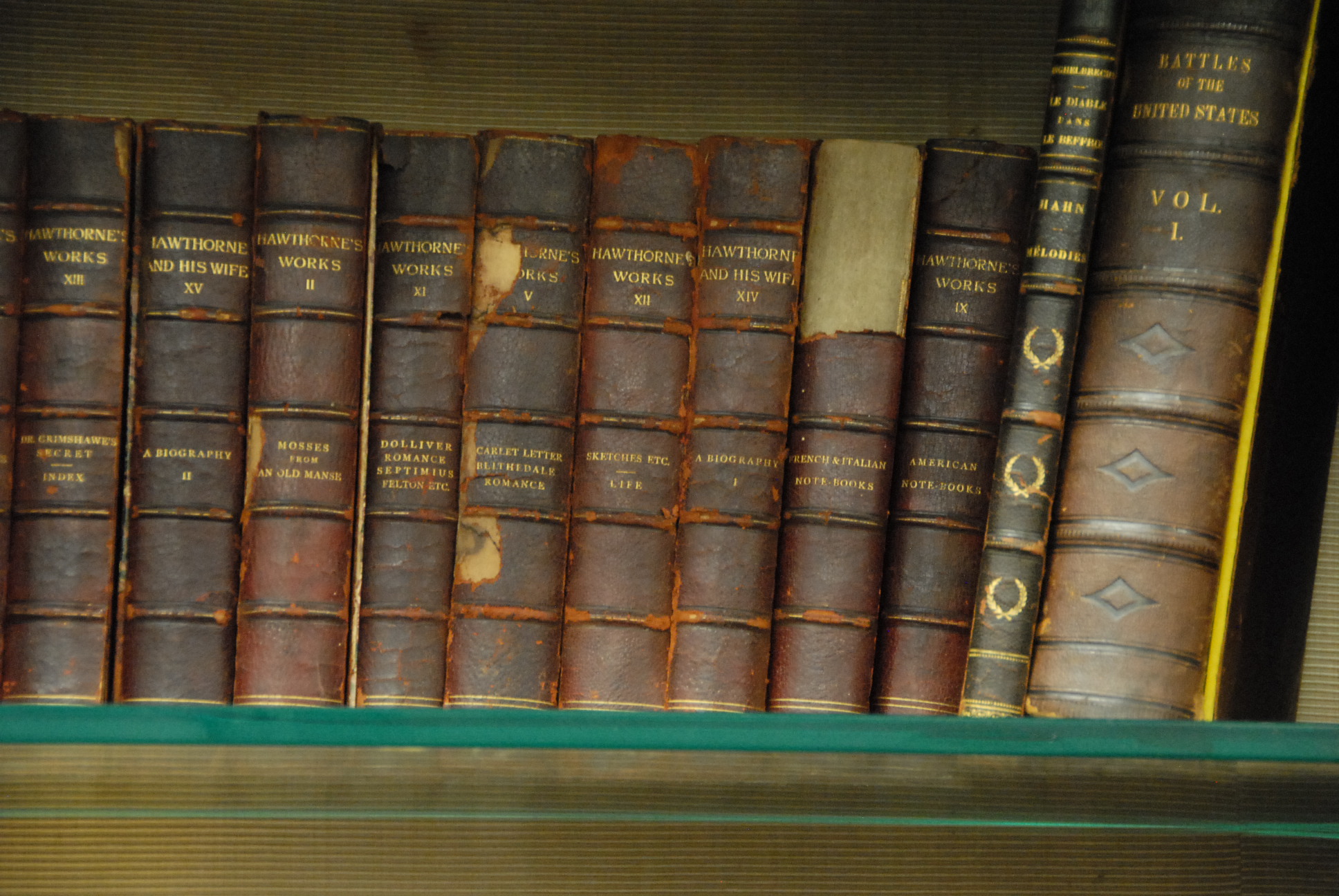 Four shelves of mostly leather bound books including Oscar Wilde, Hawthorne’s Works, Burn’s Works, The Works of Voltaire, Battles of the United States, American Revolution, etc.