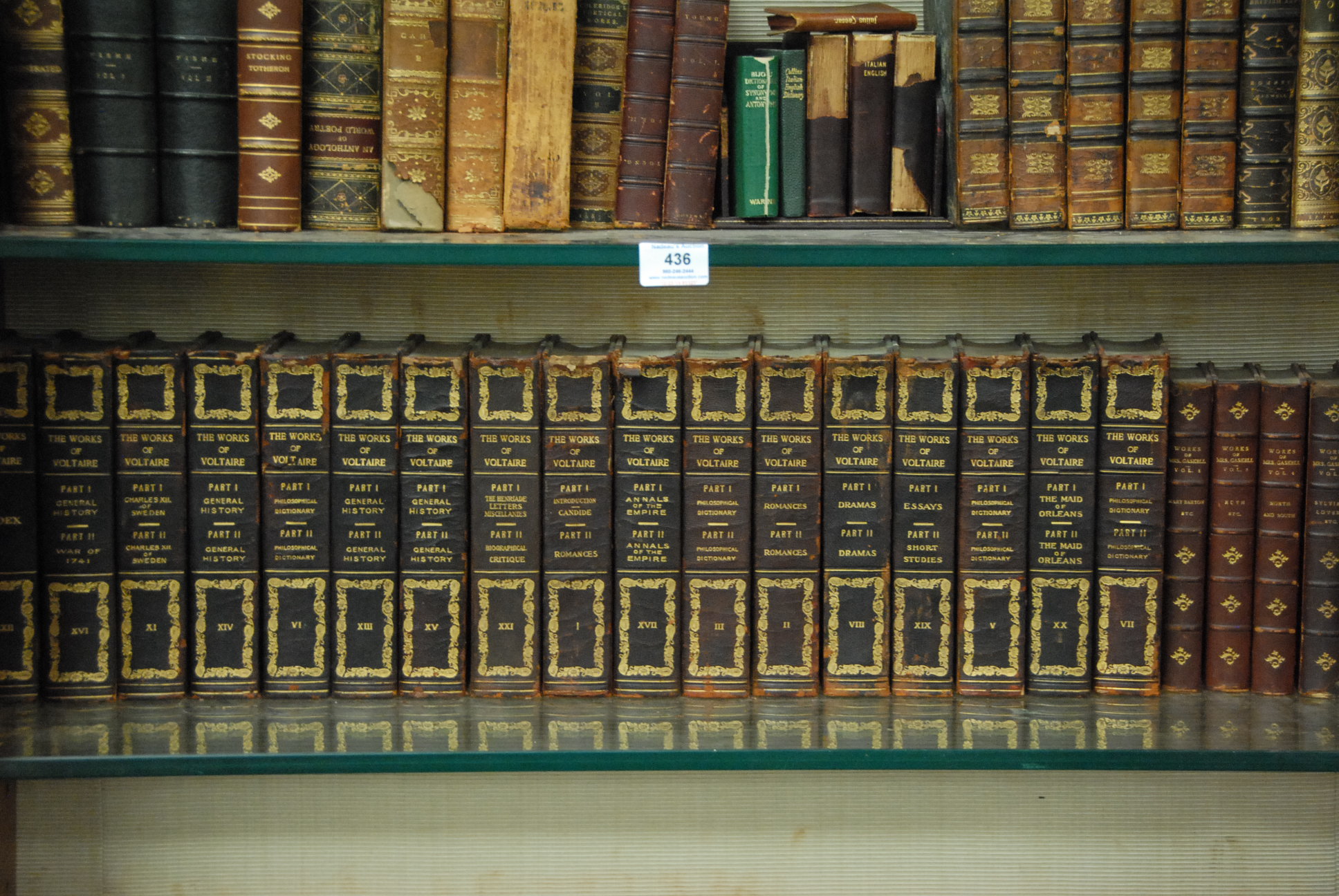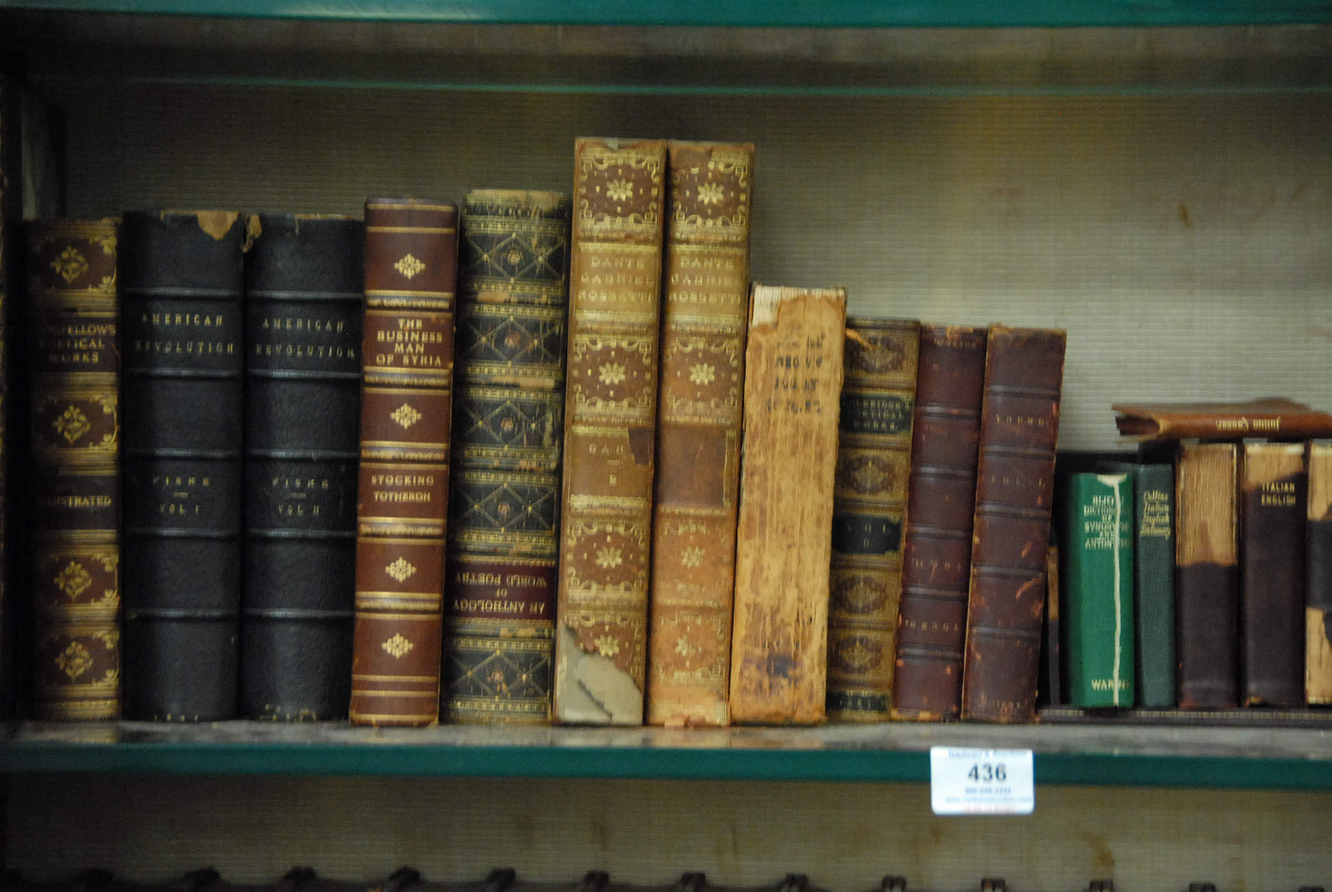Lot 436: Four shelves of mostly leather bound books including Oscar Wilde, Hawthorne’s Works, Burn’s Works, The Works of Voltaire, Battles of the United States, American Revolution, etc.