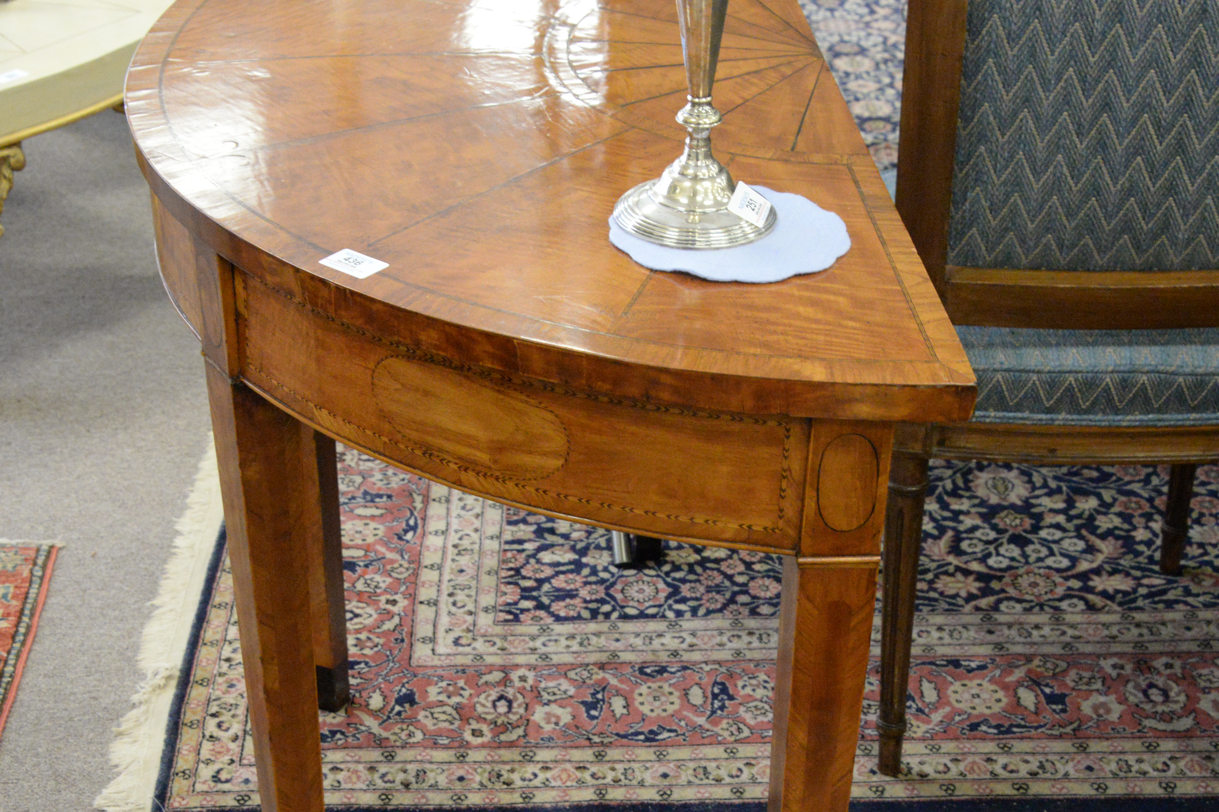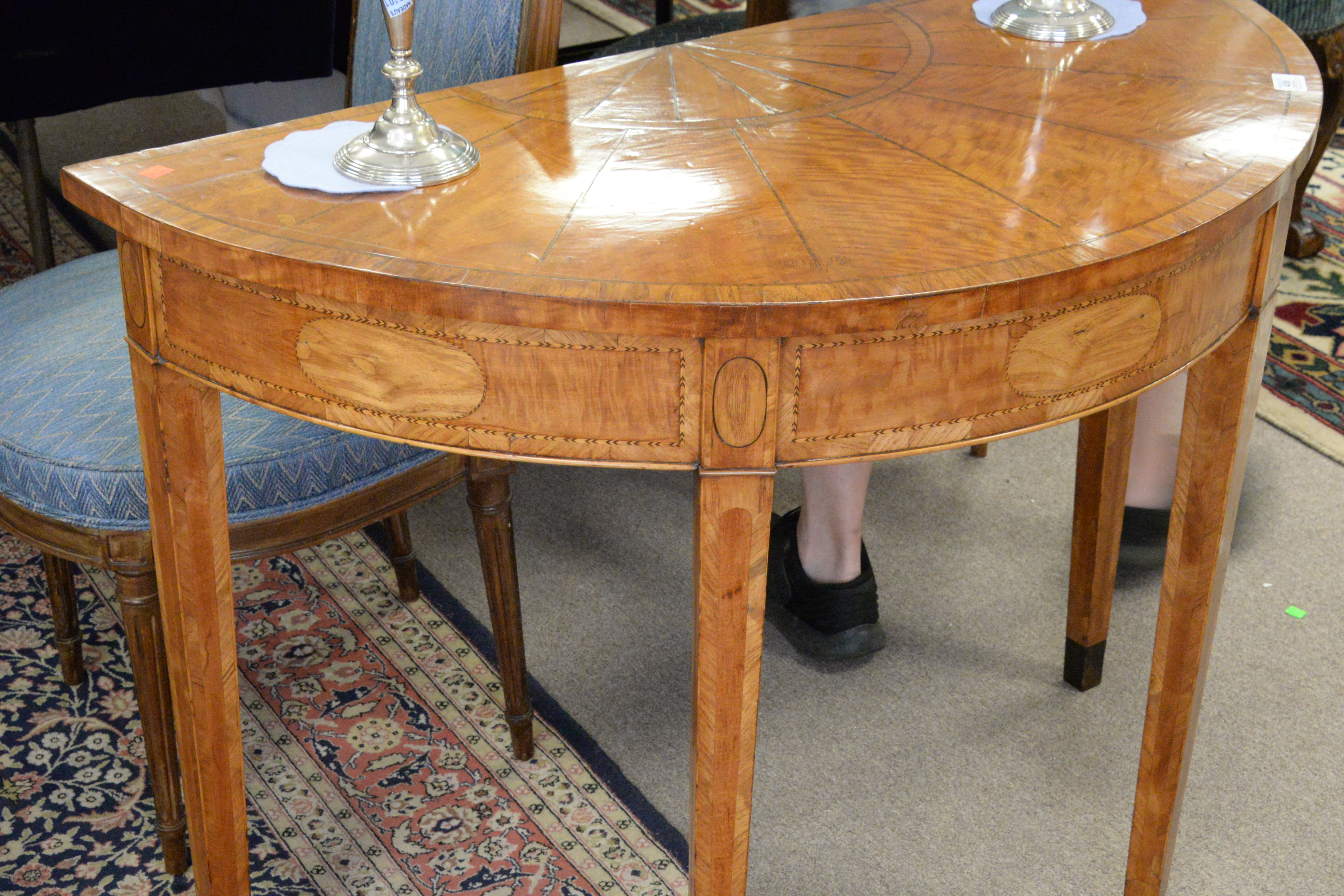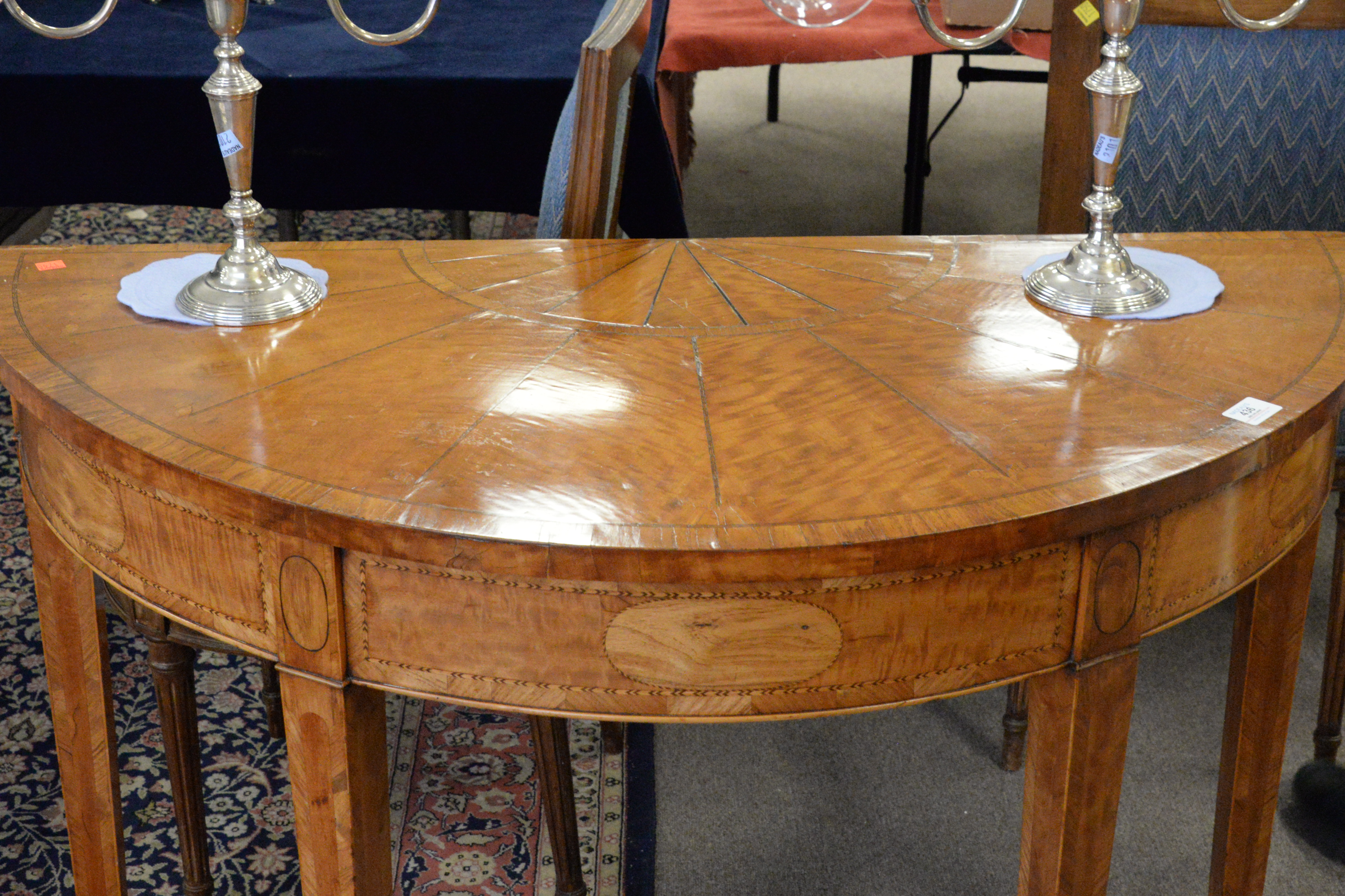 George IV Satinwood Demilune Table, with various wood inlays and section panels, labeled Malcolm Franklin Inc, height 31 inches, width 42 inches, depth 21 3/4 inches