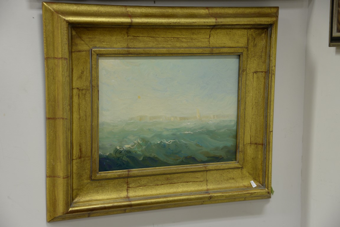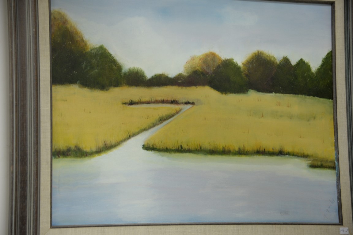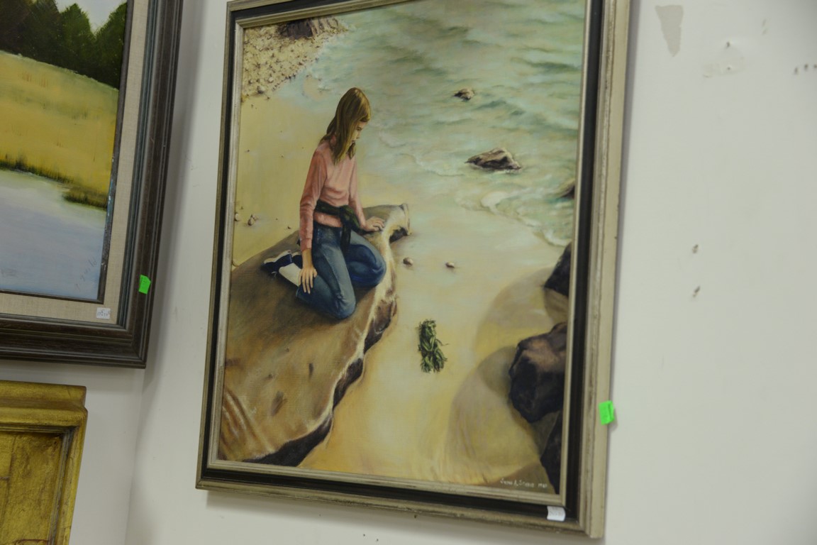 Lot 436: Group of five Contemporary paintings including Susan A. Schaub oil on canvas beach with girl 1987, G. Guild oil on canvas marsh 17 …