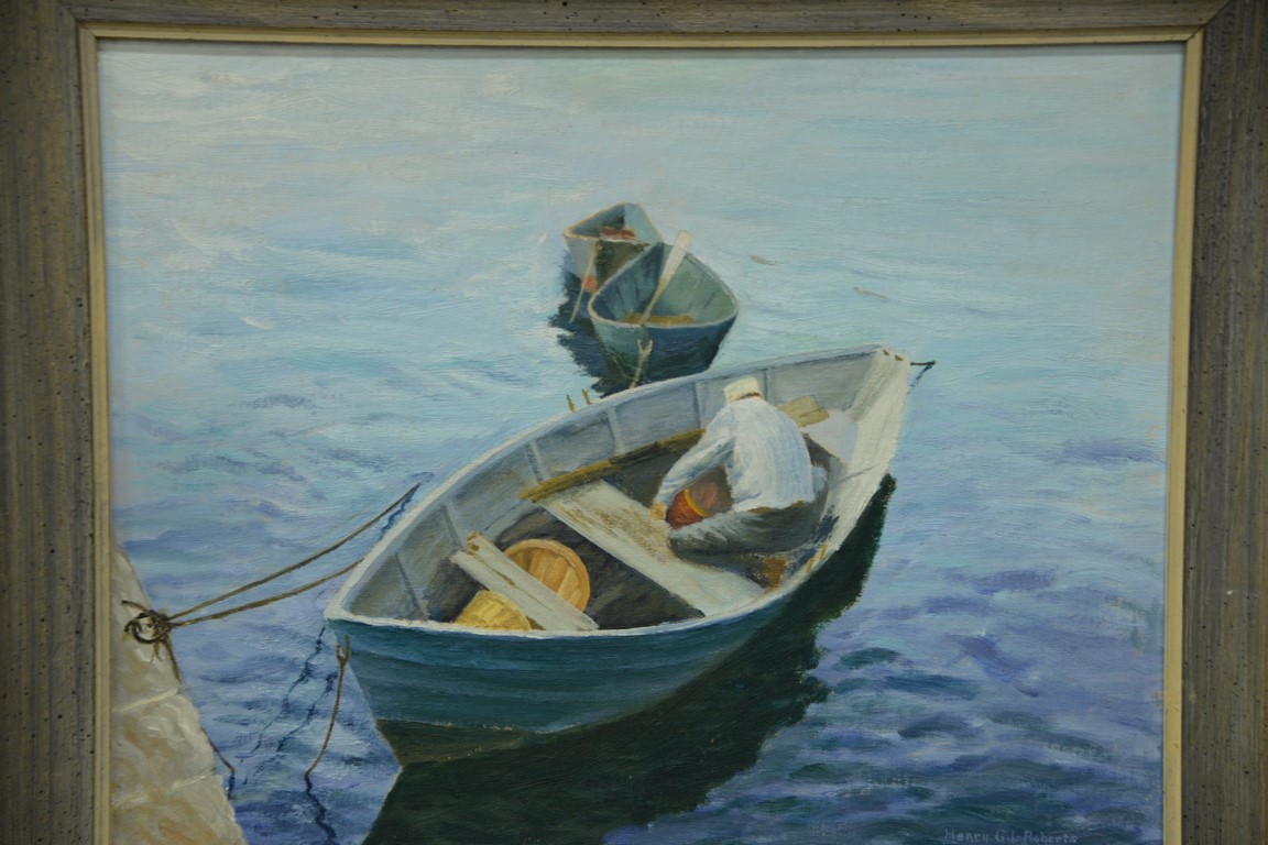 Group of five Contemporary paintings including Susan A. Schaub oil on canvas beach with girl 1987, G. Guild oil on canvas marsh 17 x 23, oil on canvas Ocean signed indistinctly in gold frame 12 x 16, Henry Gils Roberts oil on artist board of men in row boat 15 x 19, and Schink oil on canvas ocean beach scape 21 x 27.
