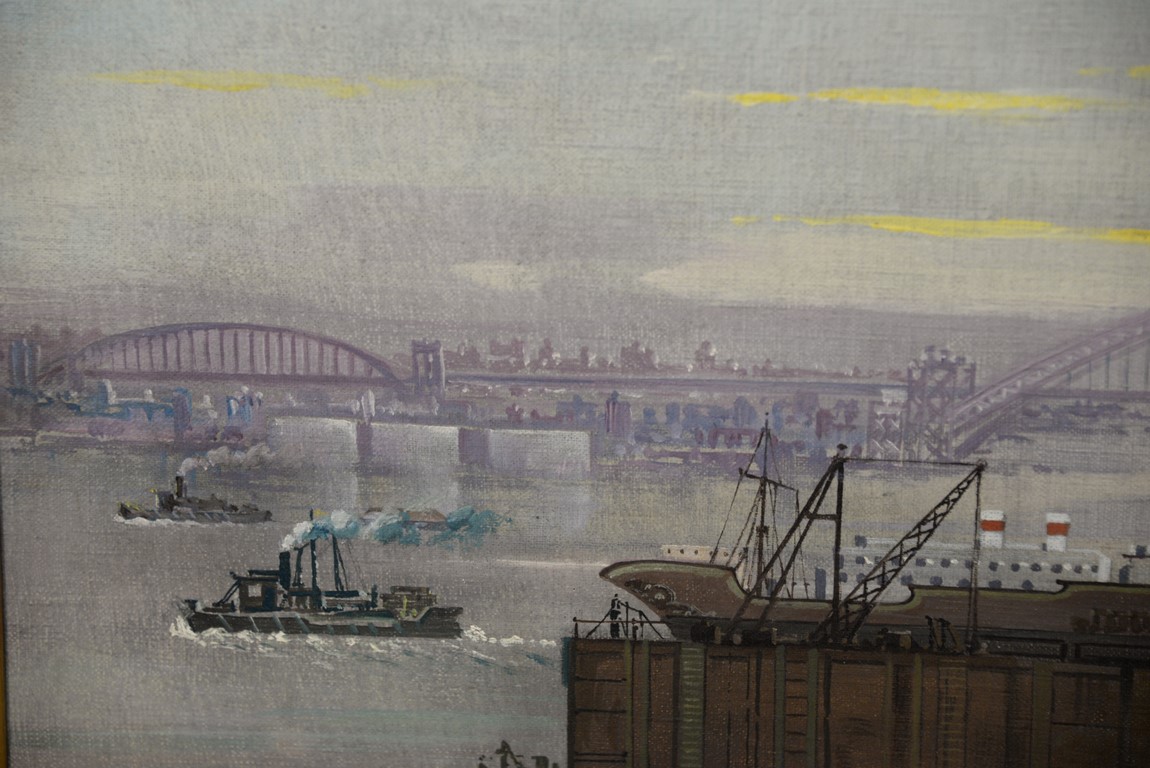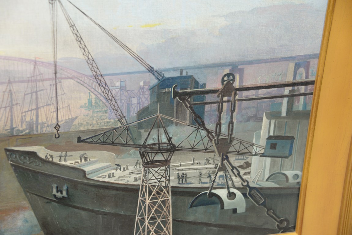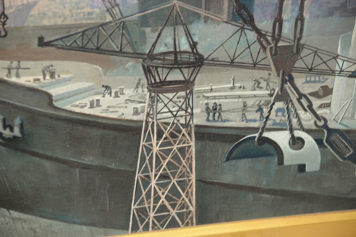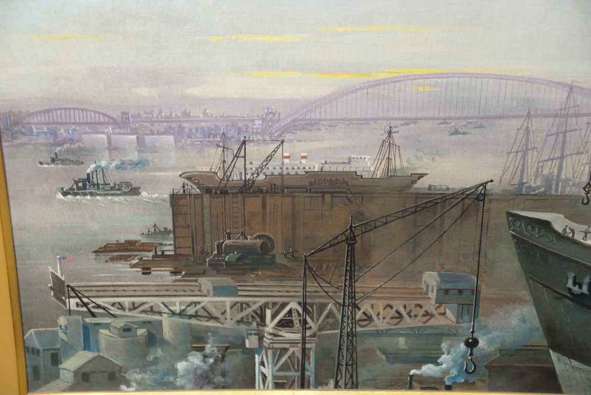 Lot 436: Huga A. Weiss Shipyards – Staten Island oil on canvas signed on back of stretcher: Hugo A. Weiss titled on reverse re…