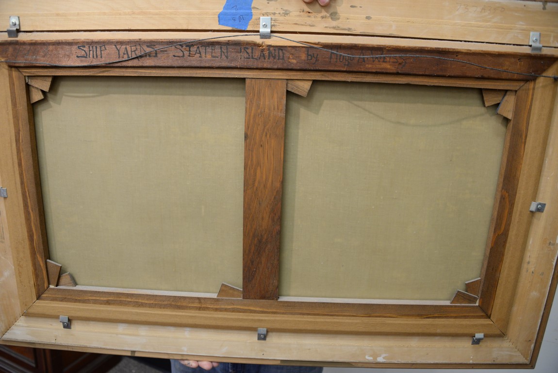Huga A. Weiss Shipyards – Staten Island oil on canvas signed on back of stretcher: Hugo A. Weiss titled on reverse restretched and relined 20 x 36