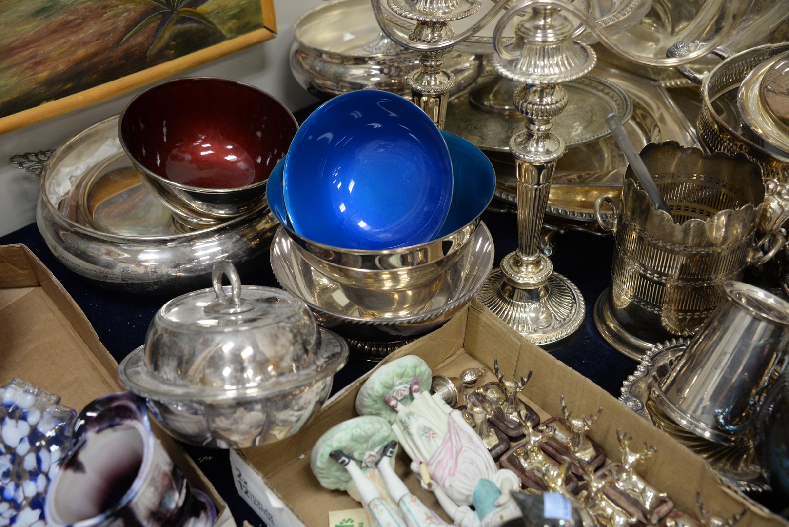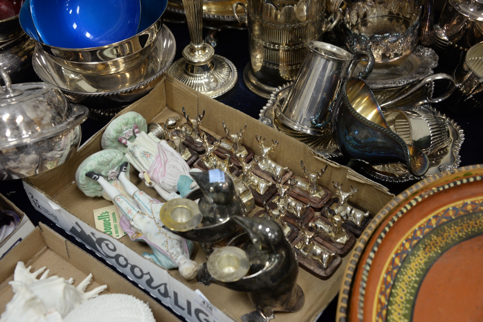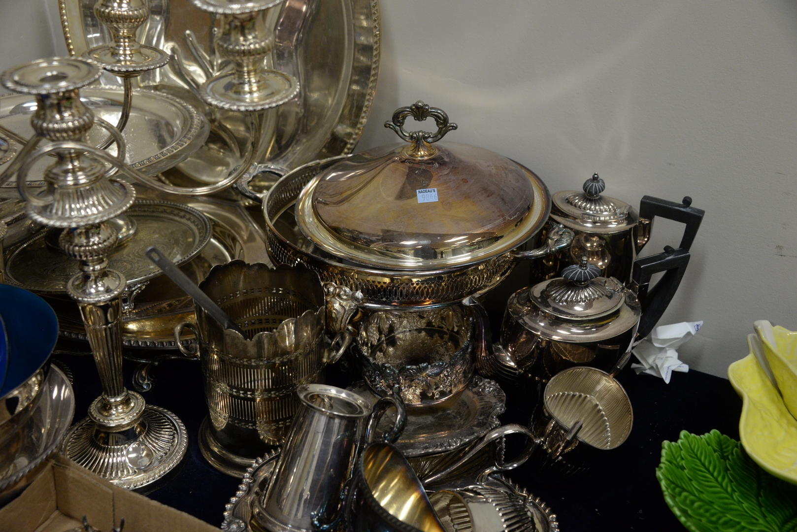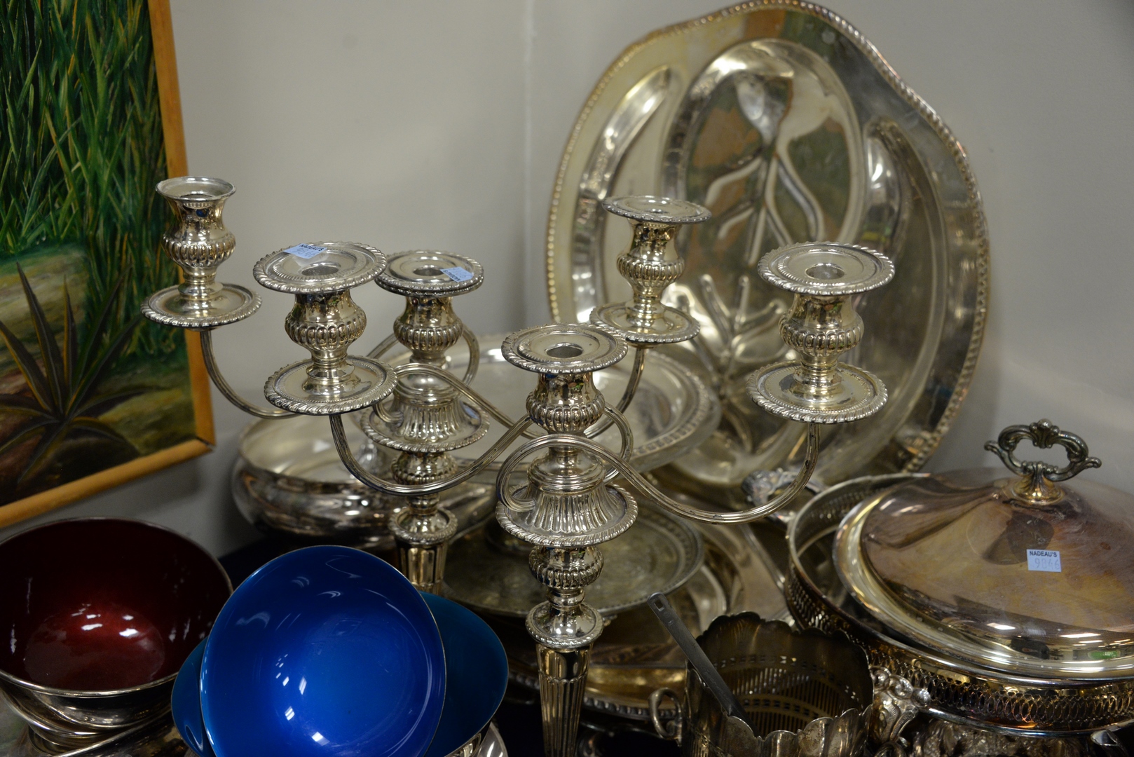 Lot 436: Large Lot of Silver Plate to include candelabra, trays, vegetable dishes, tea set, place card holders, along with pair of Restoration Hardware penguin cardholders.