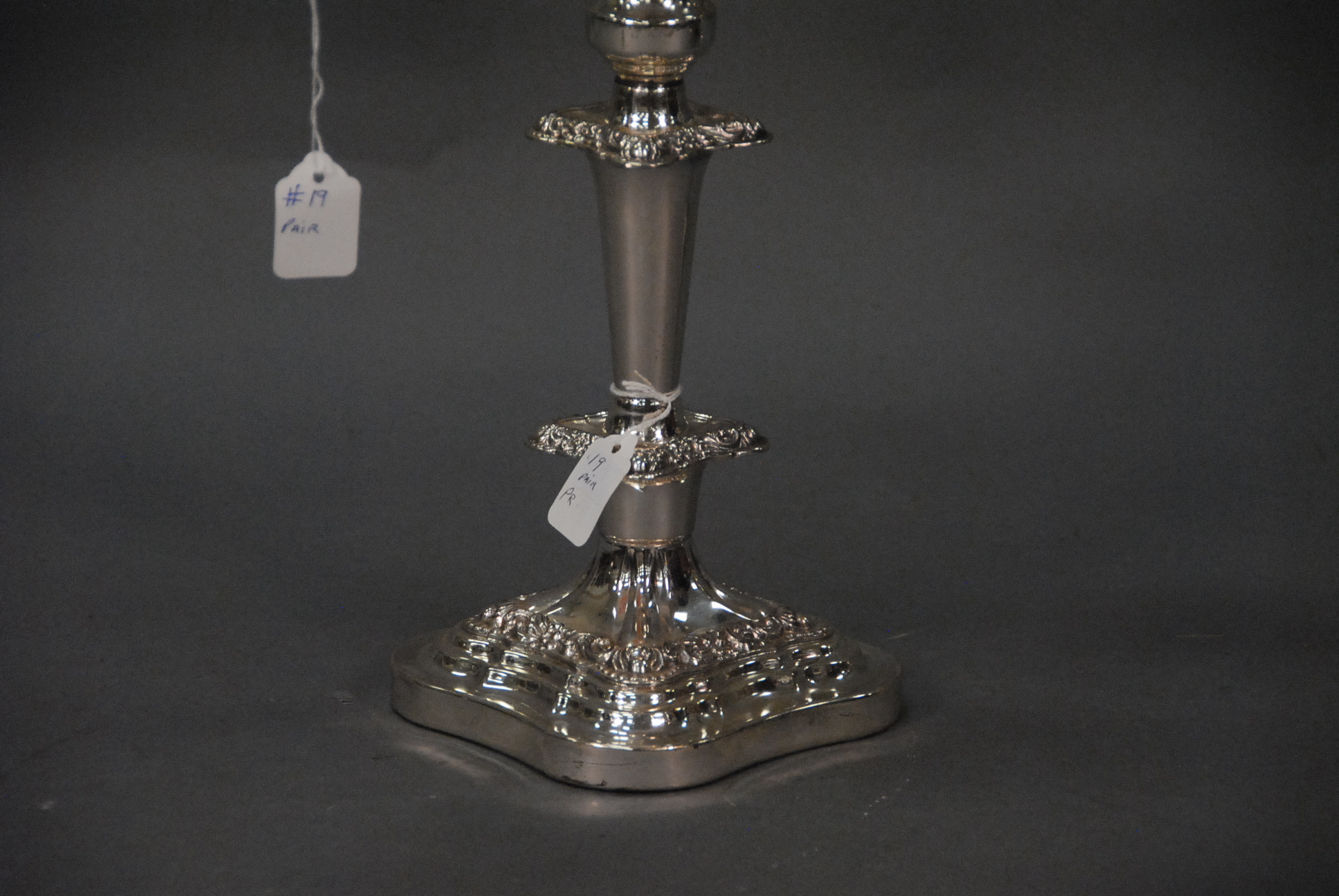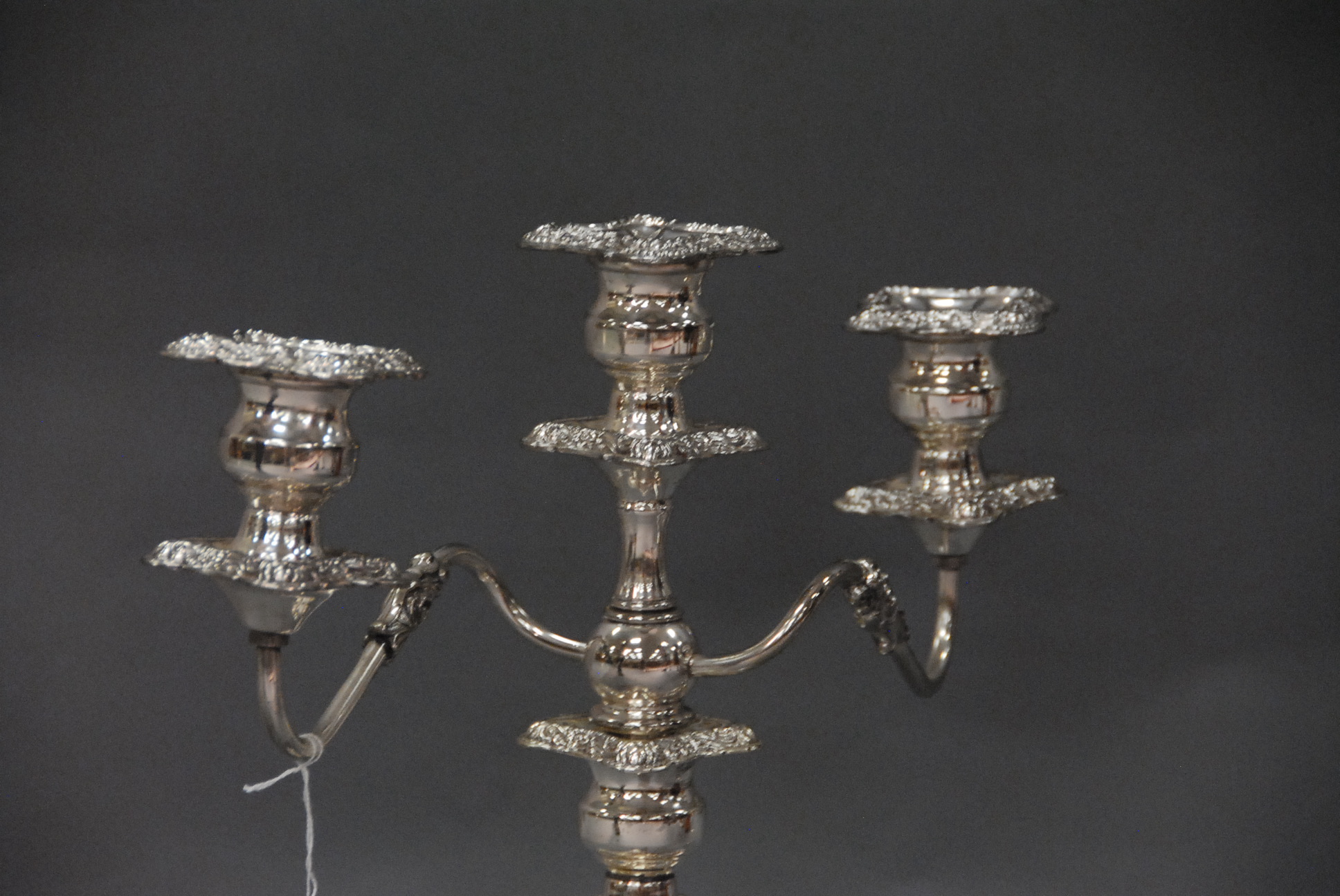 Large pair of ornate Sheffield triple sconce candelabra, ht. 11 1/2, plus tops, total ht. 18 1/4.