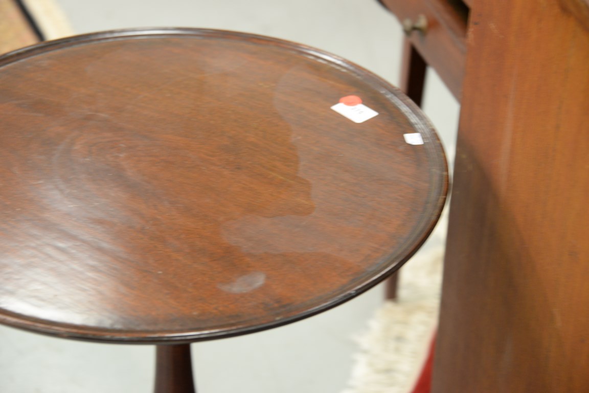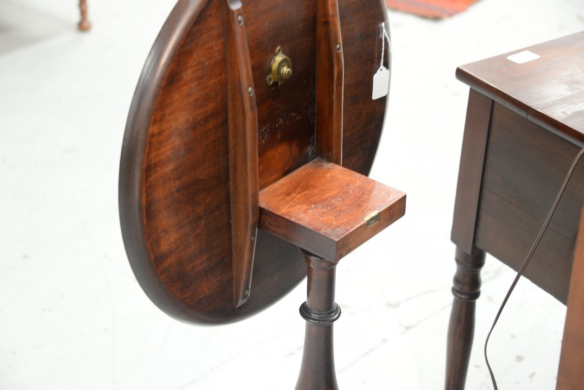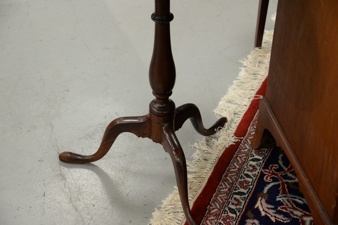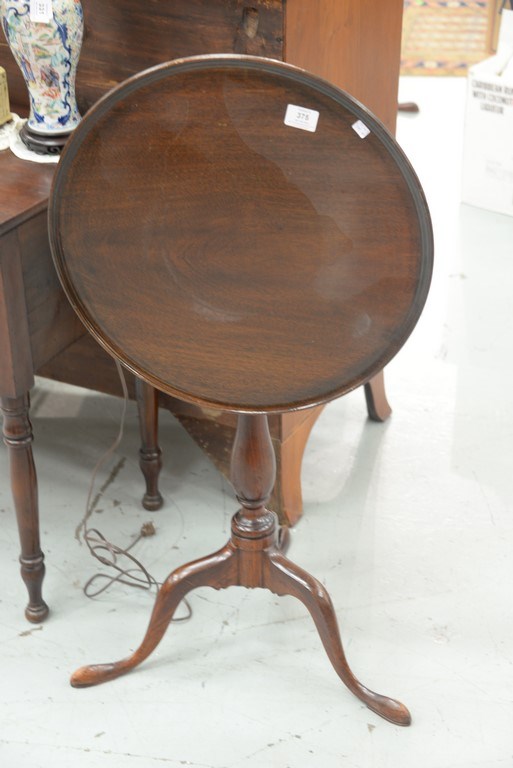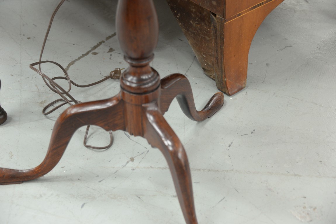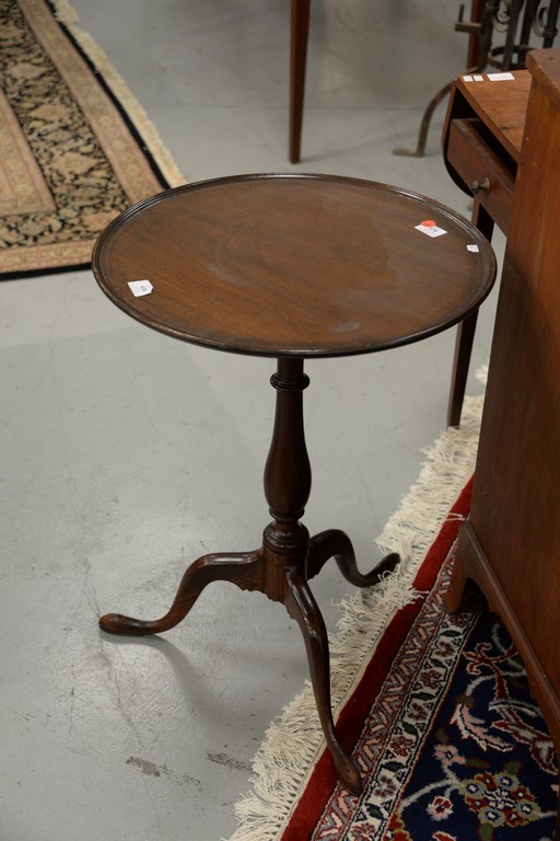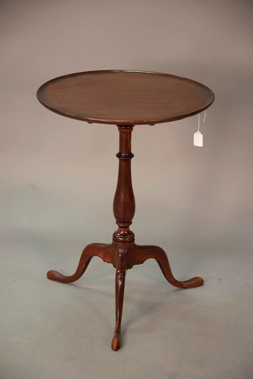 Lot 436: Mahogany tip candlestand with round dished top on turned shaft ending in tripod base, in manner of Margolis. ht. 26 1/2 in. dia….
