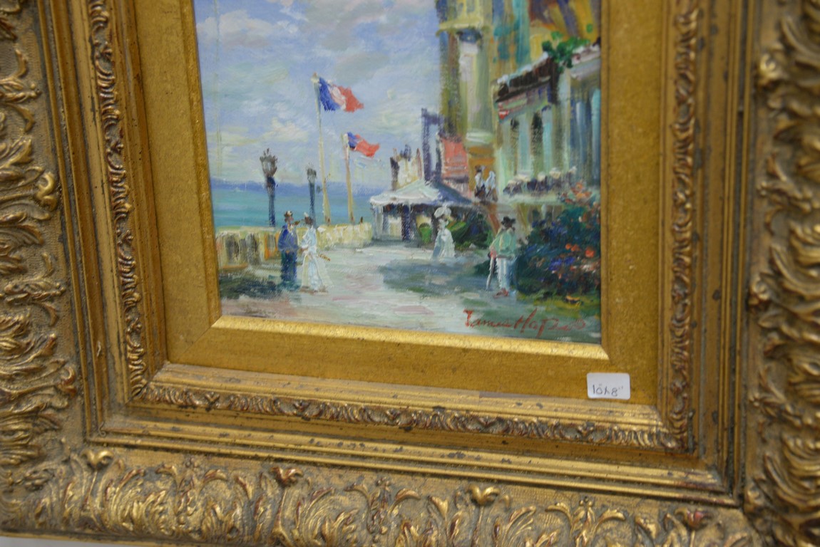 Oil on canvas town on beach edge signed lower right James Hap, 20th century. 10 x 8