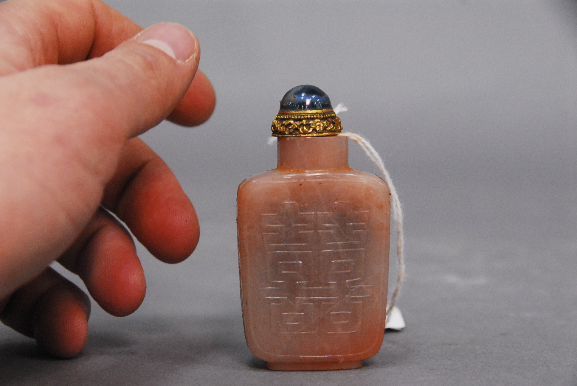 Lot 436: Pink jade carved snuff bottle, one side carved scholar sitting under a tree with three animals, and carved character on the reverse,…