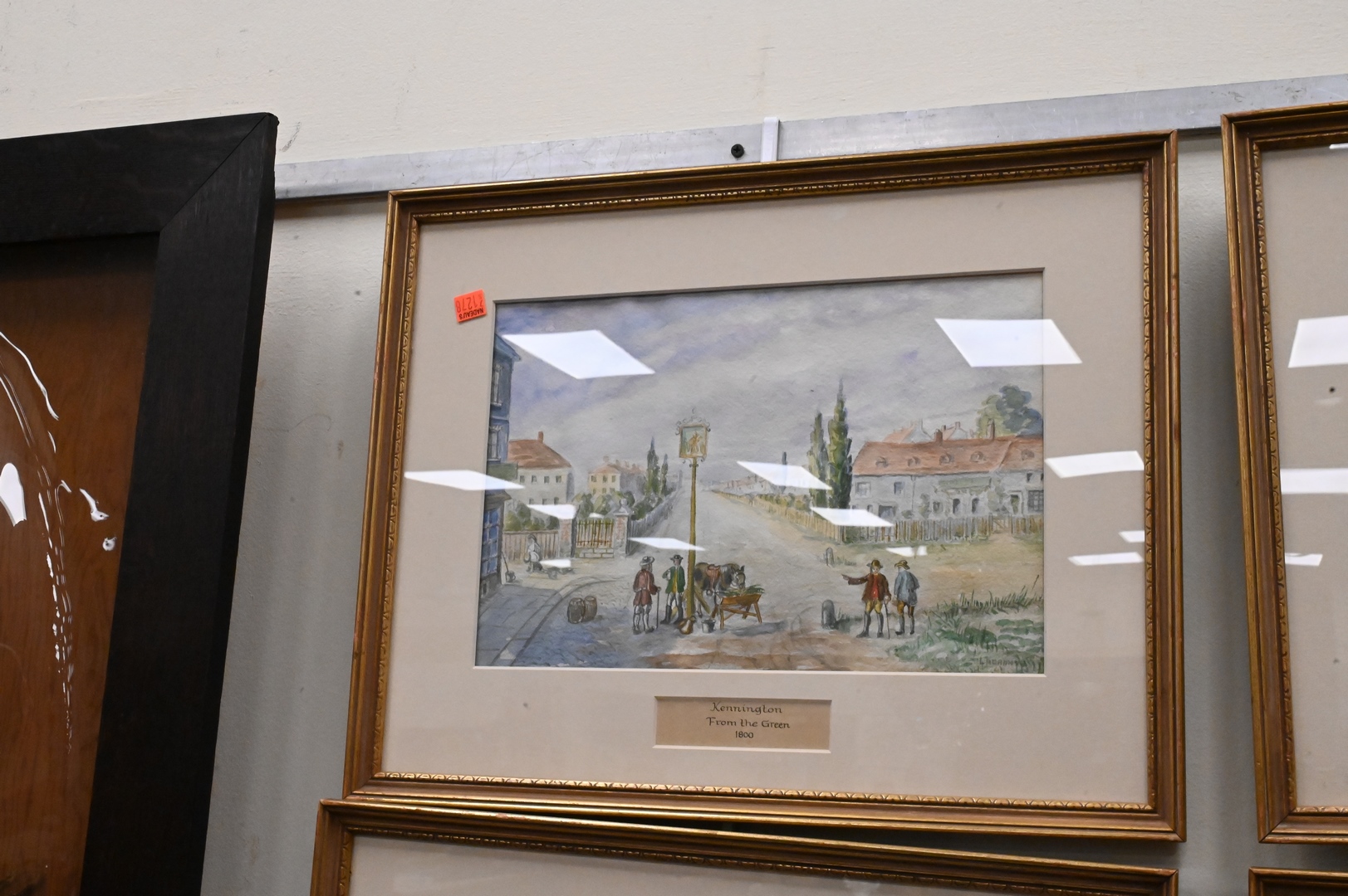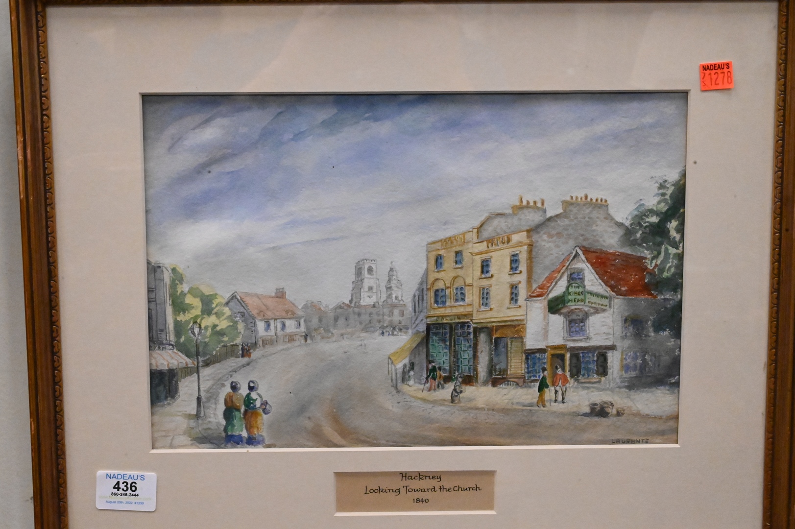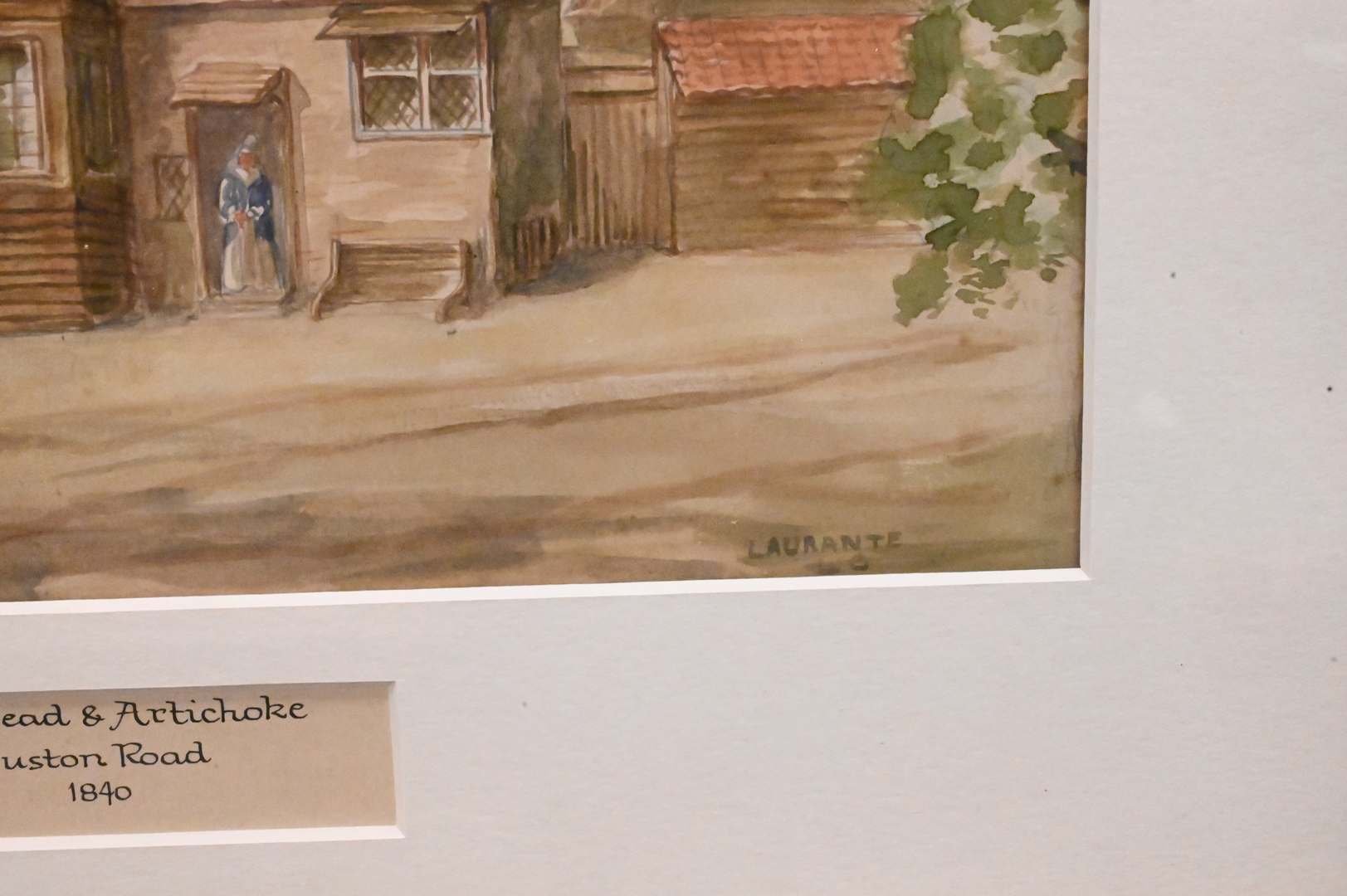 Set of Eight Watercolor Landscapes, all signed “Lauronte” lower left, in matching gilt frames, to include The Old Pack Horse Inn, The Halfway House, Queen Head and Artichoke, Kennington, Hackney, St. Pancras Church, Paddington Churic, along with Cremorne Form; sight sizes 9″ x 13 1/4″, 13 1/4″ x 9″. Provenance: Estate of Peter Tillou, Litchfield, Connecticut.