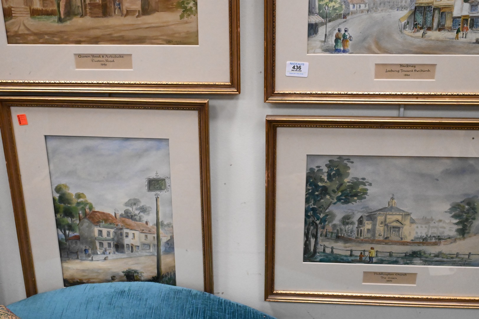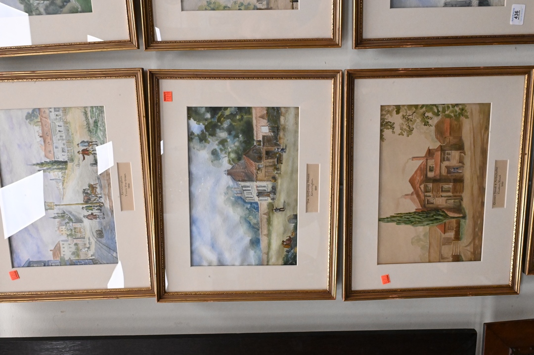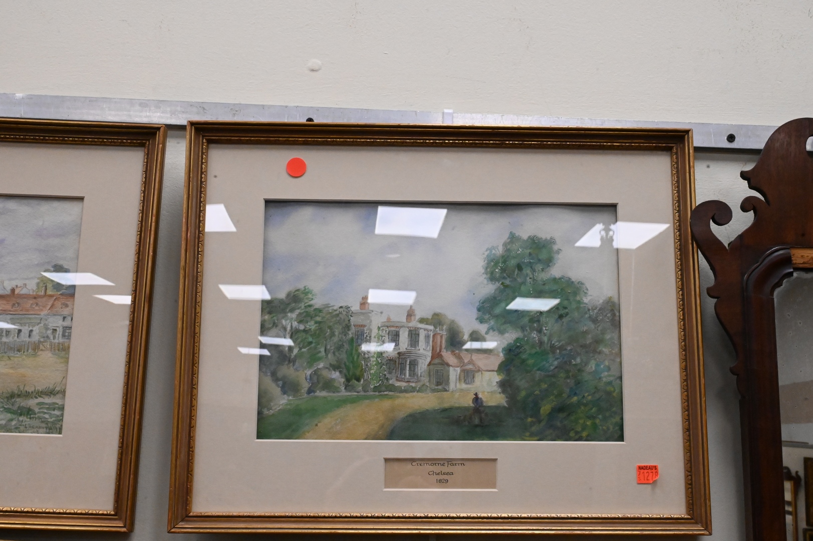 Set of Eight Watercolor Landscapes, all signed “Lauronte” lower left, in matching gilt frames, to include The Old Pack Horse Inn, The Halfway House, Queen Head and Artichoke, Kennington, Hackney, St. Pancras Church, Paddington Churic, along with Cremorne Form; sight sizes 9″ x 13 1/4″, 13 1/4″ x 9″. Provenance: Estate of Peter Tillou, Litchfield, Connecticut.