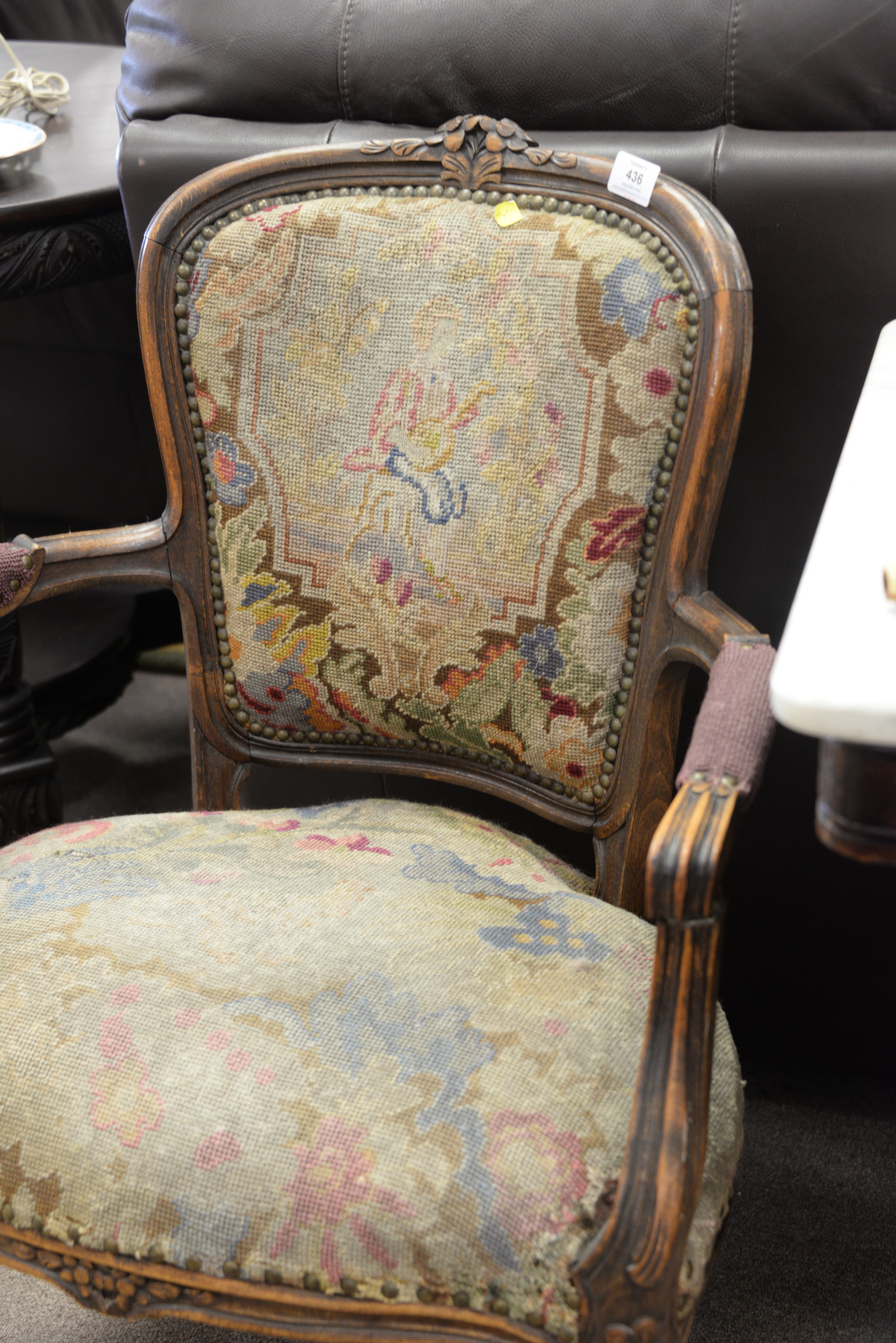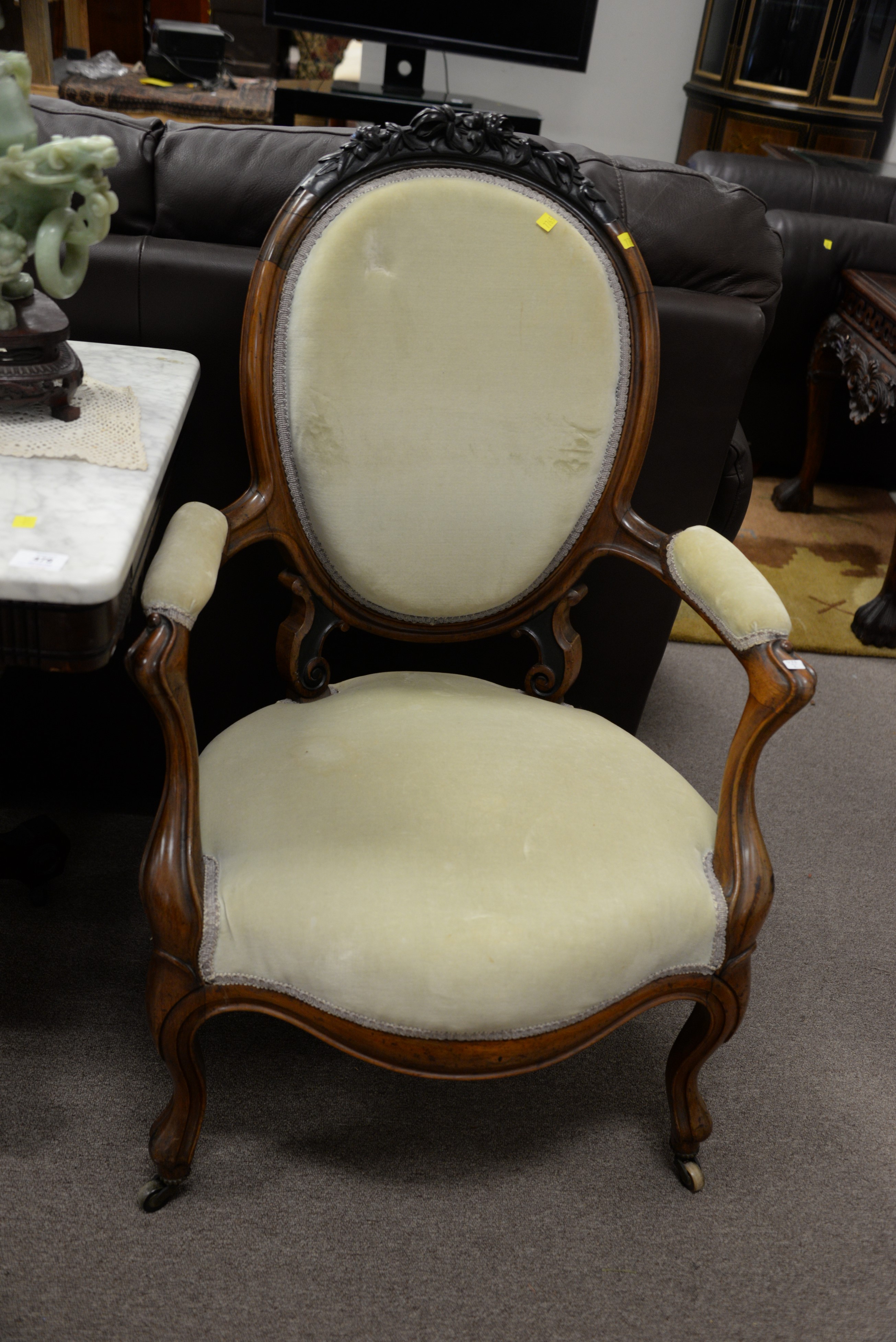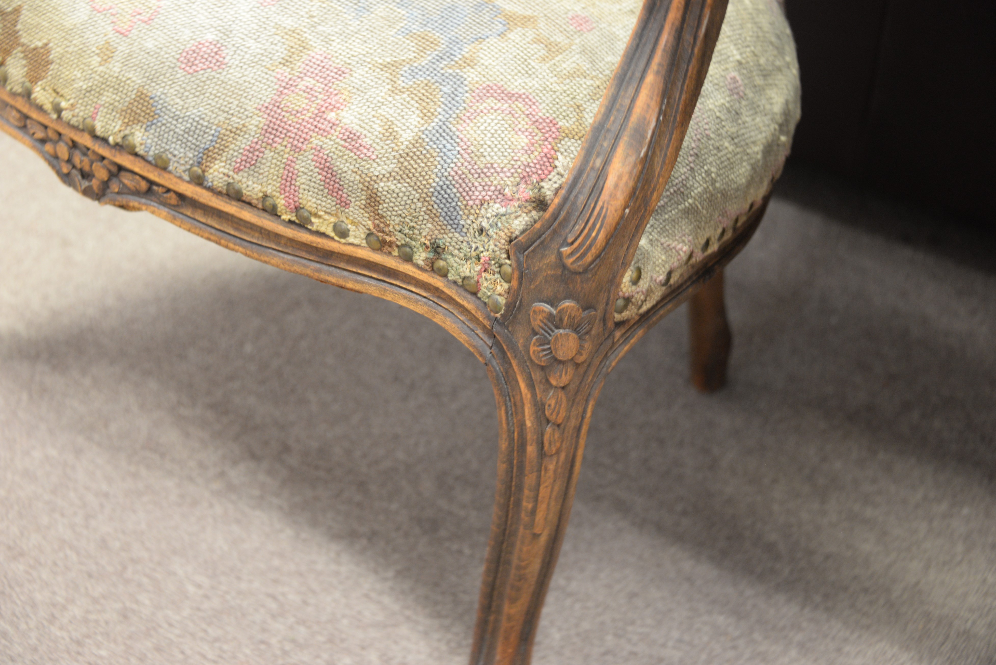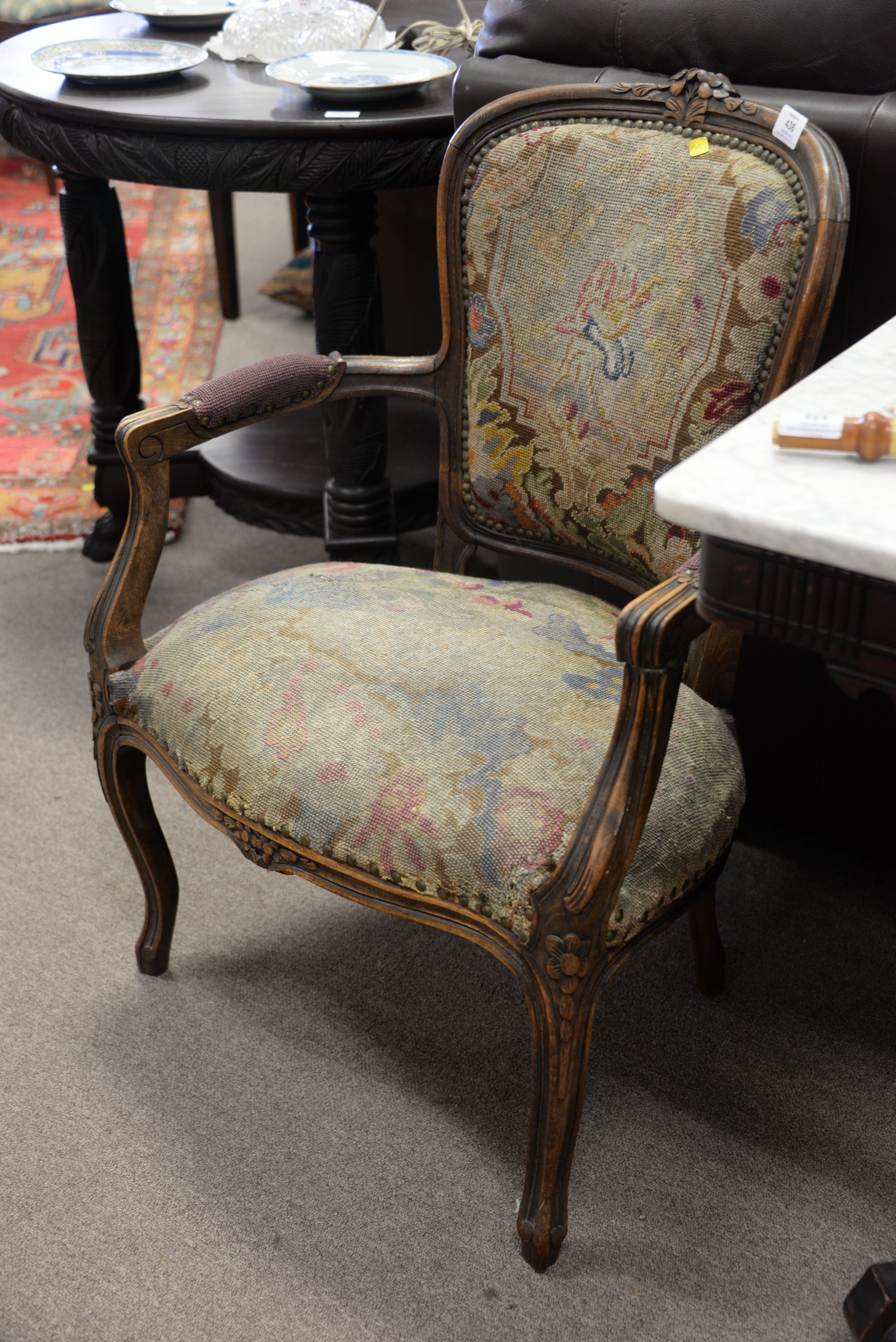 Two armchairs including Victorian walnut gentleman’s chair and a French style armchair.
