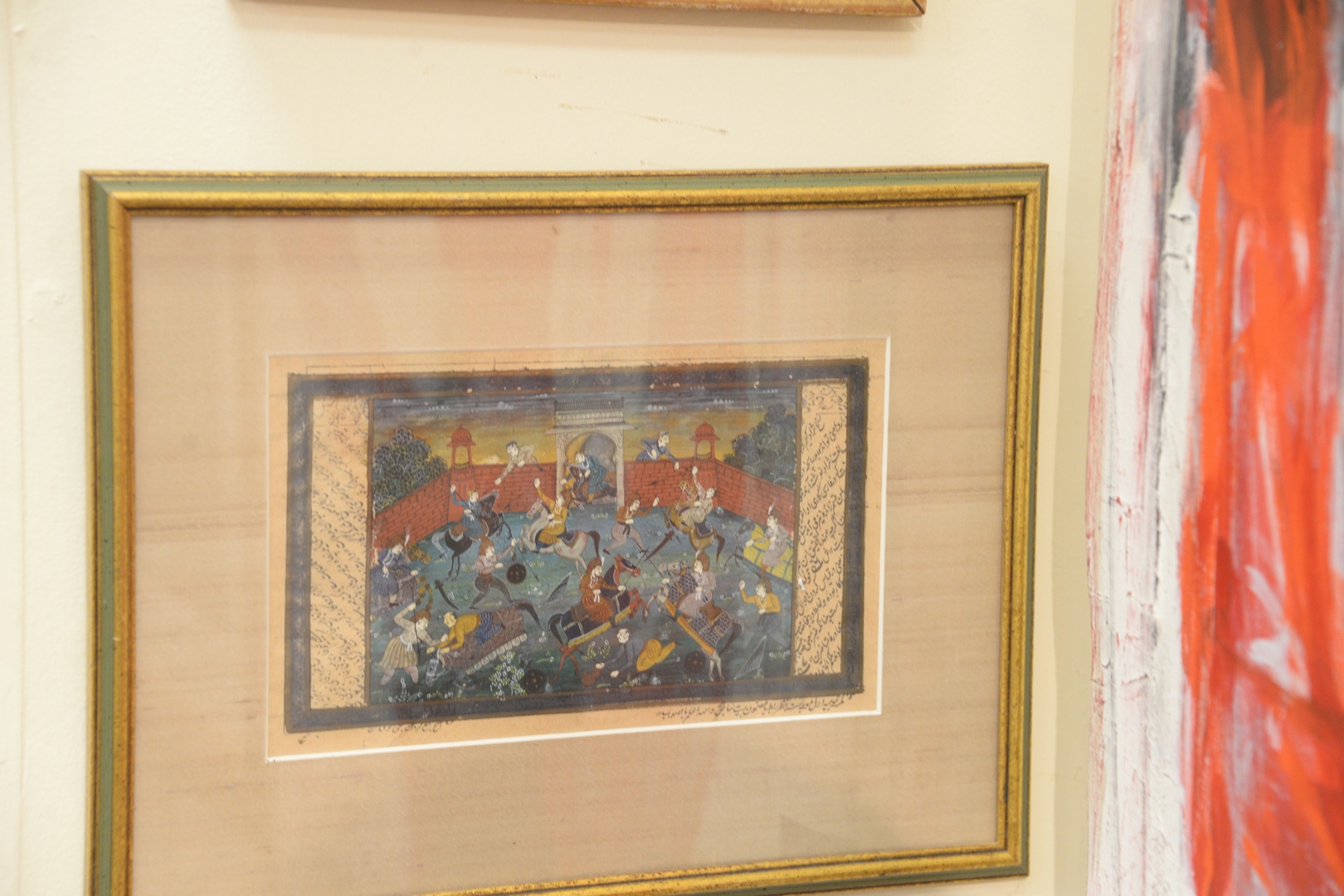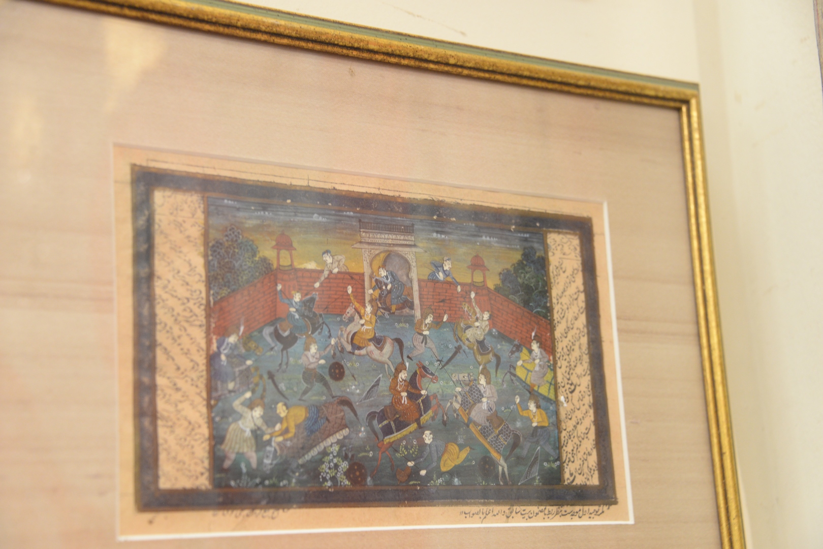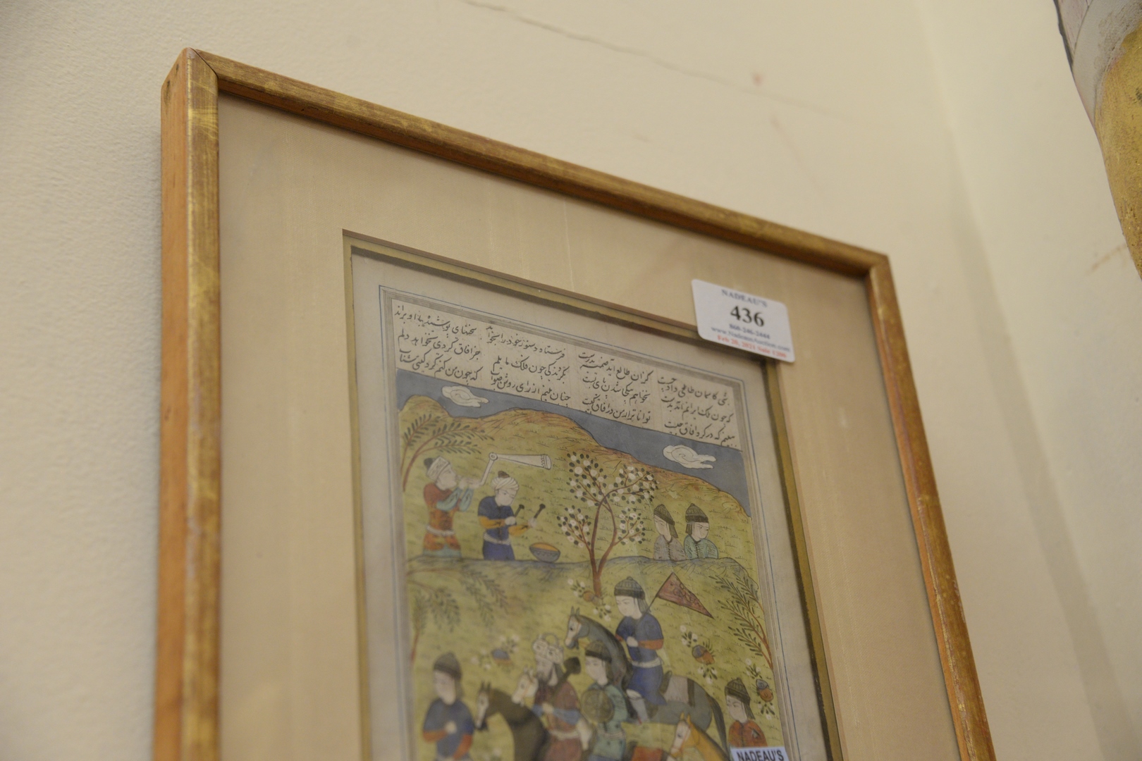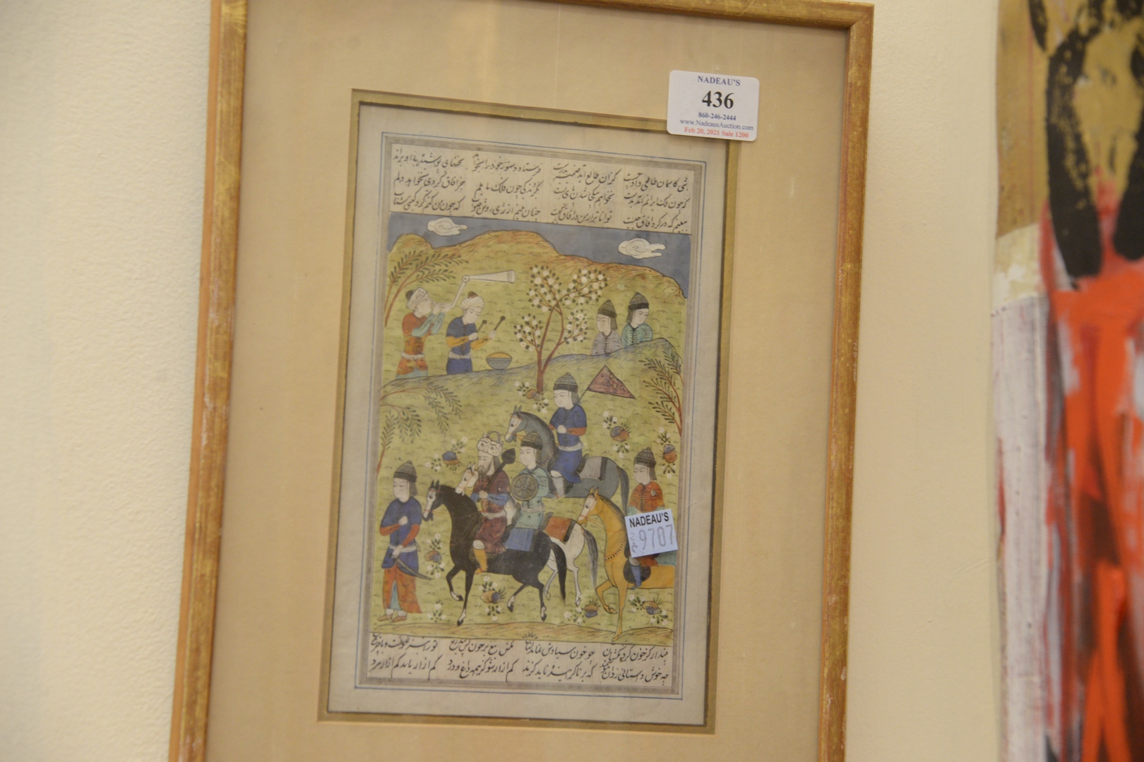 Lot 436: Two Illustrated Manuscripts, on paper, Orientalist scene, having men on horseback, sight size 9 1/4″ x 6″ and 6 x 9 1/4″. Provenance: The Estate of Alan Gans, Mulberry Point, Guilford.