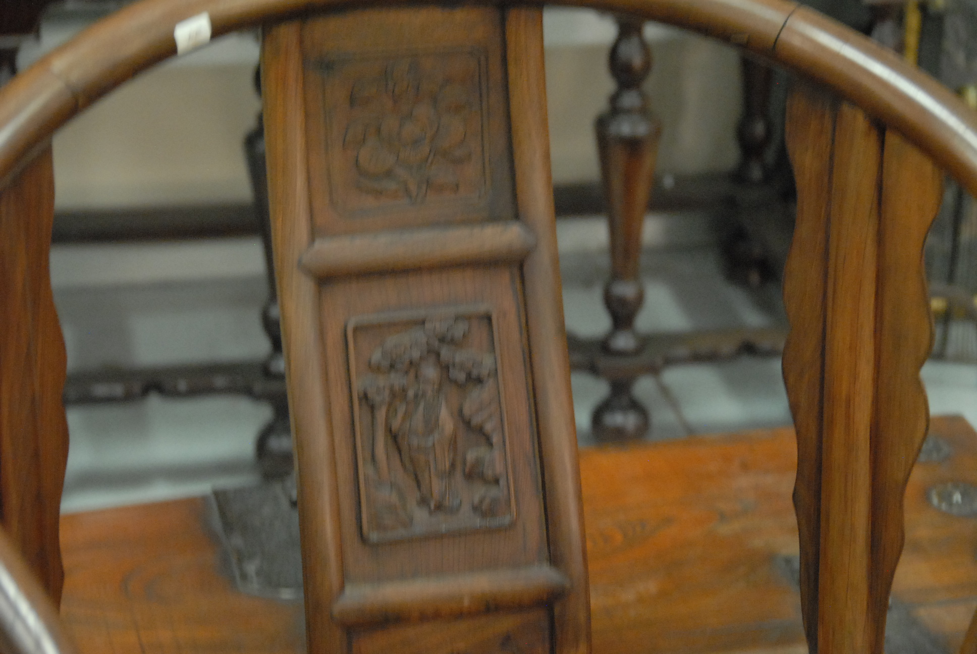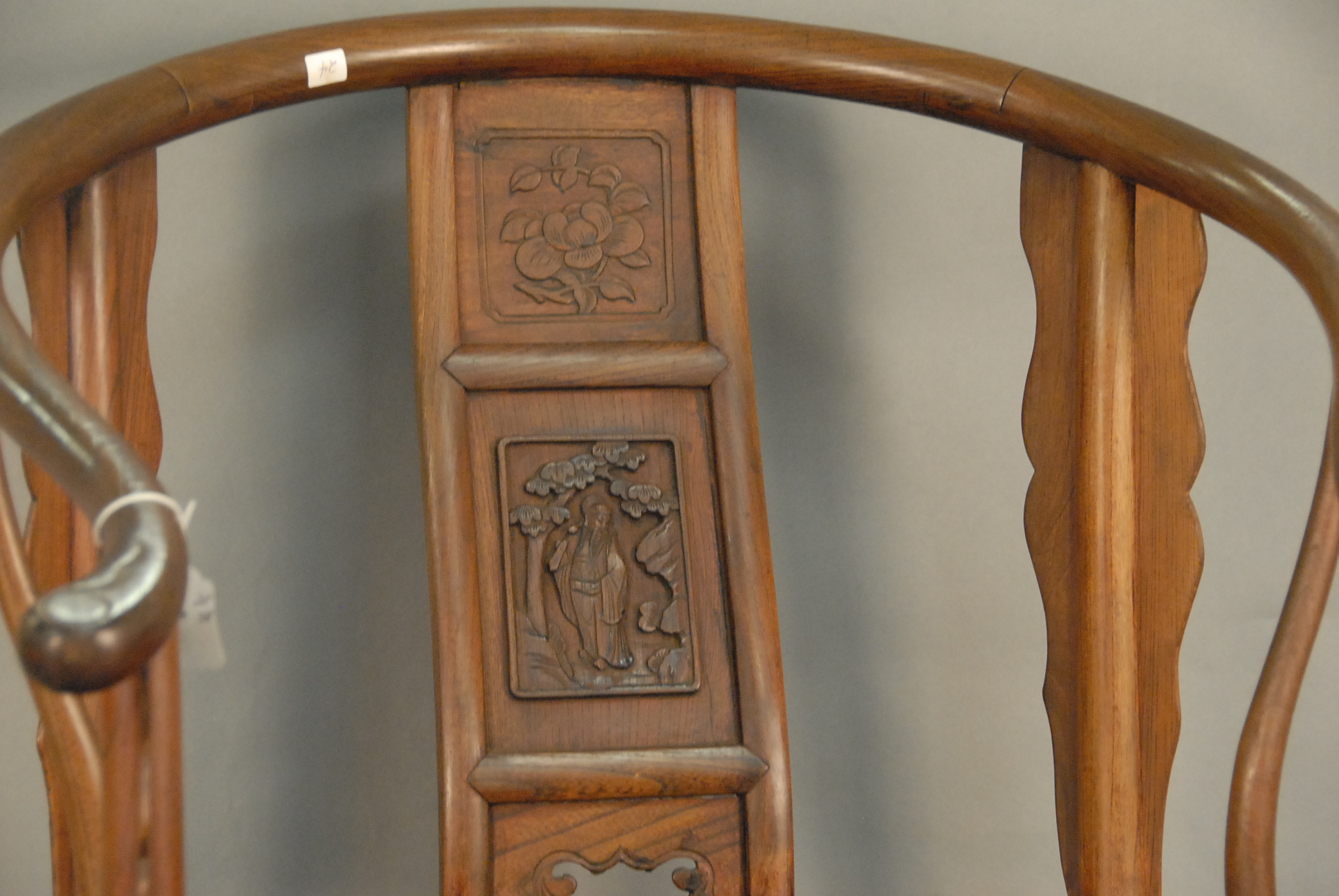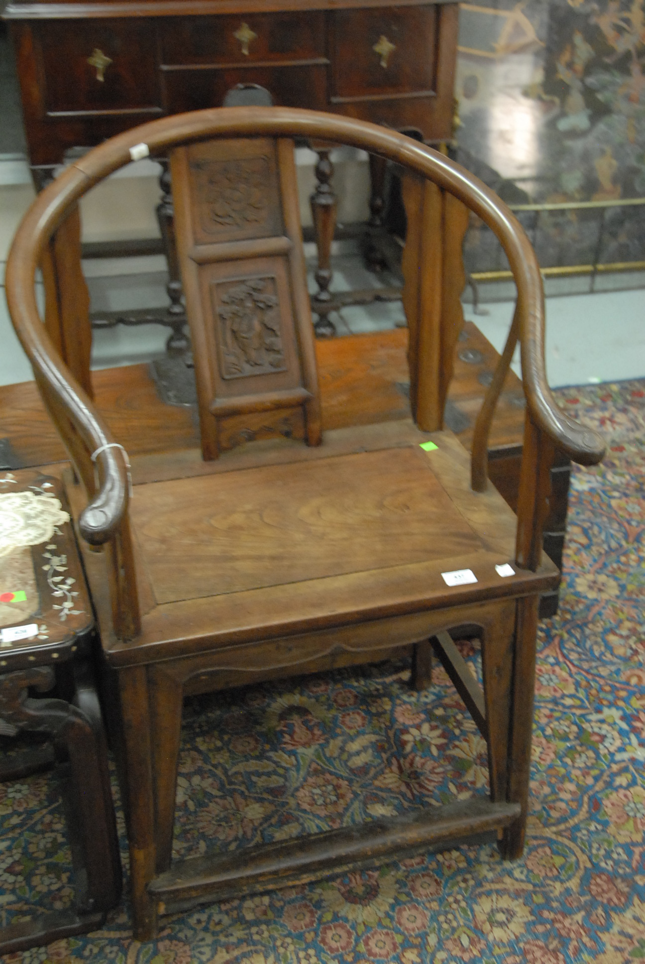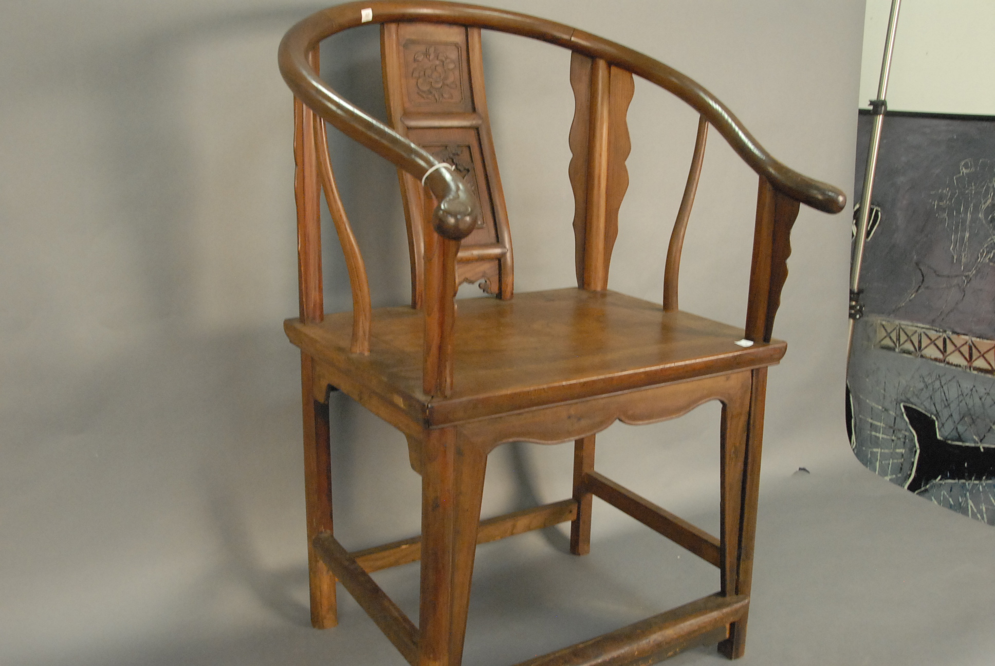 Lot 437: Eighteenth century Chinese horseshoe back armchair with cyma curved carved and paneled back splat, paneled seat, set on carved and turned legs connected by box stretcher in an exotic hardwood, ht. 38in.