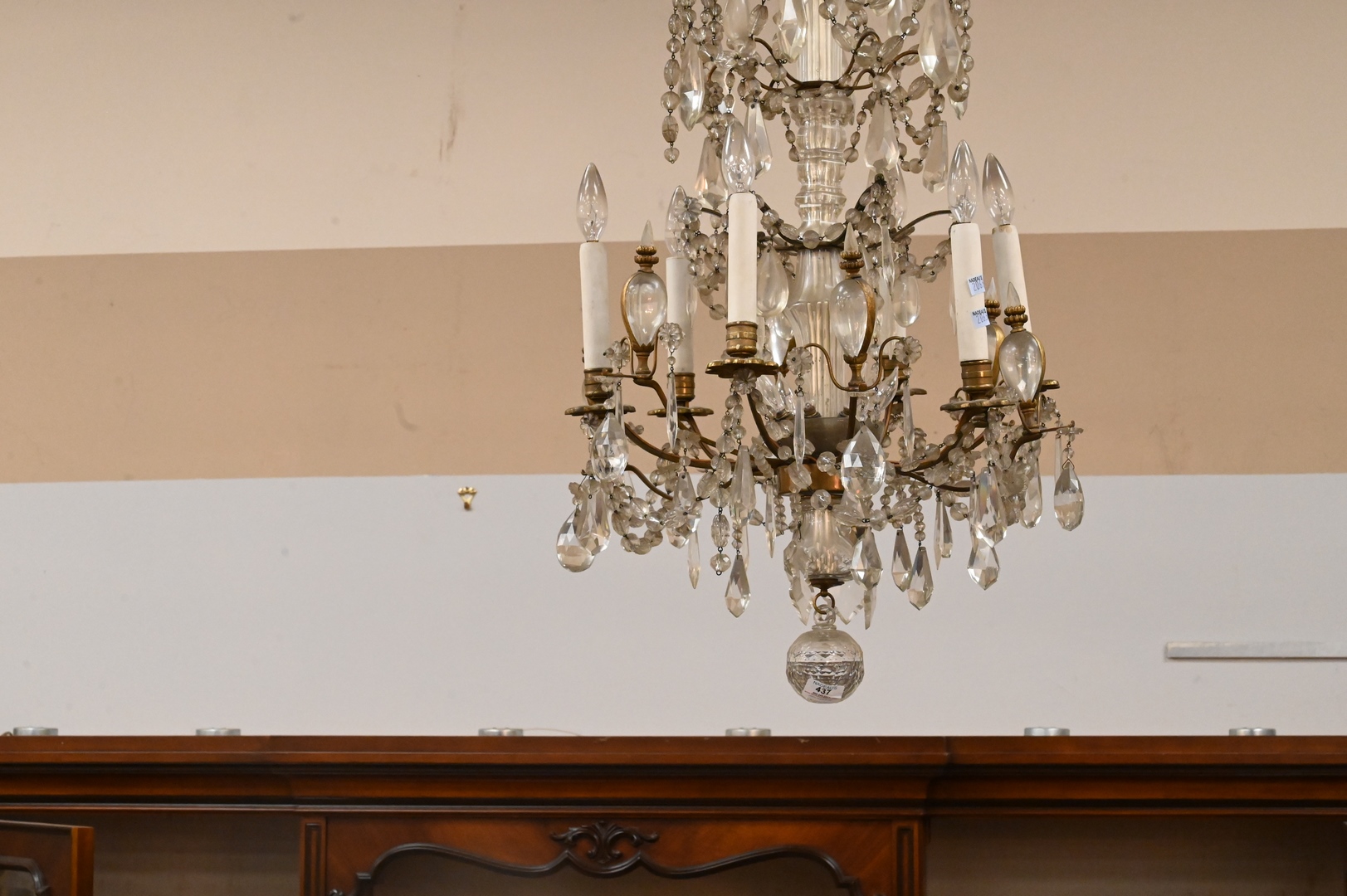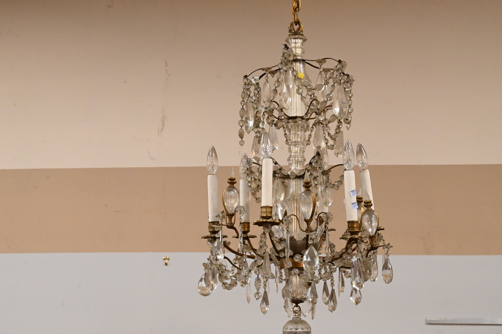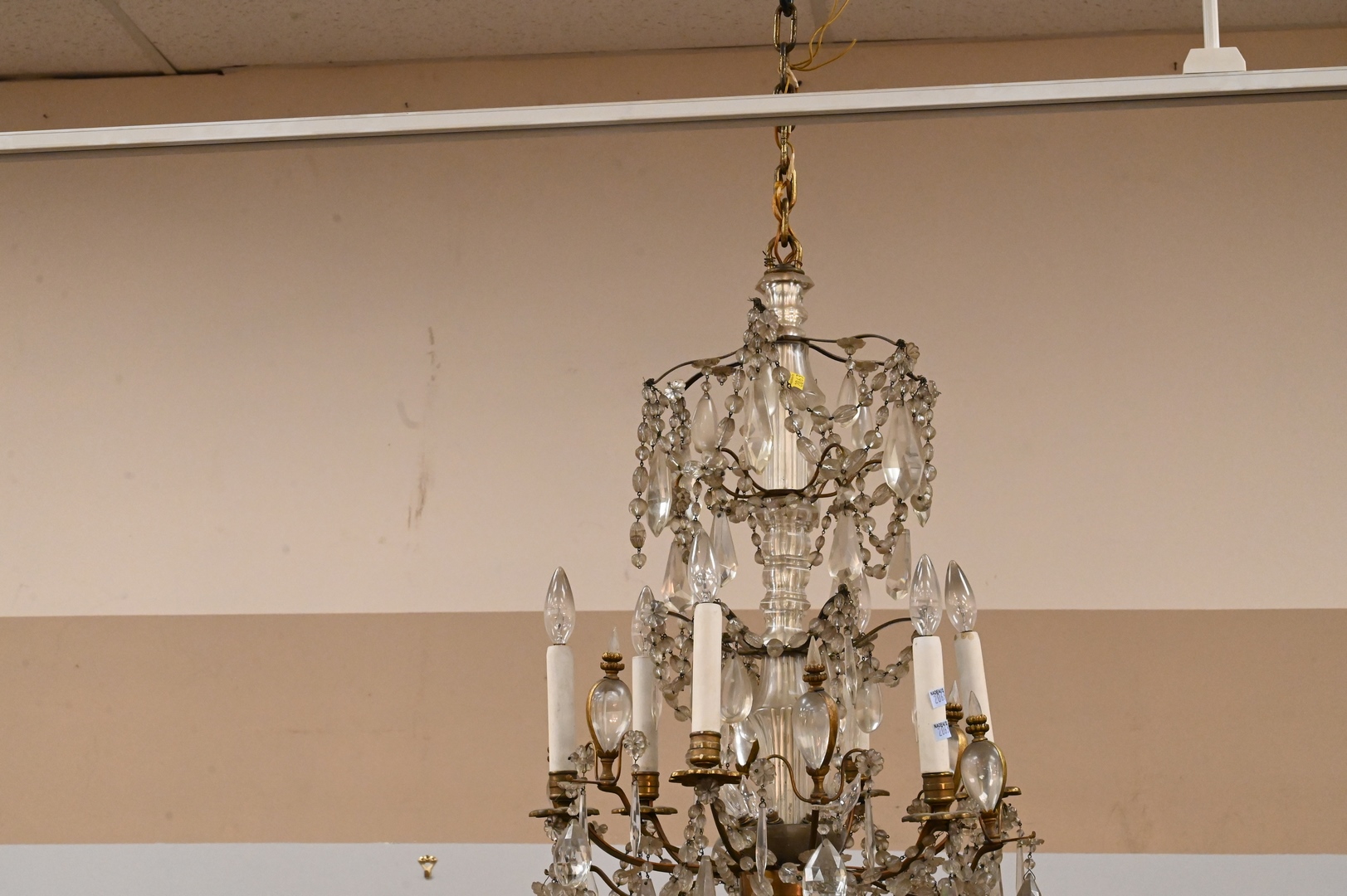 Hanging Chandelier with Six Lights having six arms with prisms, interior shaft having an additional eight small lights approximate height of 32 inches, diameter 20 inches