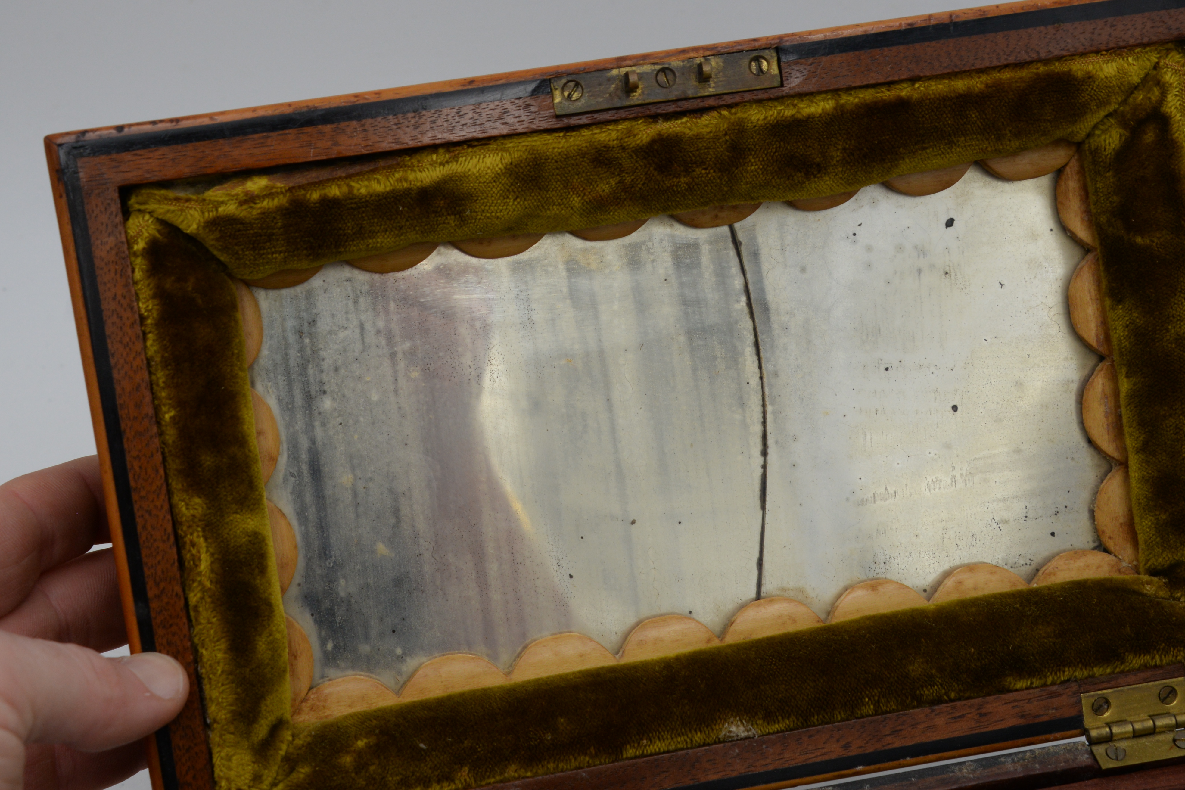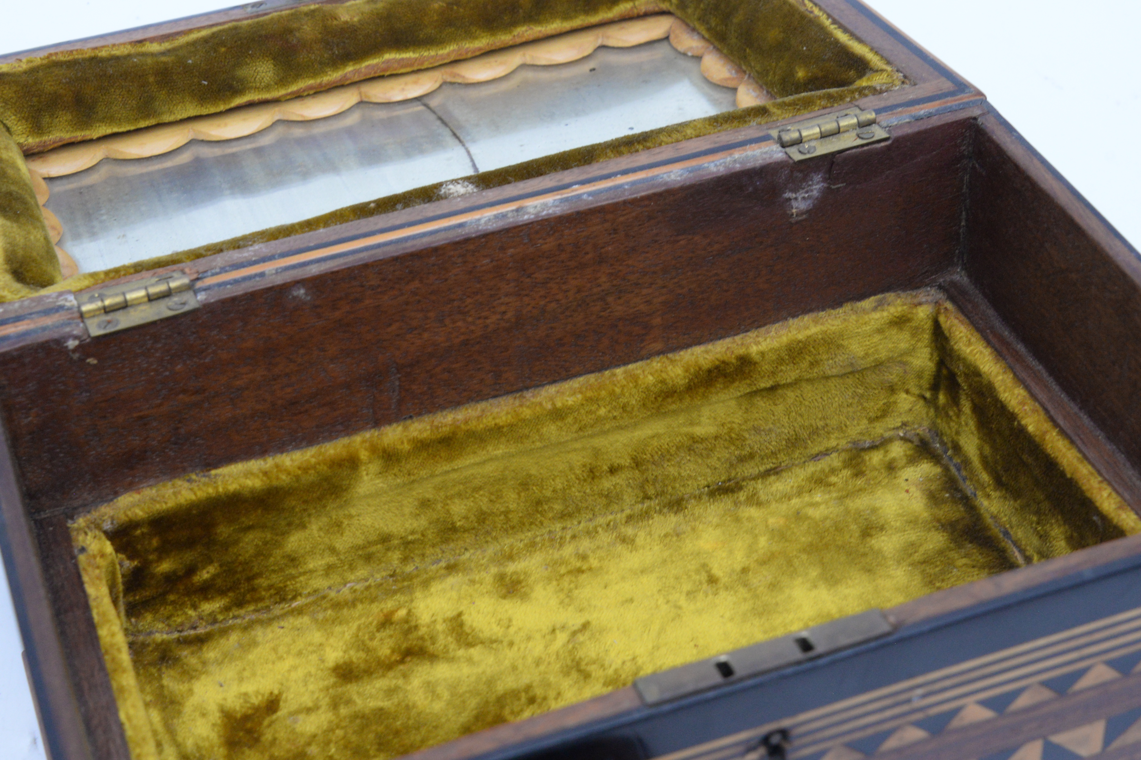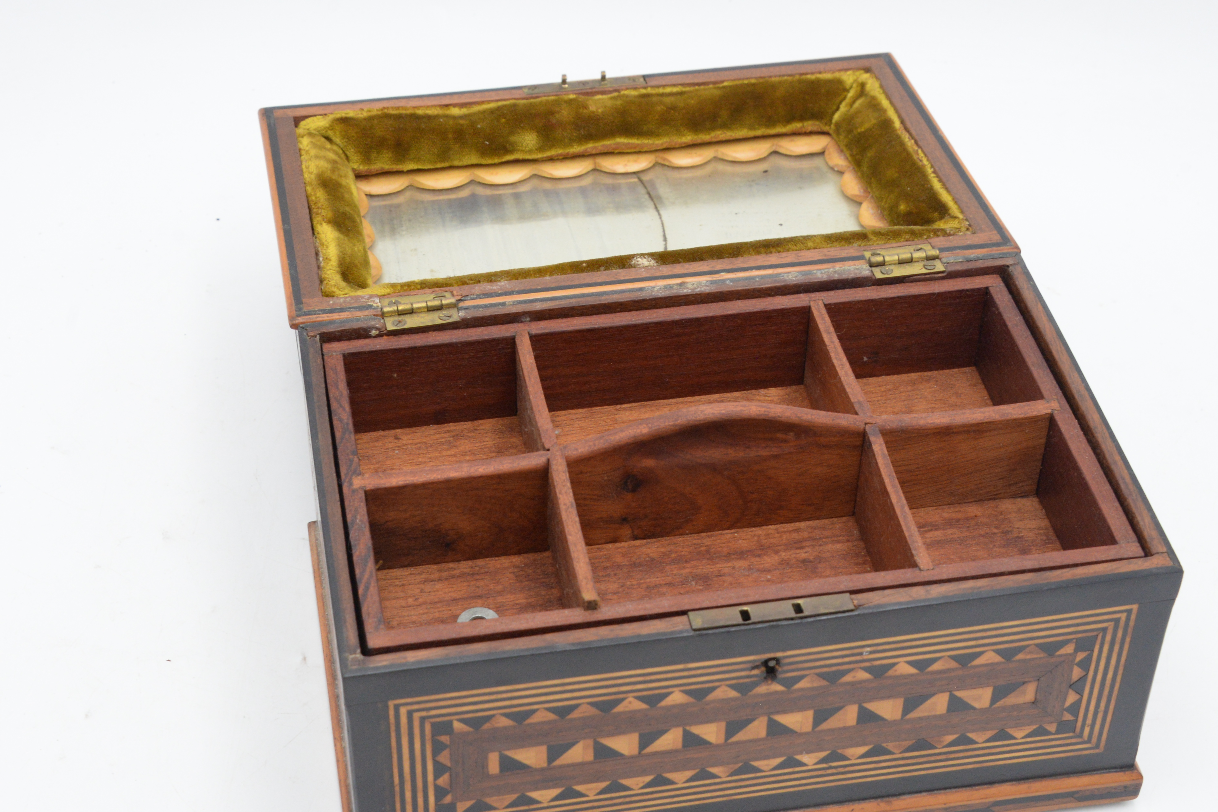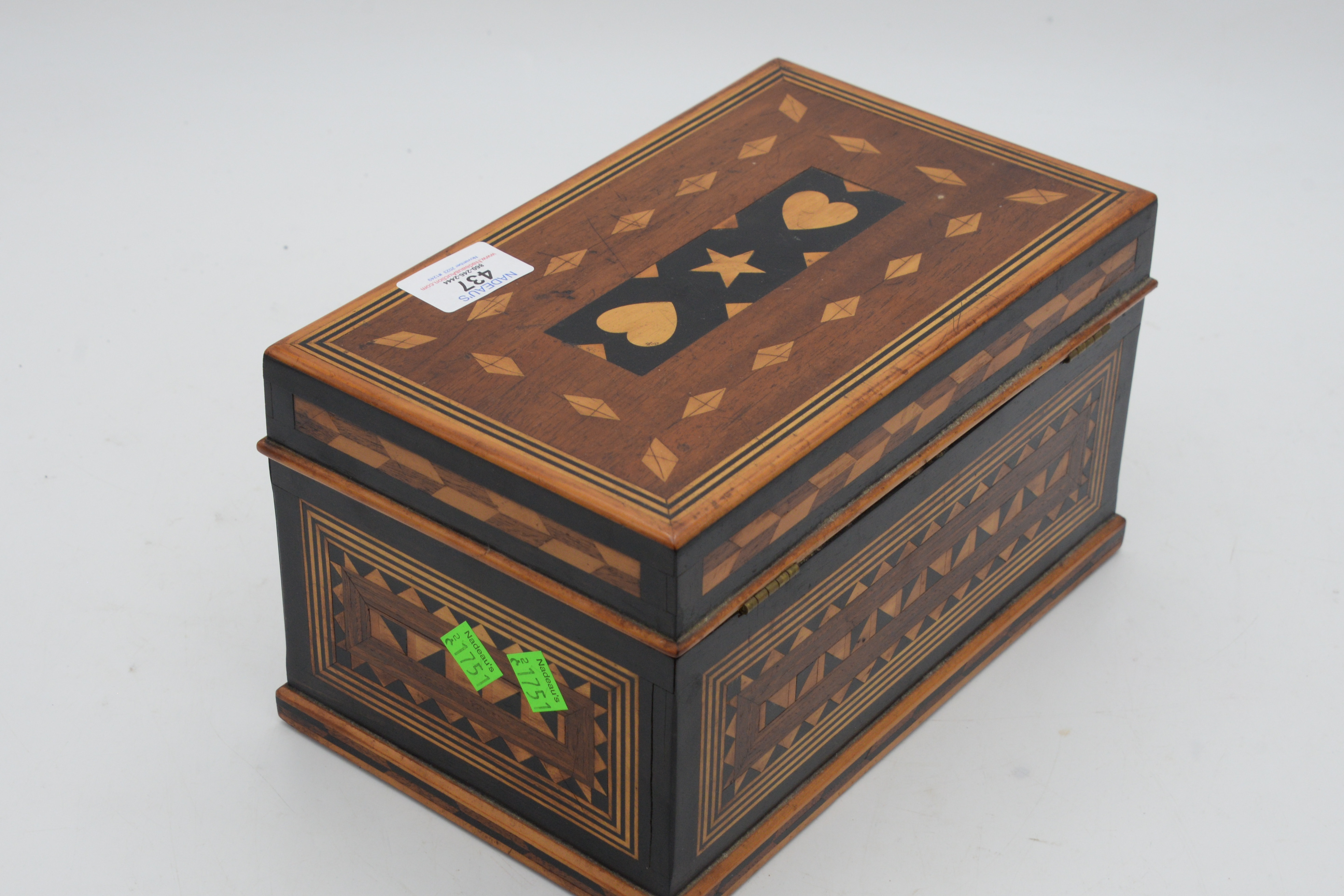 InlaiInlaid Lift Top Jewel Box Top with ebonized wood, hearts, and diamonds Interior with tray and mirrors, four sides with ebonized wood and geometric designs Height 6″, top 6 1/4″ x 10 1/4″
