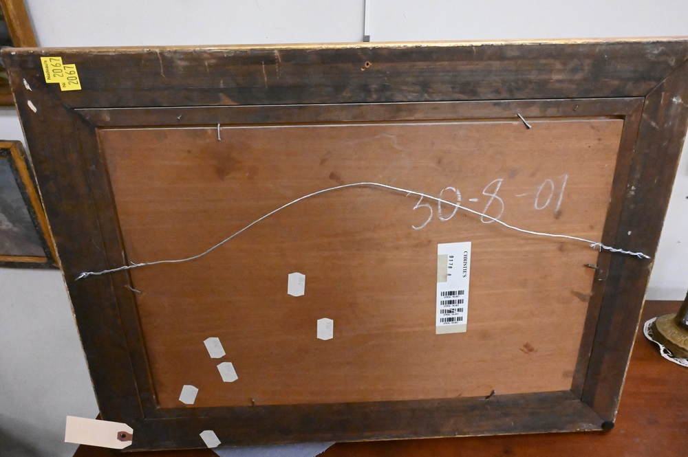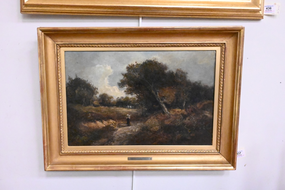 Lot 437: Joseph Thors (1843 – 1898), gatherer on a woodland path, signed lower left and reverse, oil on panel, sight size 11 5/8″ x 17 3/4″. Provenance: Christie’s South Kensington, sale #9178, 8/30/01, Lot 216.