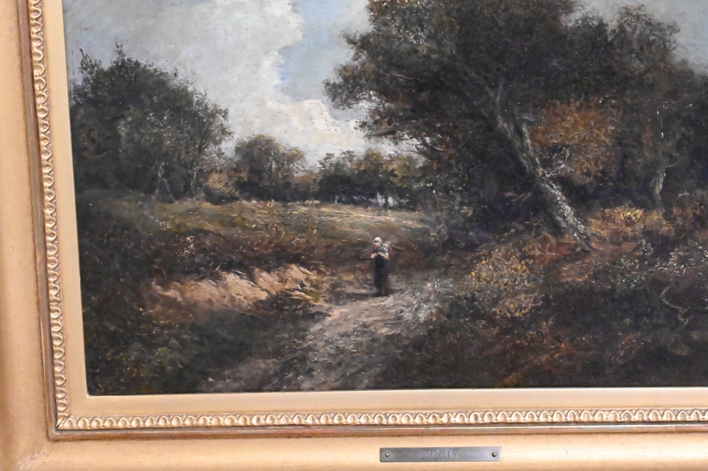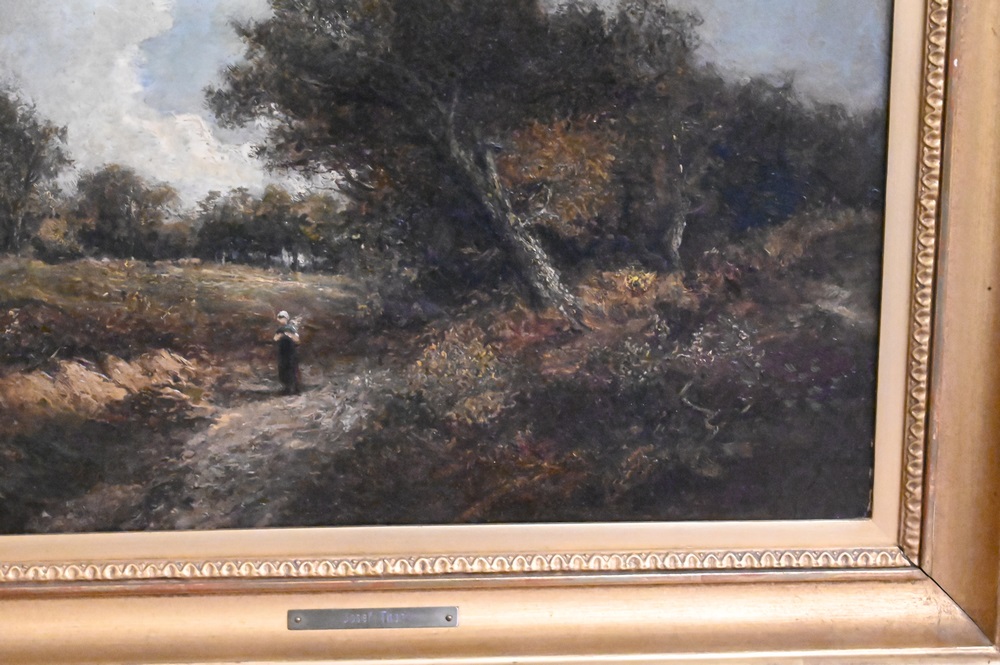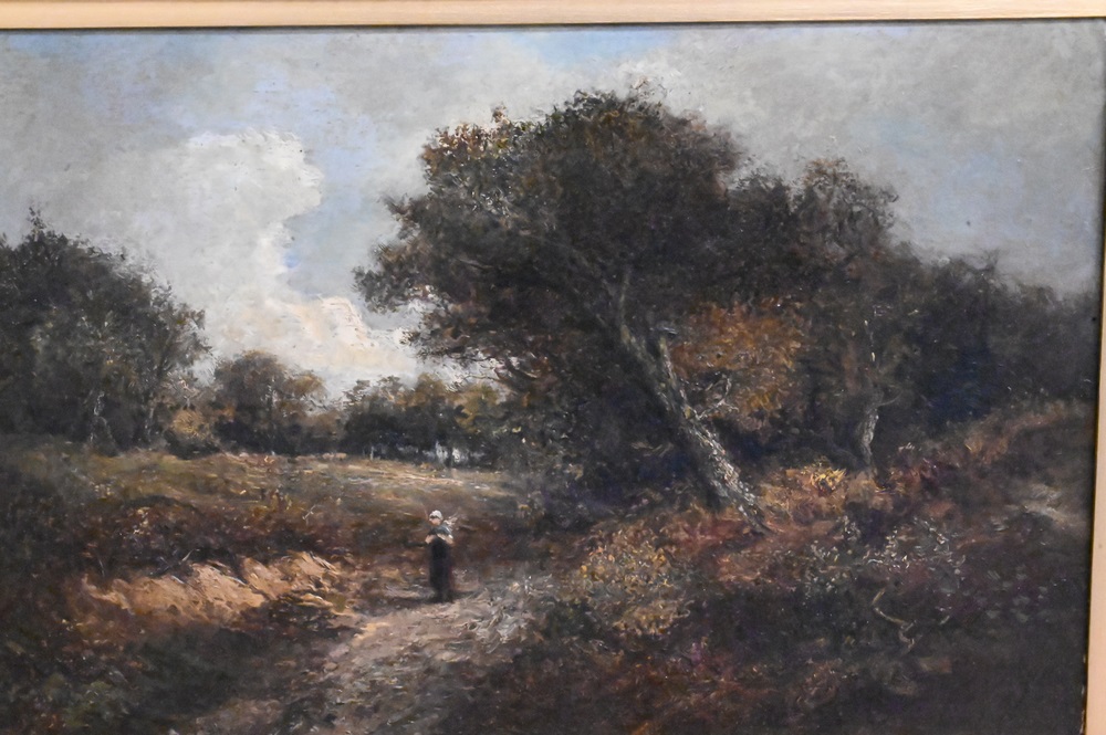 Joseph Thors (1843 – 1898), gatherer on a woodland path, signed lower left and reverse, oil on panel, sight size 11 5/8″ x 17 3/4″. Provenance: Christie’s South Kensington, sale #9178, 8/30/01, Lot 216.