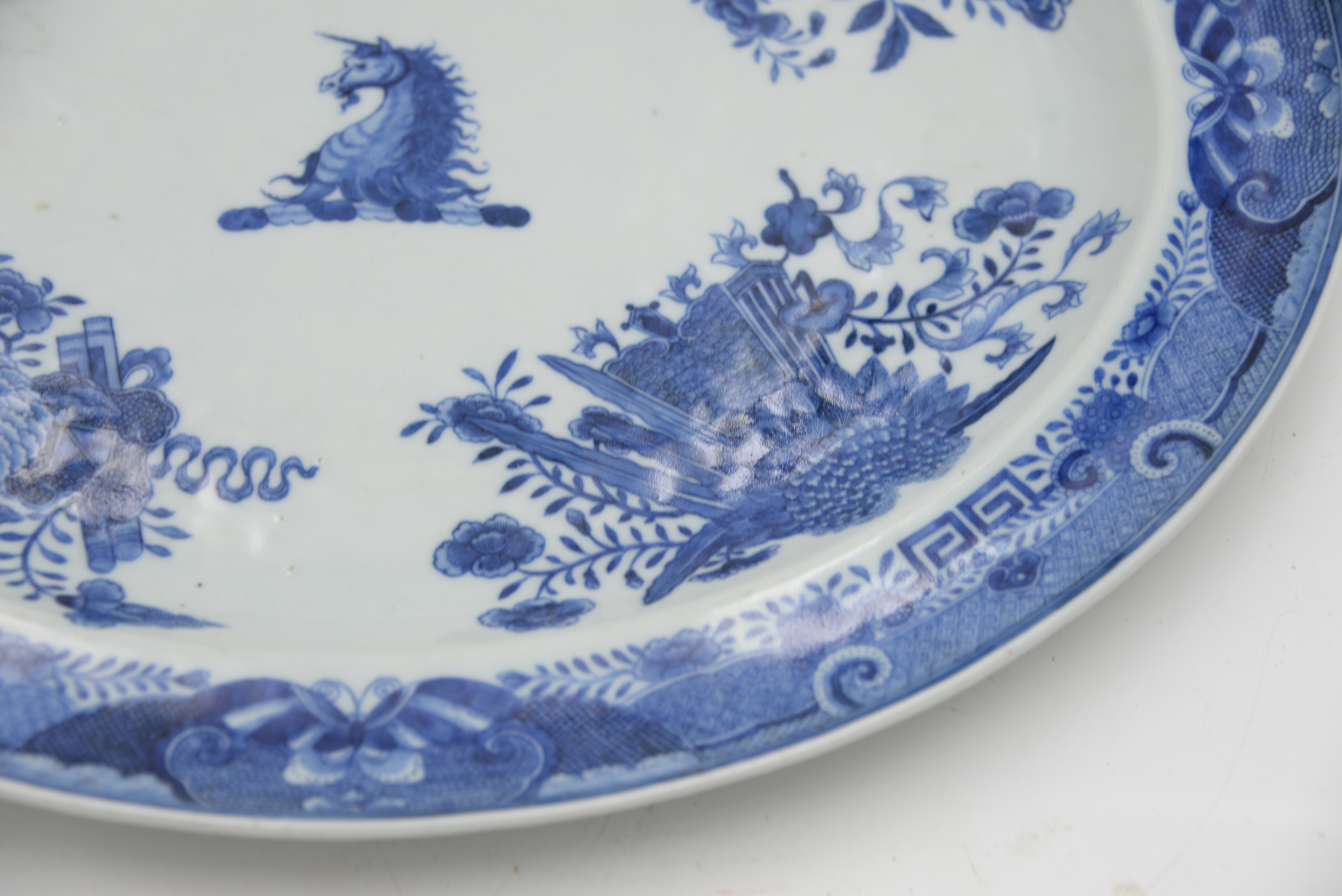 Large Chinese Export Porcelain Blue and White Oval Platter, painted in the center with unicorn’s armorial crest of Beale within a “Fitzhugh” pattern of four clusters of flowers and precious objects, the rim having a border of patterned panels, length 17 3/8 inches.