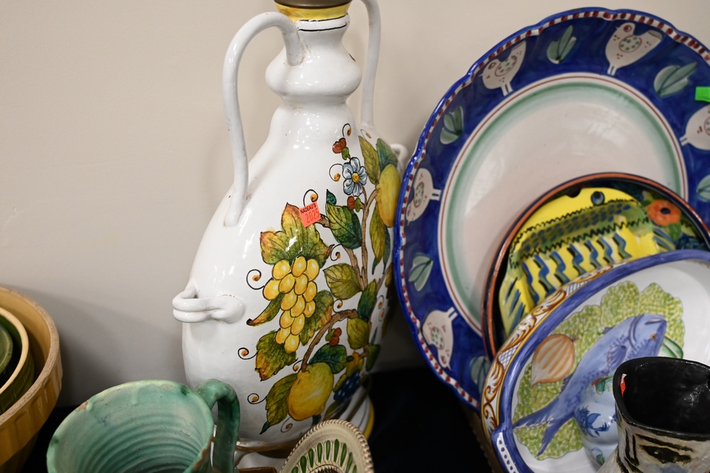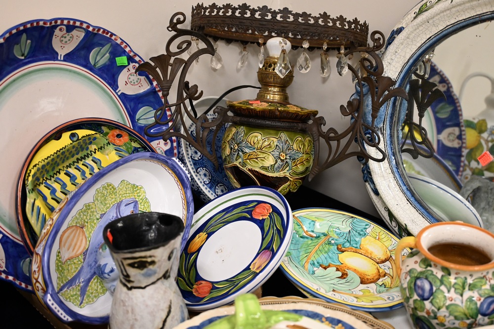 Lot 437: Large Group Lot of Italian and Italian Style Majolica Pottery, to include an oval wall mirror, a table lamp, several decorative platters, bowls, pitchers, vessels, many signed and marked “Italy” or “Portugal” to the underside, along with 16th/17th century charger with winged figure, etc., mirror height 28 inches. Provenance: Waterfront Estate, Stamford, CT.
