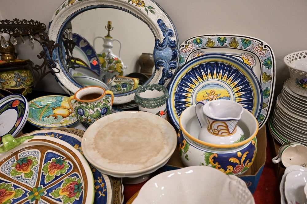 Large Group Lot of Italian and Italian Style Majolica Pottery, to include an oval wall mirror, a table lamp, several decorative plat…