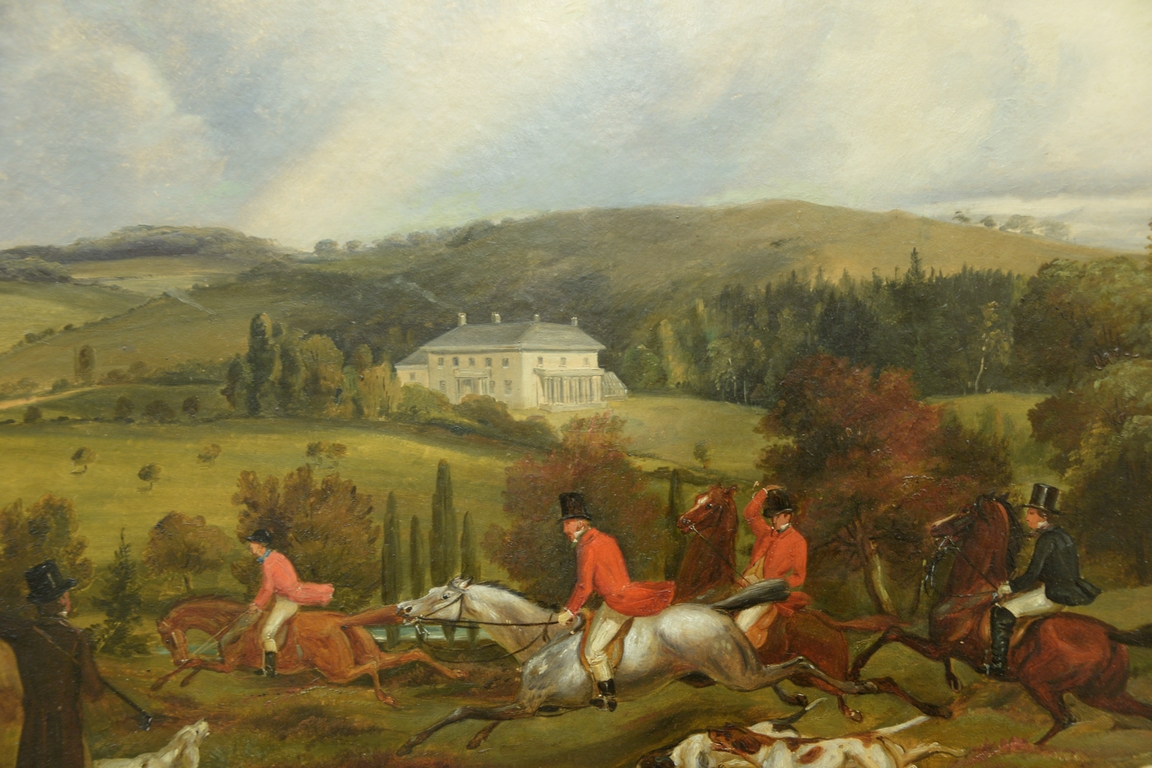 Oil on board 19th century Foxhunt Landscape, unsigned, 19 x 25 1/4.