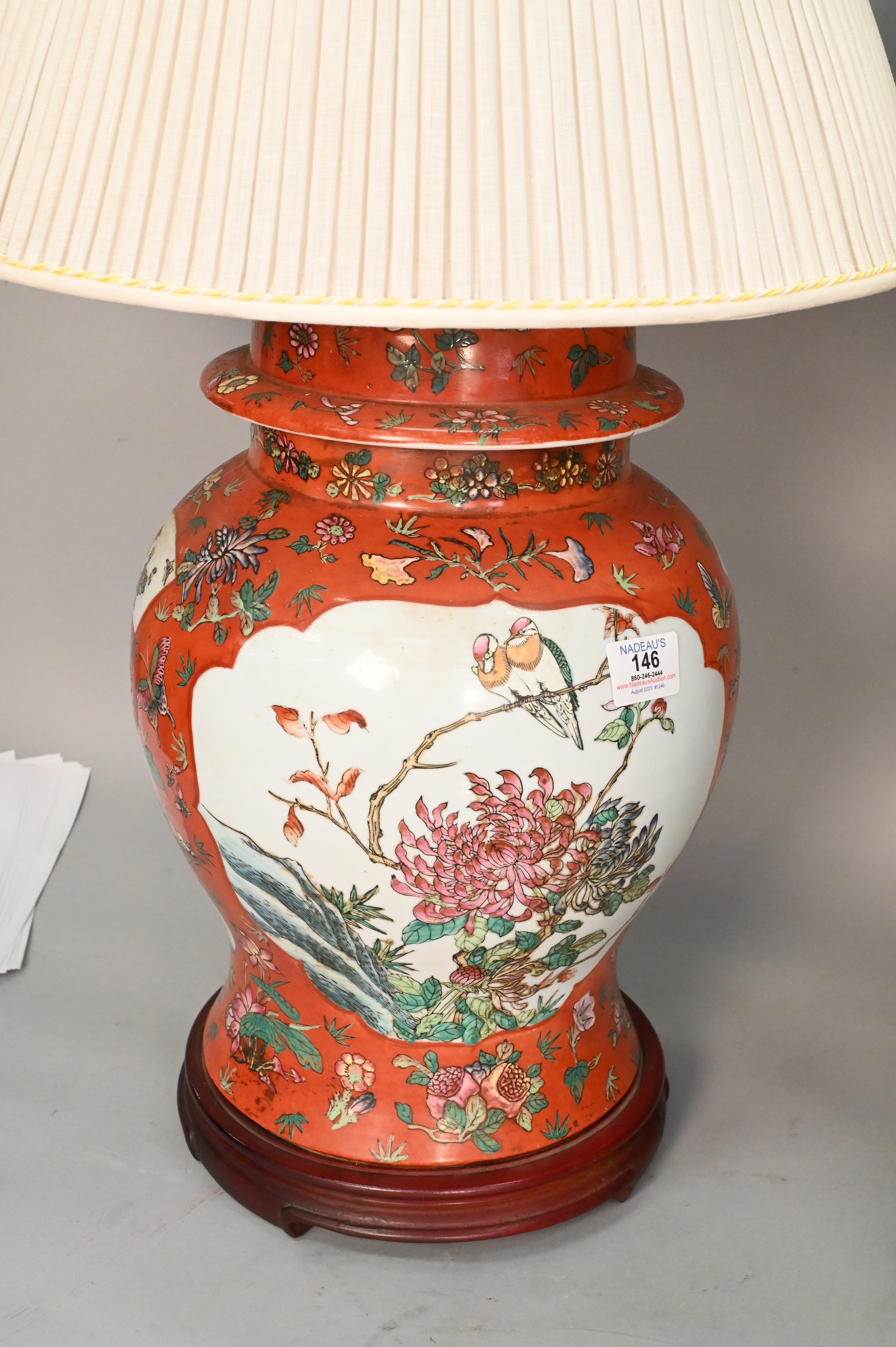 Pair of Chinese Porcelain Jars, iron red with painted flowers, made into table lamps, 16 inches tall.