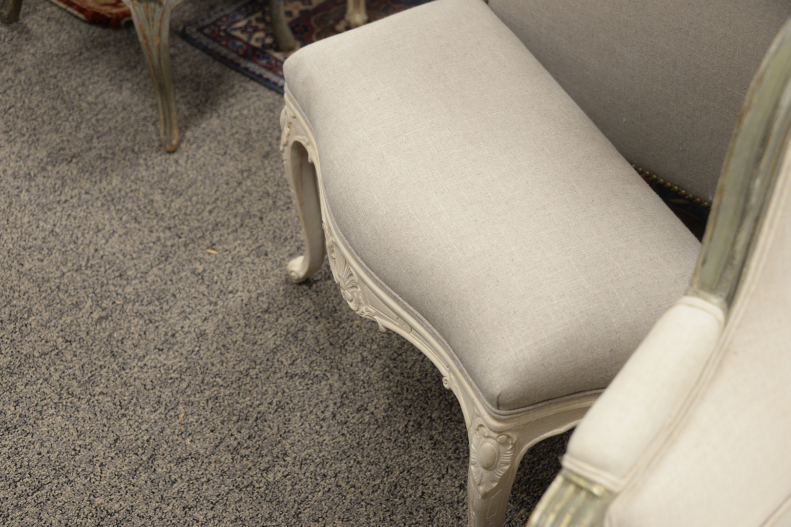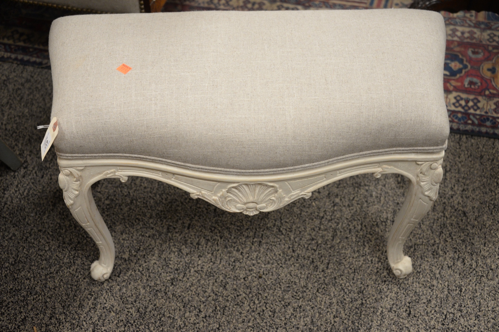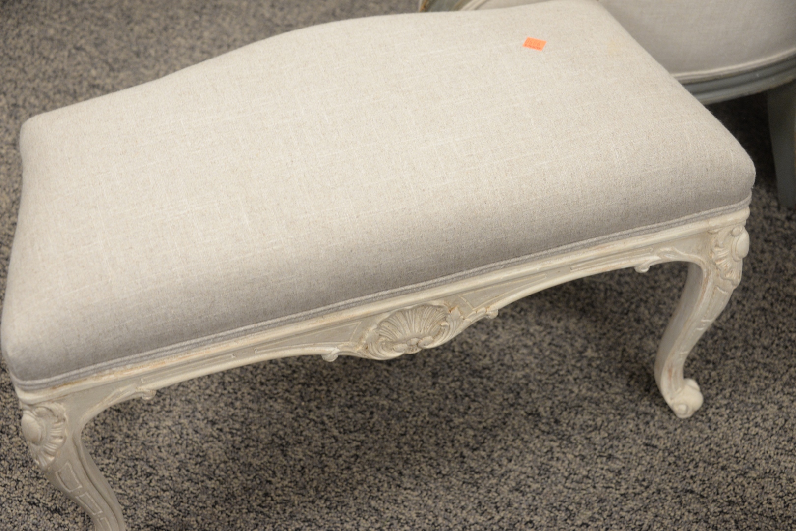 Pair of Louis XV Style Upholstered Footstools, height 17 inches, width 28 inches.