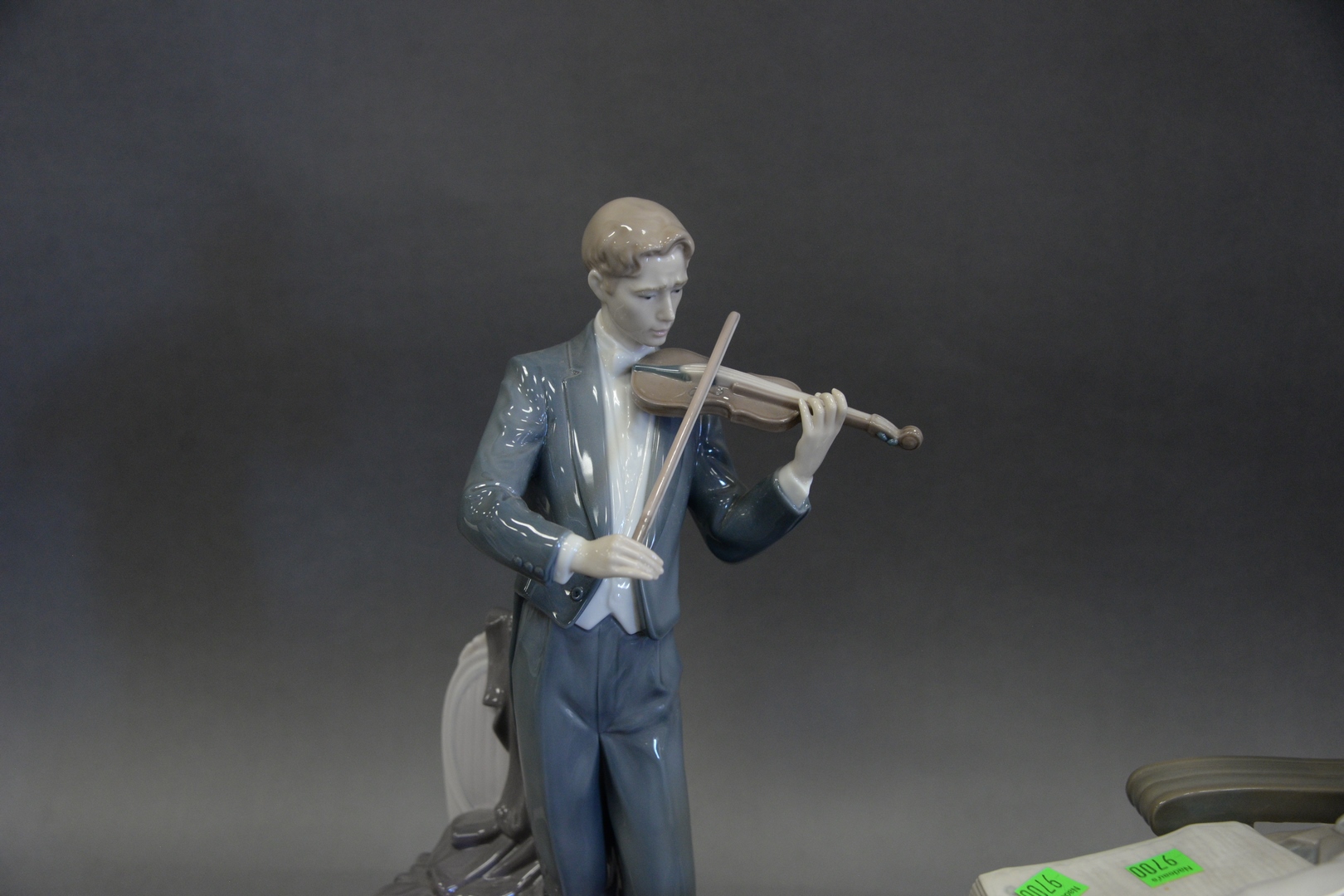 Two Large Lladro Porcelain Figures, to include Don Quixote with a sword, along with a violin player, both marked to the underside, height 16 1/2 inches. Provenance: Estate of James Wadhams