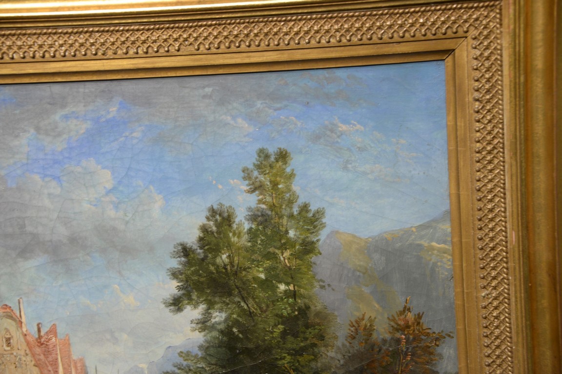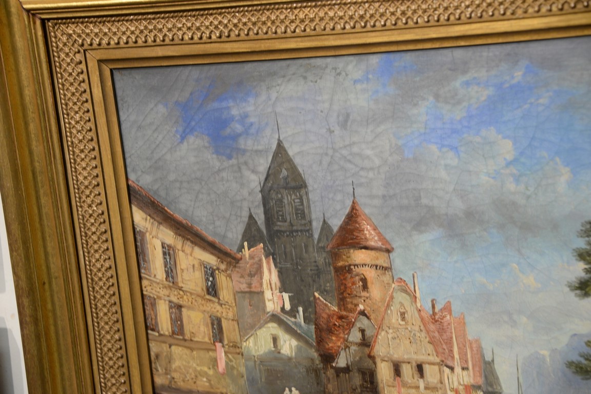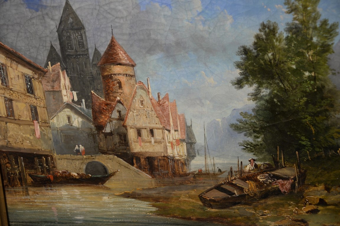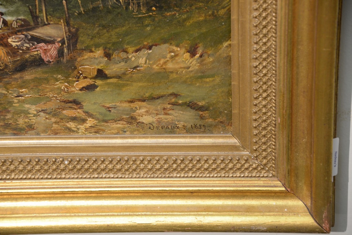 Lot 438: Alexandre Defaux 1826-1900, oil on canvas, Town Scene on Water’s Edge with Figures, signed lower right: Defaux 1859, relined, 17 1…