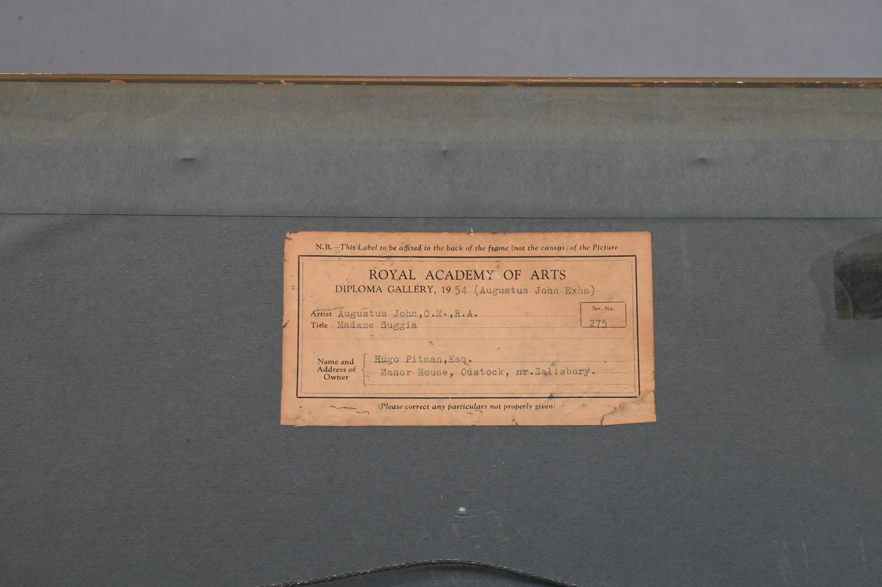 Exhibited: Royal Academy of Arts, London, Diploma Gallery, Augustus John Exhibition, 1954, number 275