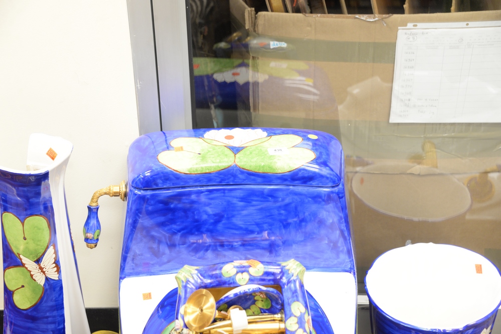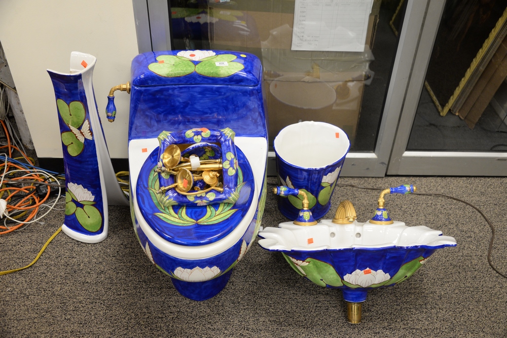 Lot 438: Custom Bathroom Set, having water lily and butterfly decoration to include bathroom fixtures, waste paper basket, scallop sink with …