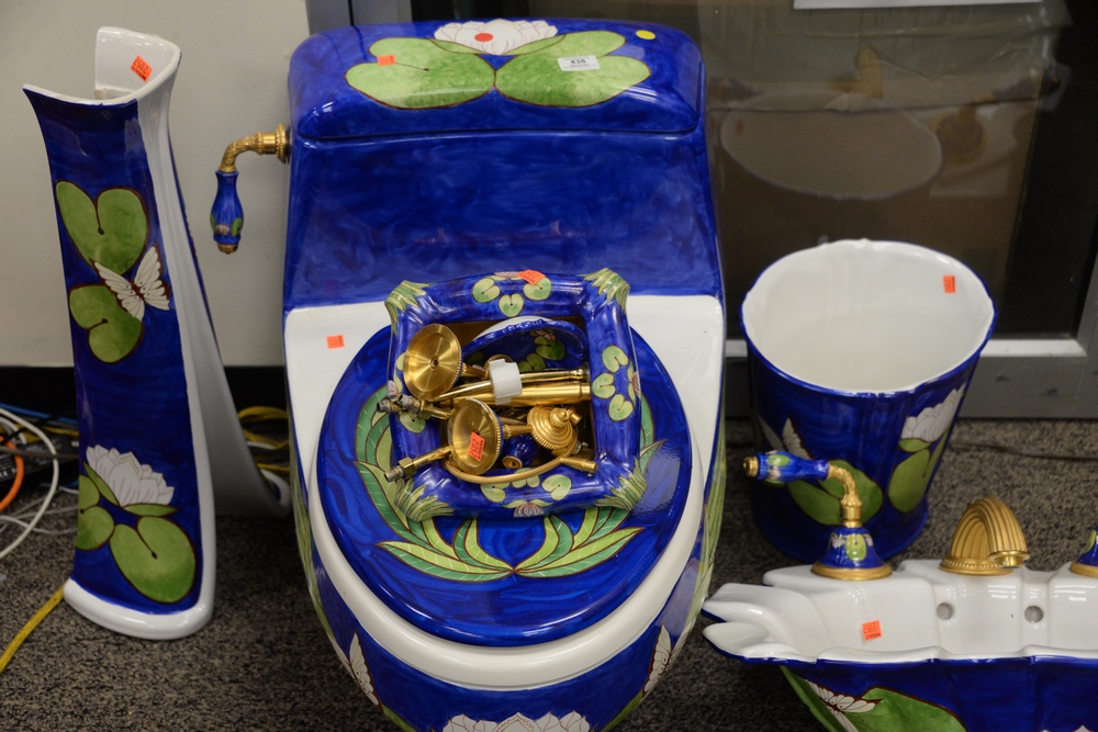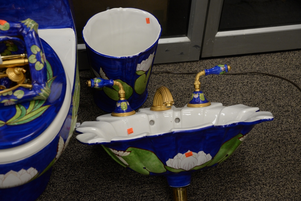 Custom Bathroom Set, having water lily and butterfly decoration to include bathroom fixtures, waste paper basket, scallop sink with pedestal (repaired), and toilet.