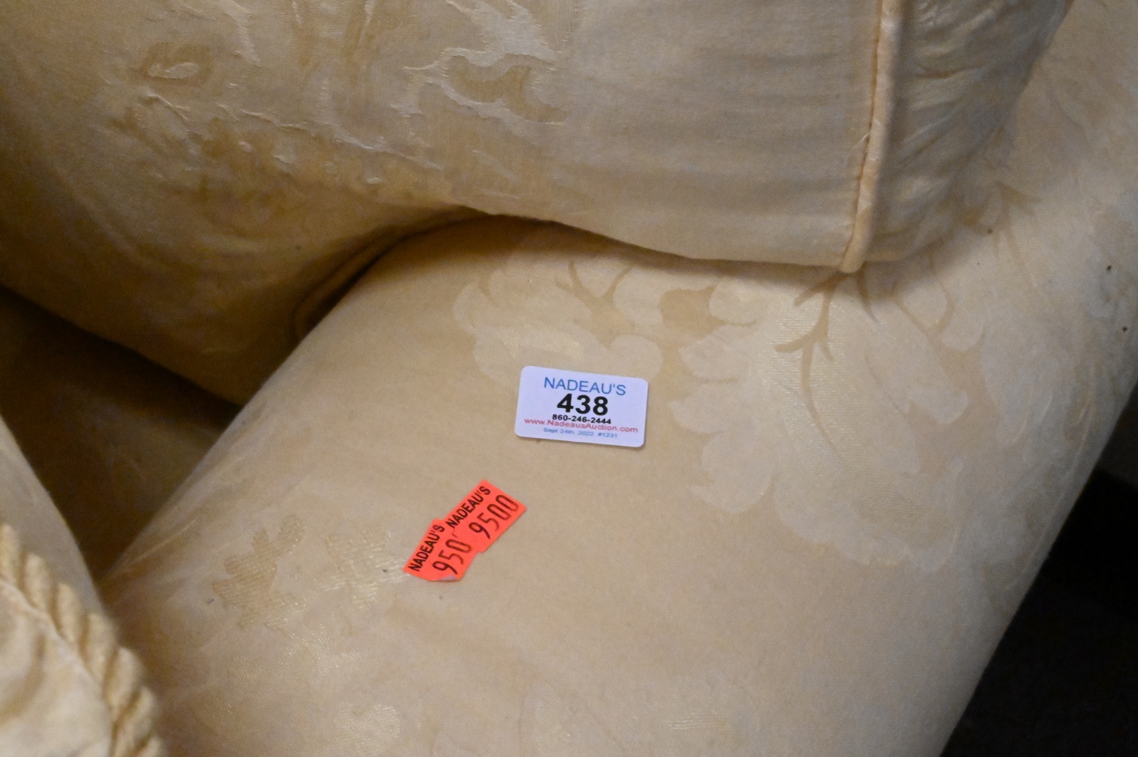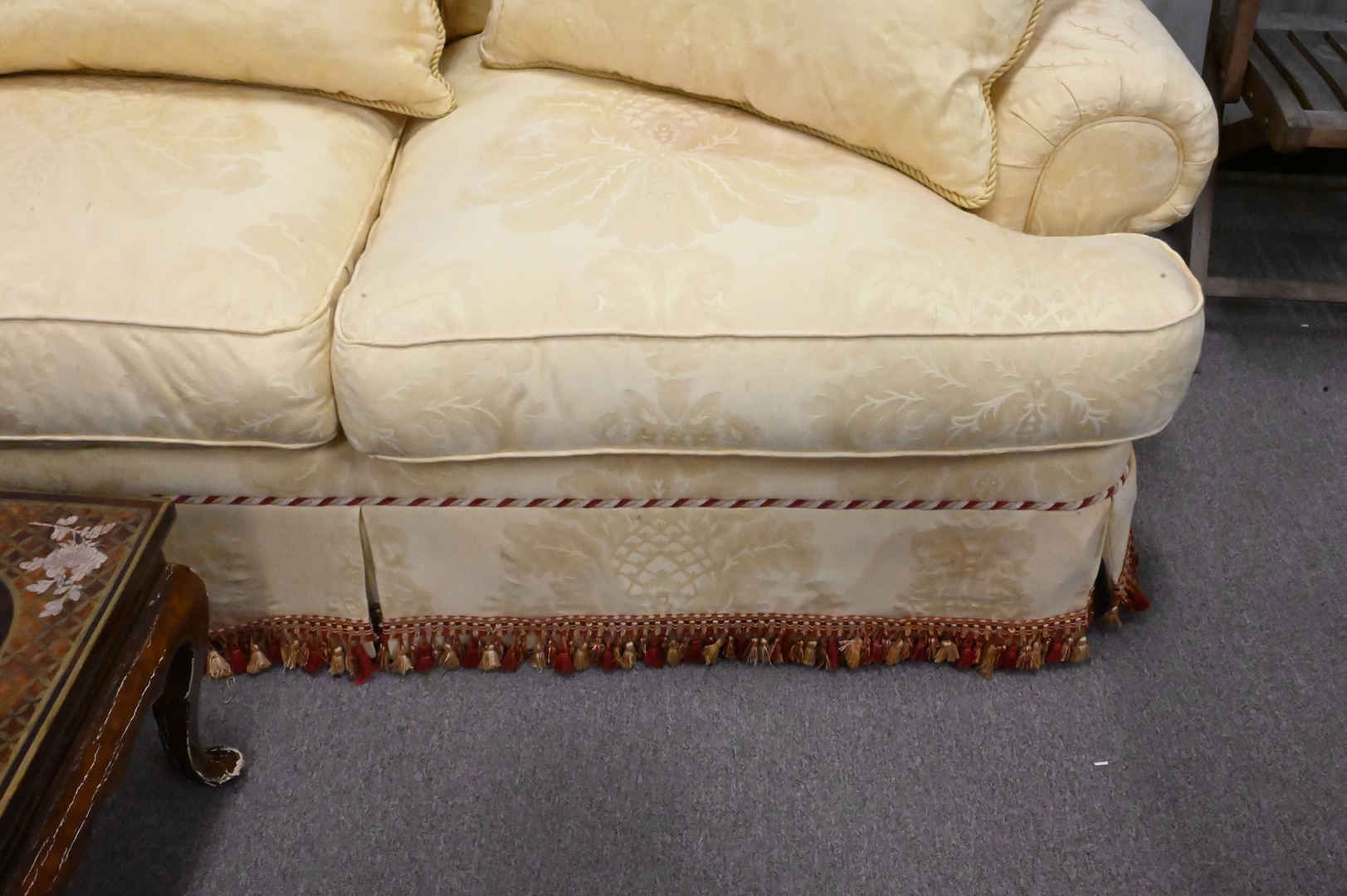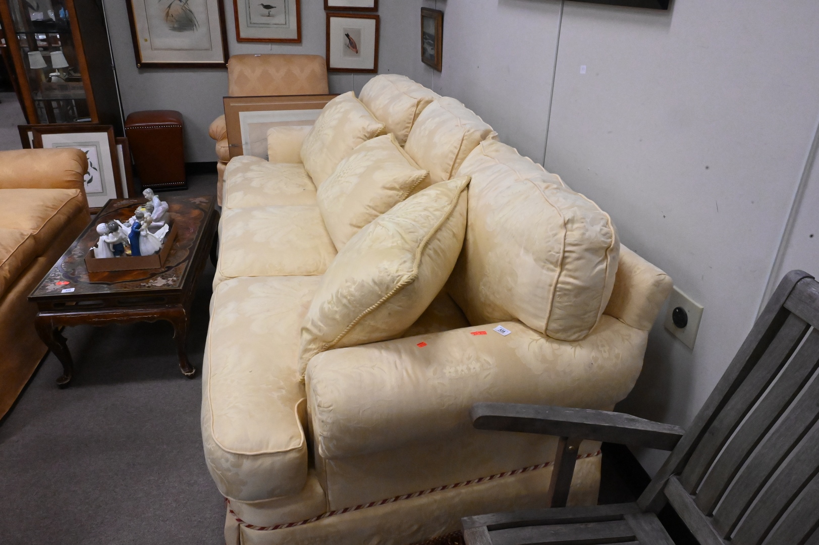 E.J. Victor Custom Upholstered Sofa, slight sun fading to back, height 36 inches, length 93 inches.