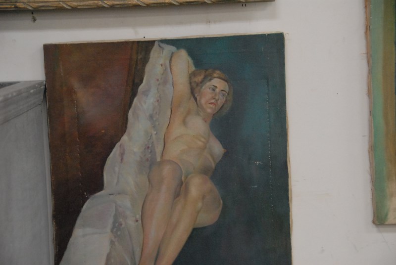 Lot 438: Group of four oil paintings, one nude female, two still life, and one standing black man. 19 x 15 to 30 x 24