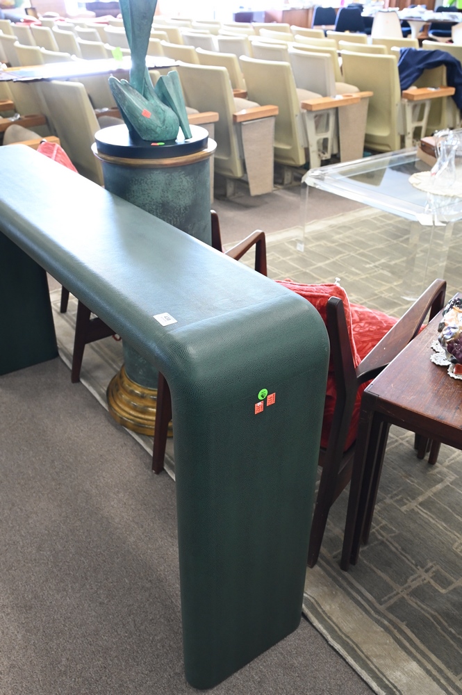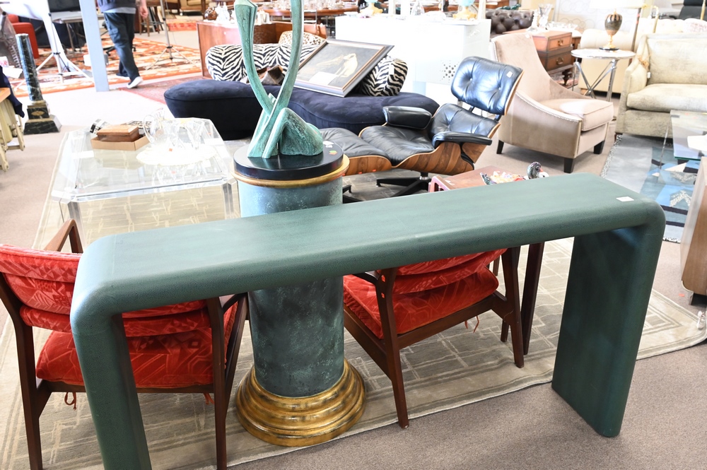 Lot 438: Karl Springer Console Table, in green shagreen, signed Karl Springer 1993, height 32 inches, width 60 inches. Provenance: From a private New York City collection.
