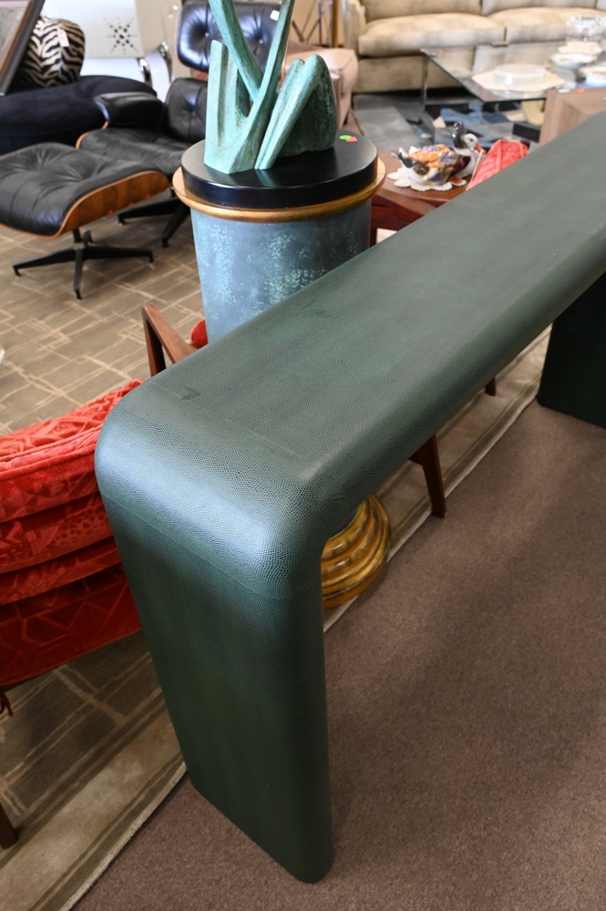 Karl Springer Console Table, in green shagreen, signed Karl Springer 1993, height 32 inches, width 60 inches. Provenance: From a private New York City collection.