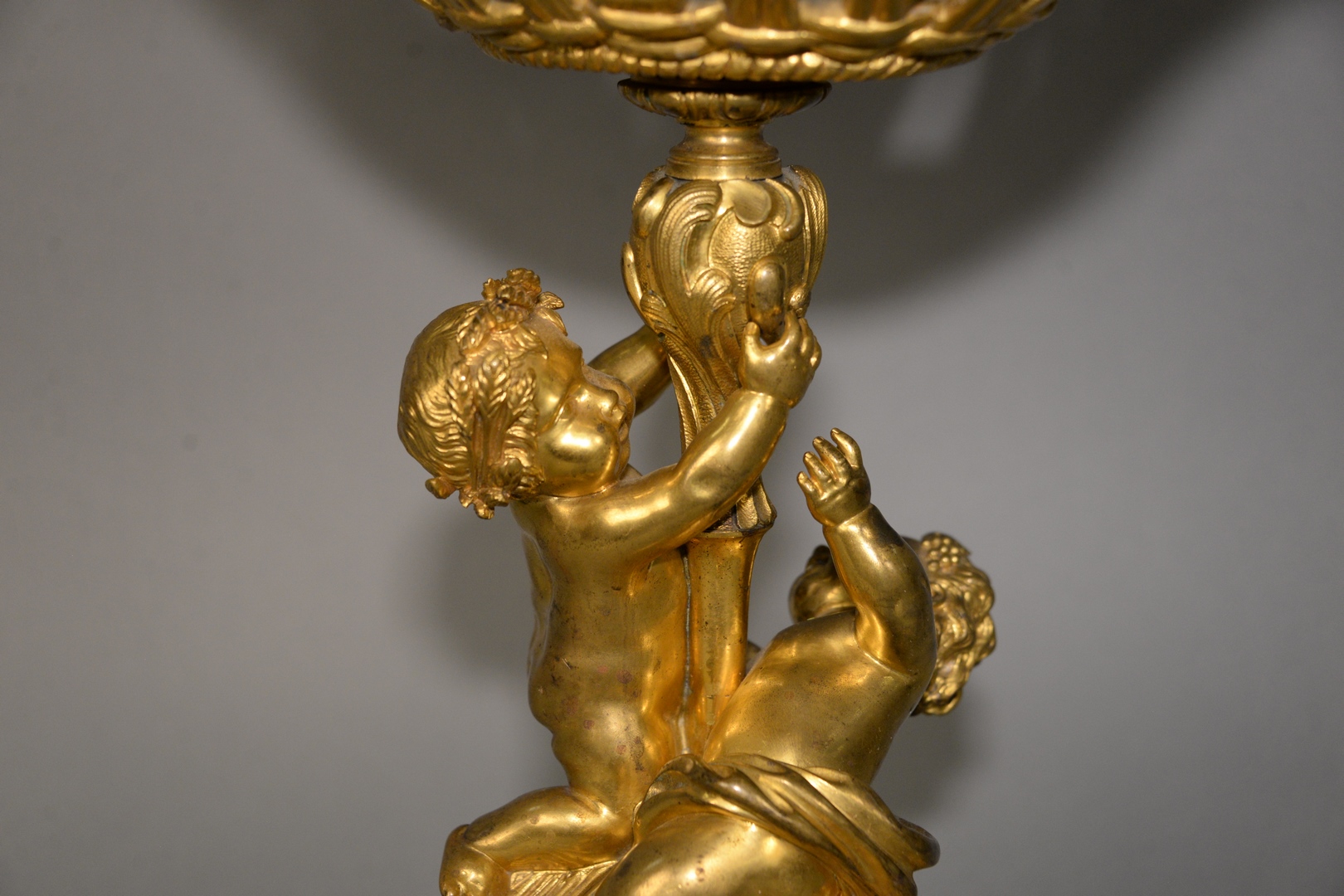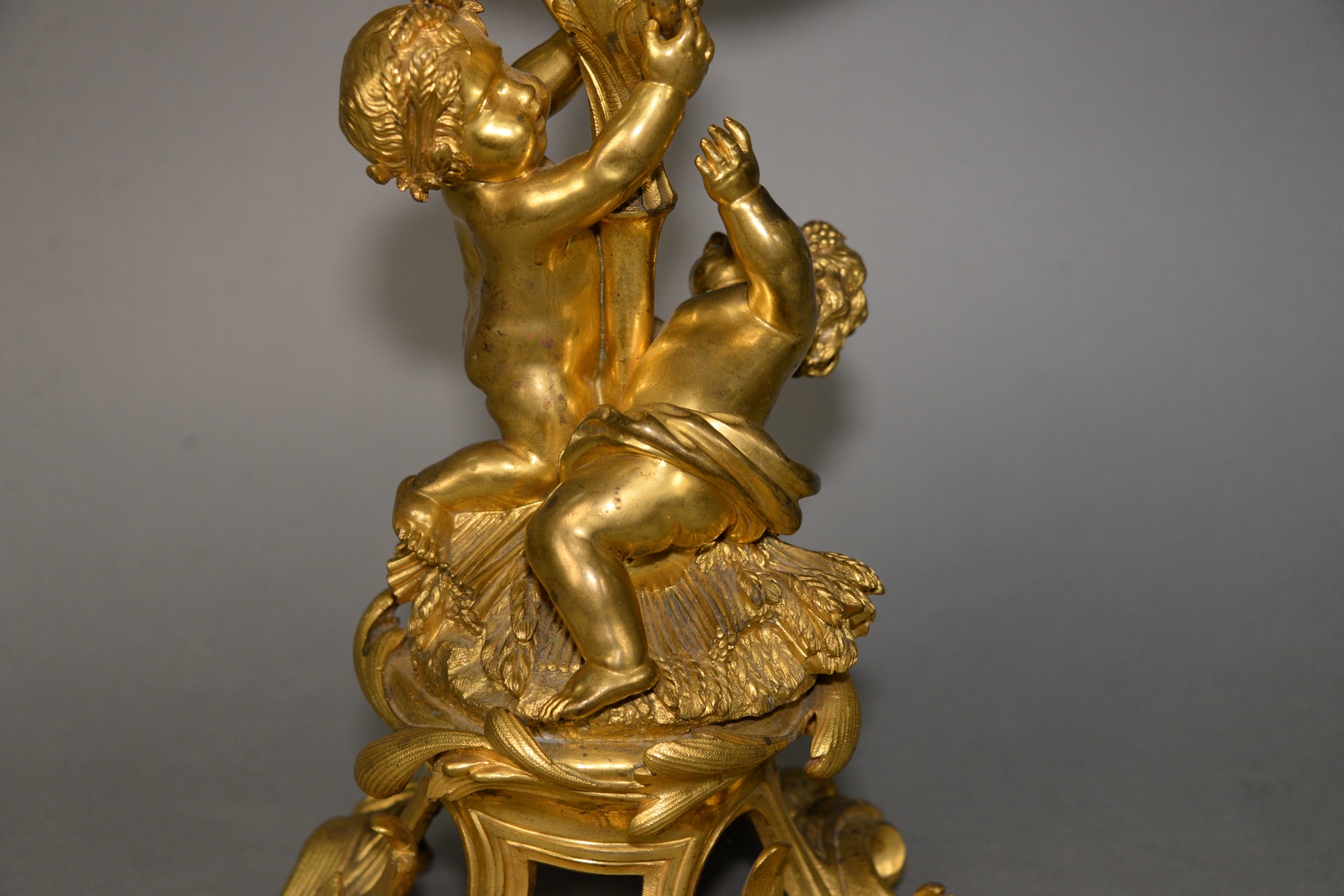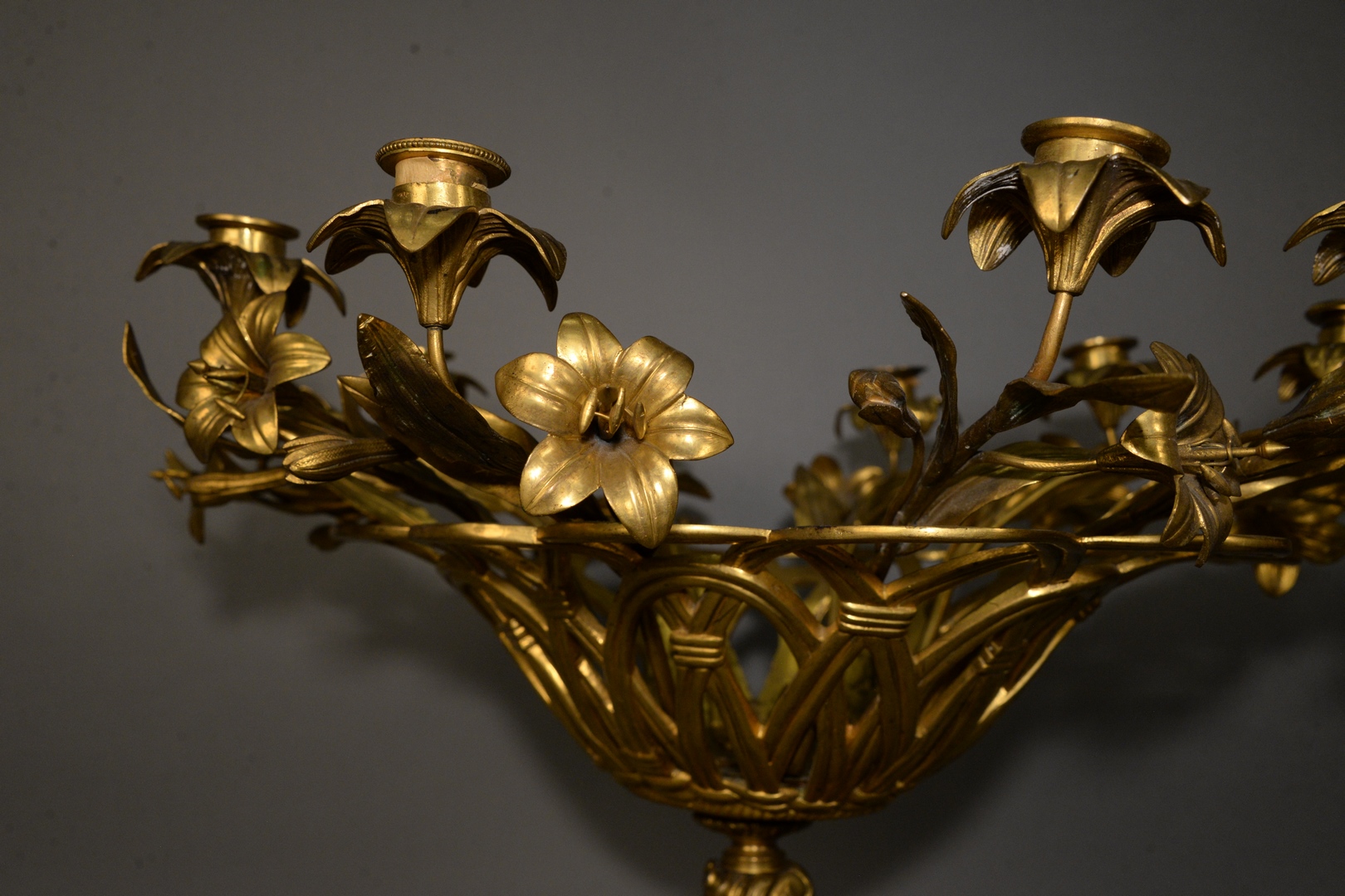 Lot 438: Large French Gilt Bronze Centerpiece having flower basket, surrounded by ten candle holders and flowers, supported by two Putti shaf…