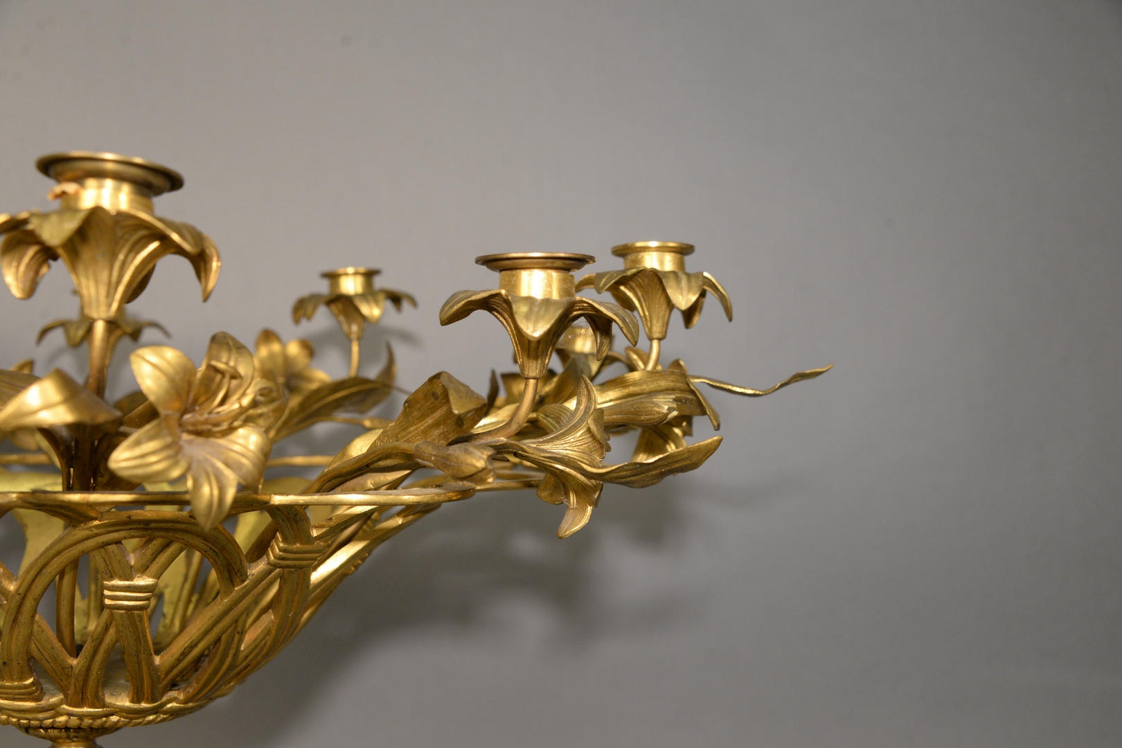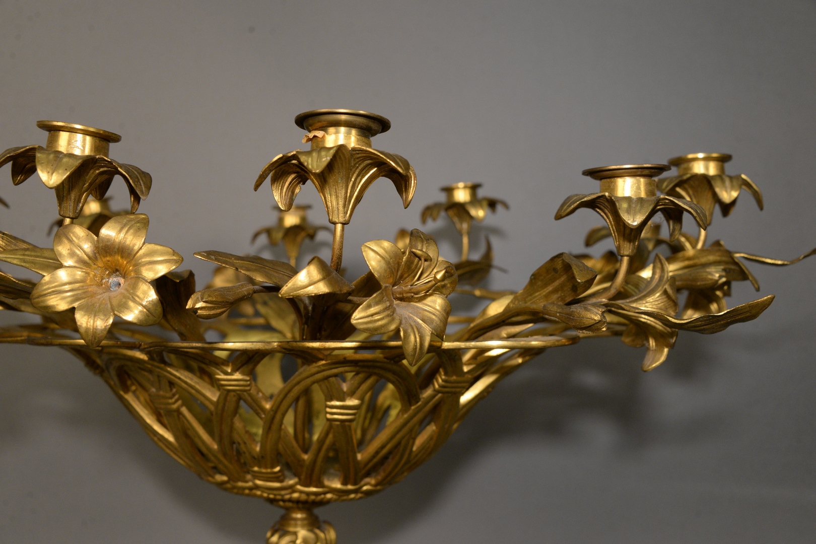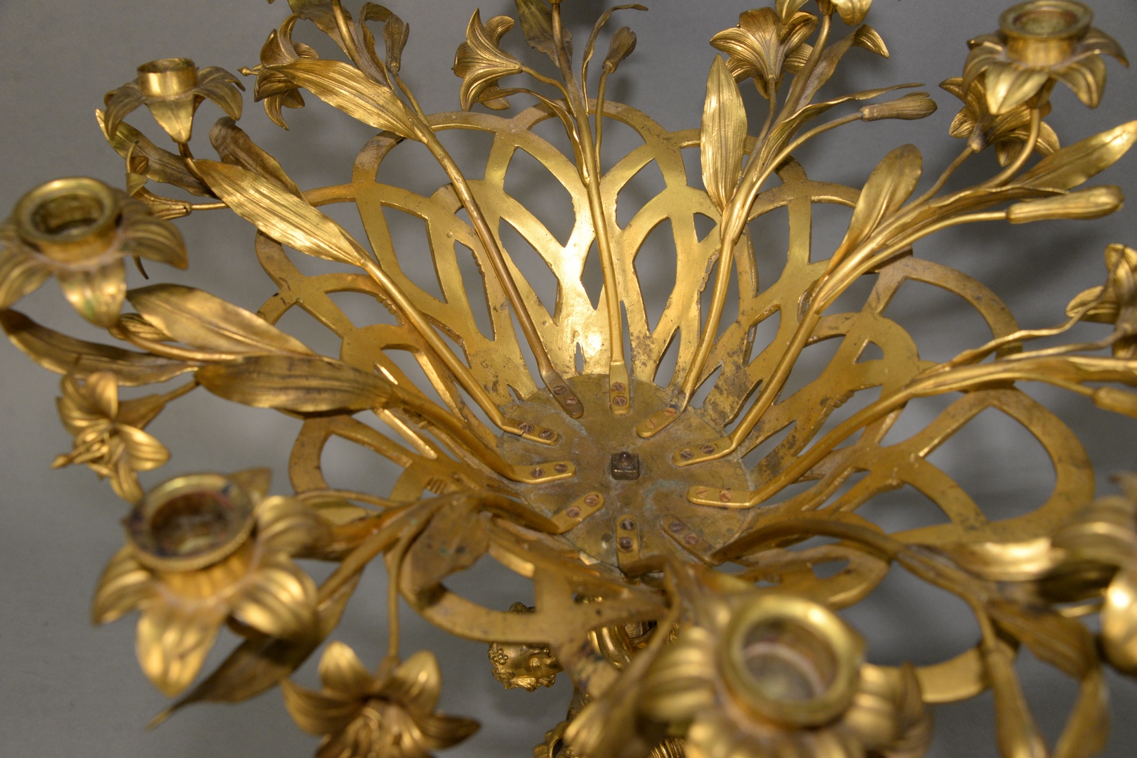 Lot 438: Large French Gilt Bronze Centerpiece having flower basket, surrounded by ten candle holders and flowers, supported by two Putti shaf…