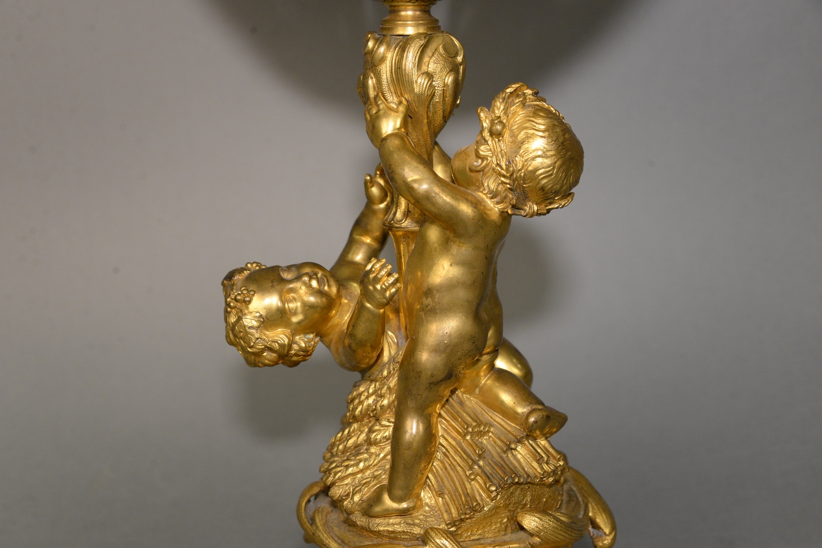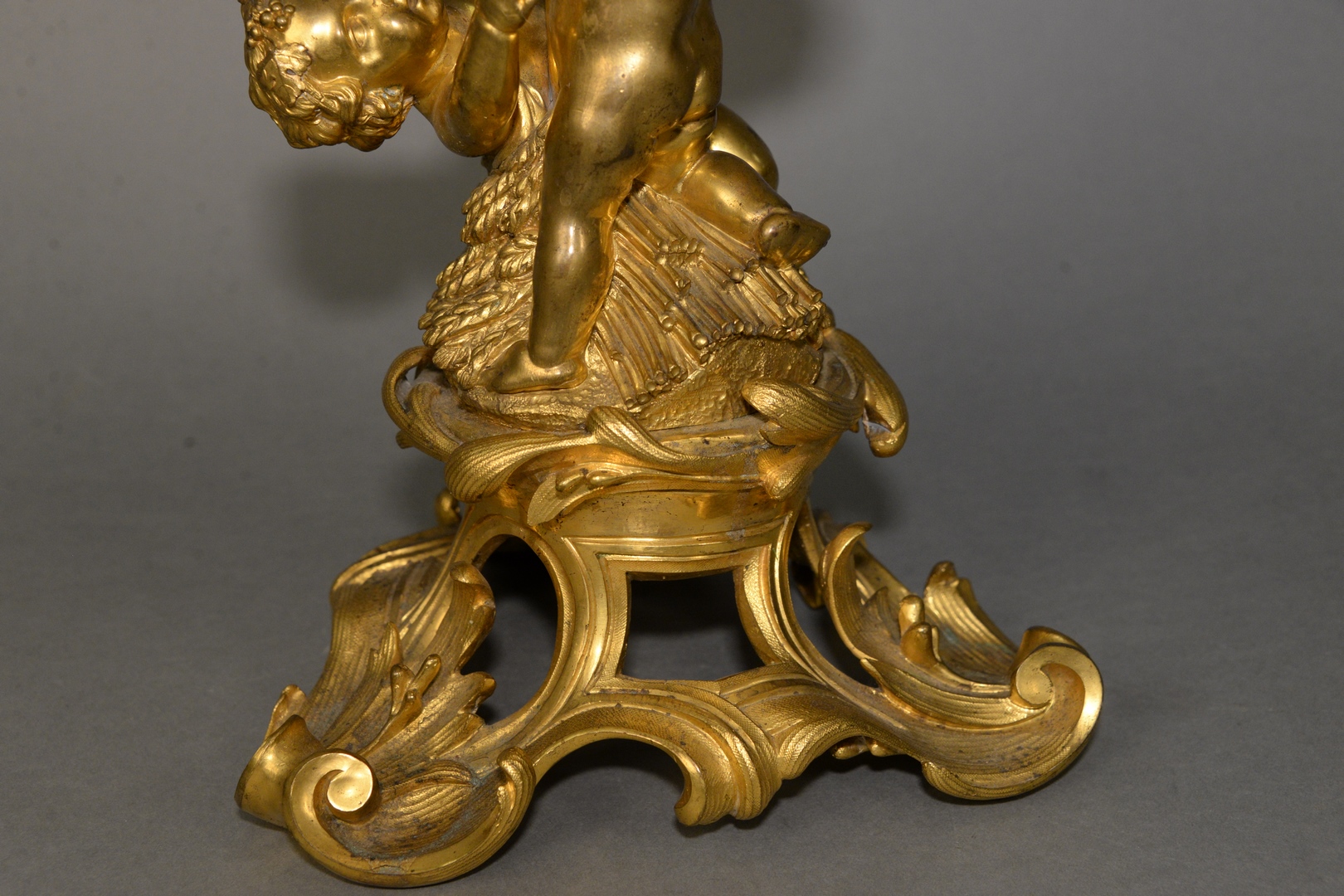 having flower basket, surrounded by ten candle holders and flowers, supported by two Putti shaft and Rococo base
