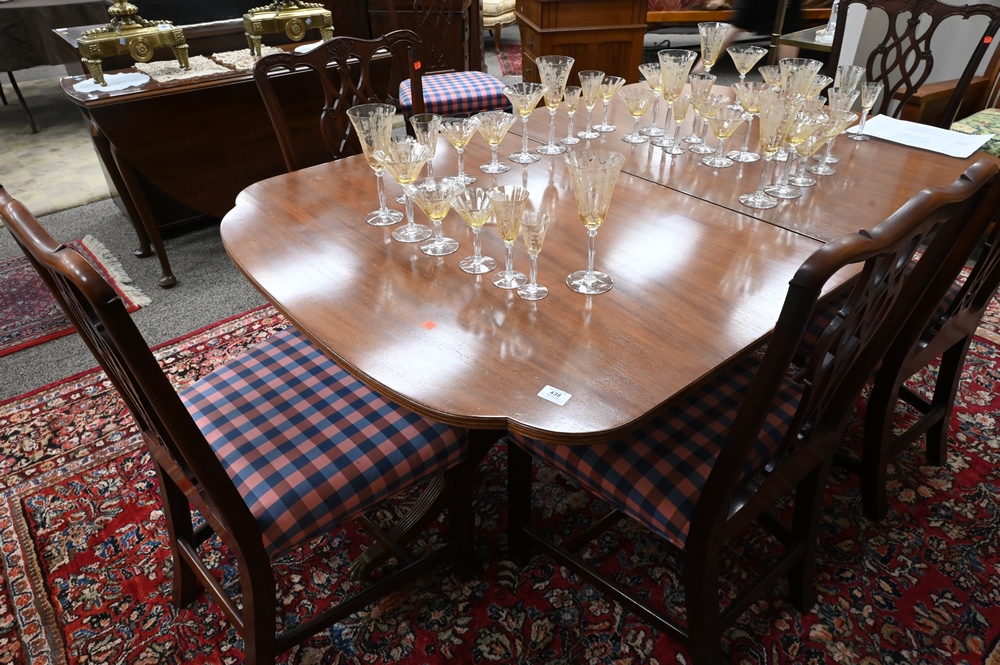 Margolis Seven Piece Dining Set, to include six chippendale style chairs with fully upholstered seats and shaped top table on double pedestal base, height 29 inches, along with three 12 inch leaves, opening to 43 x 98 inches, table top 43″ x 62″.