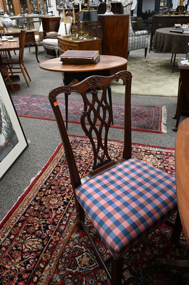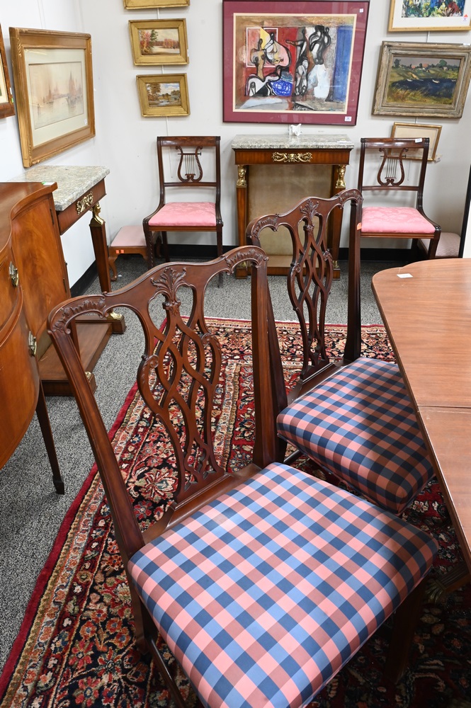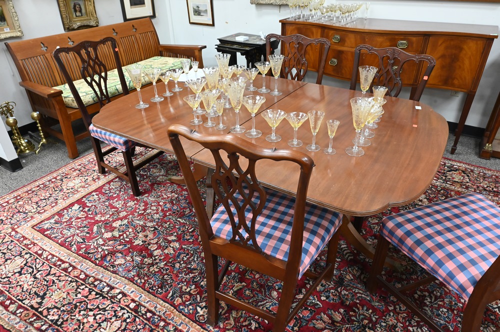Lot 438: Margolis Seven Piece Dining Set, to include six chippendale style chairs with fully upholstered seats and shaped top table on double pedestal base, height 29 inches, along with three 12 inch leaves, opening to 43 x 98 inches, table top 43″ x 62″.