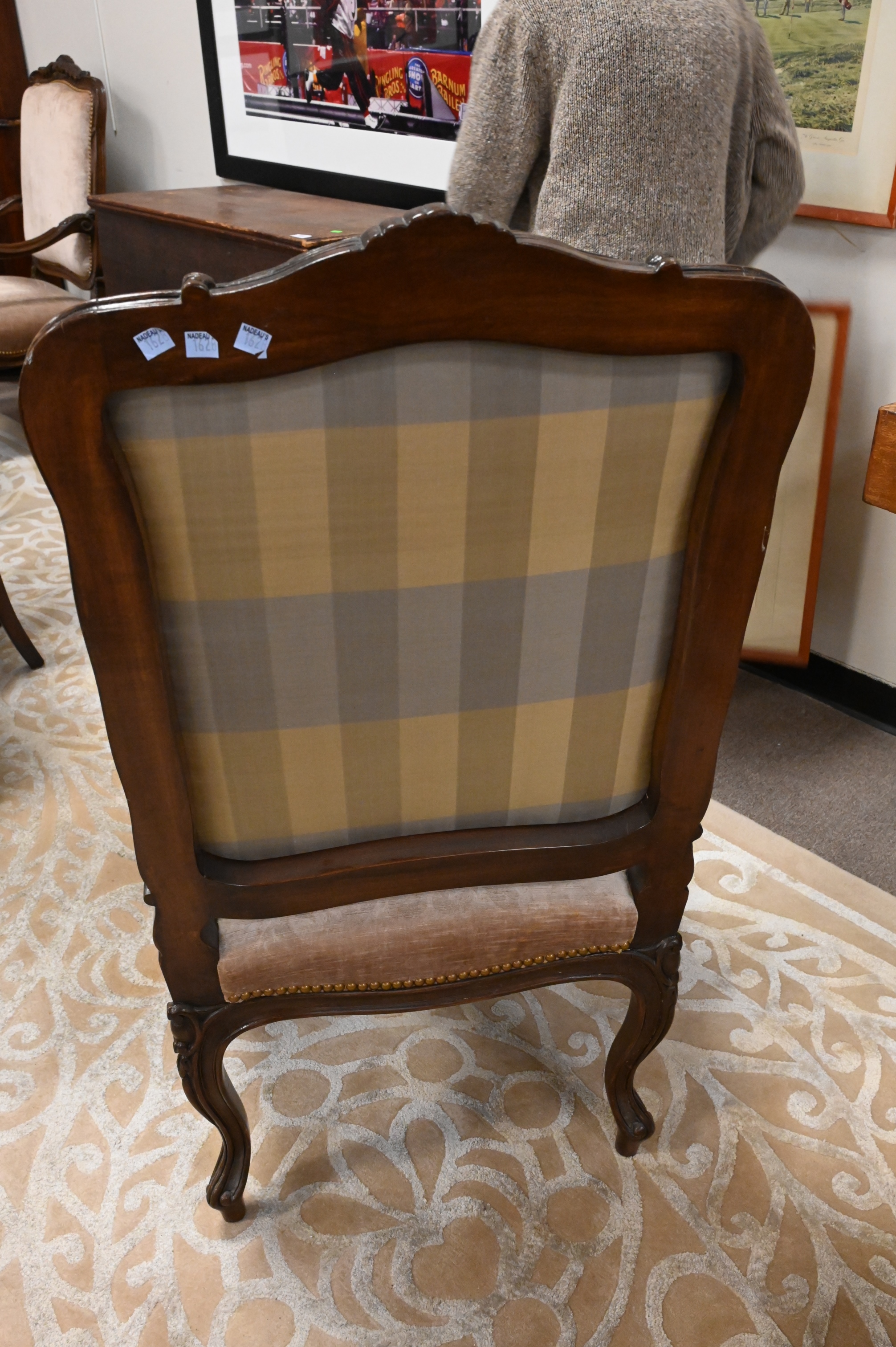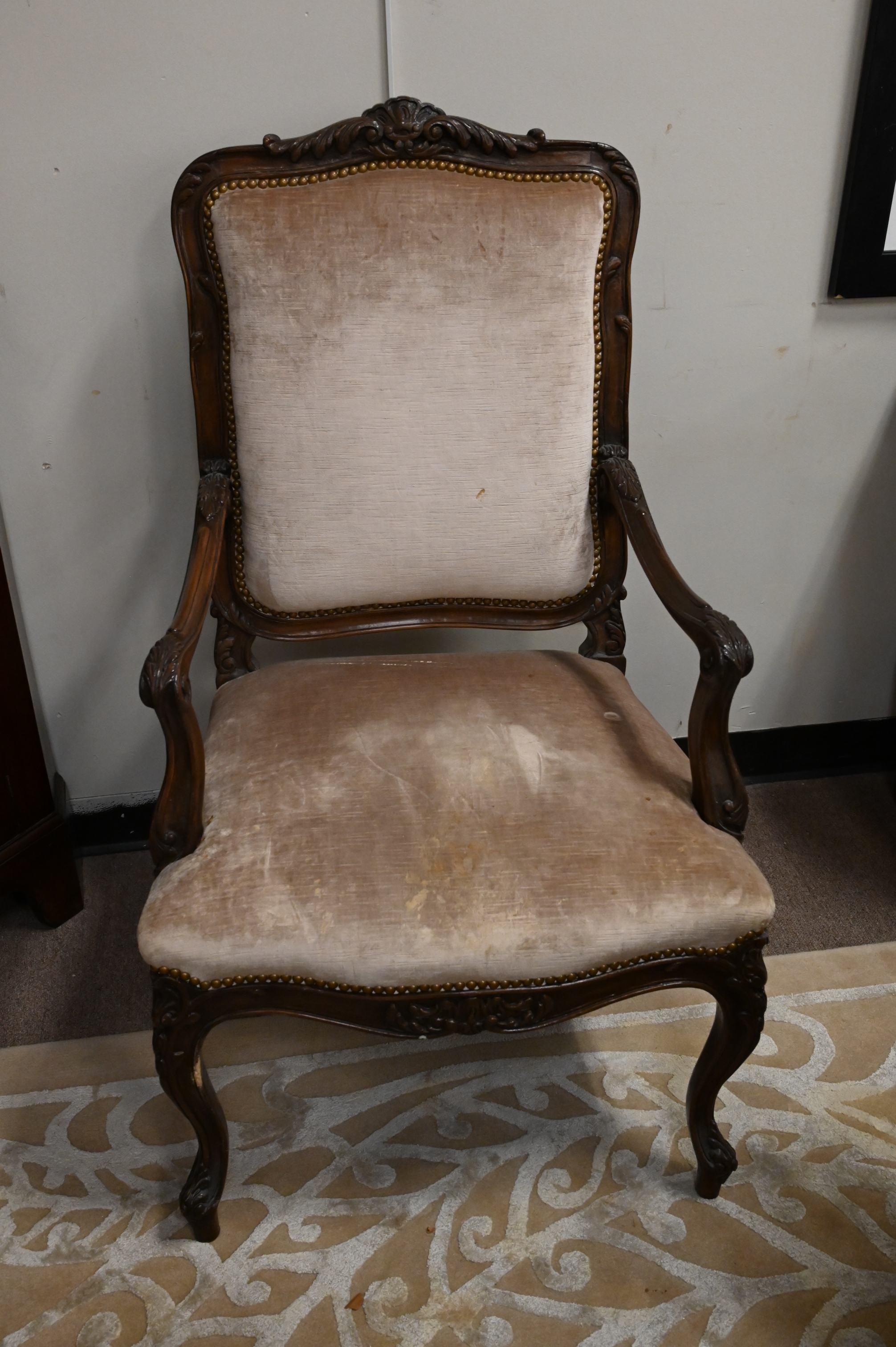 Pair of Louis XV Style Carved Open Arm Chairs, each with upholstered backs and seats, height 44 inches, width 24 inches.