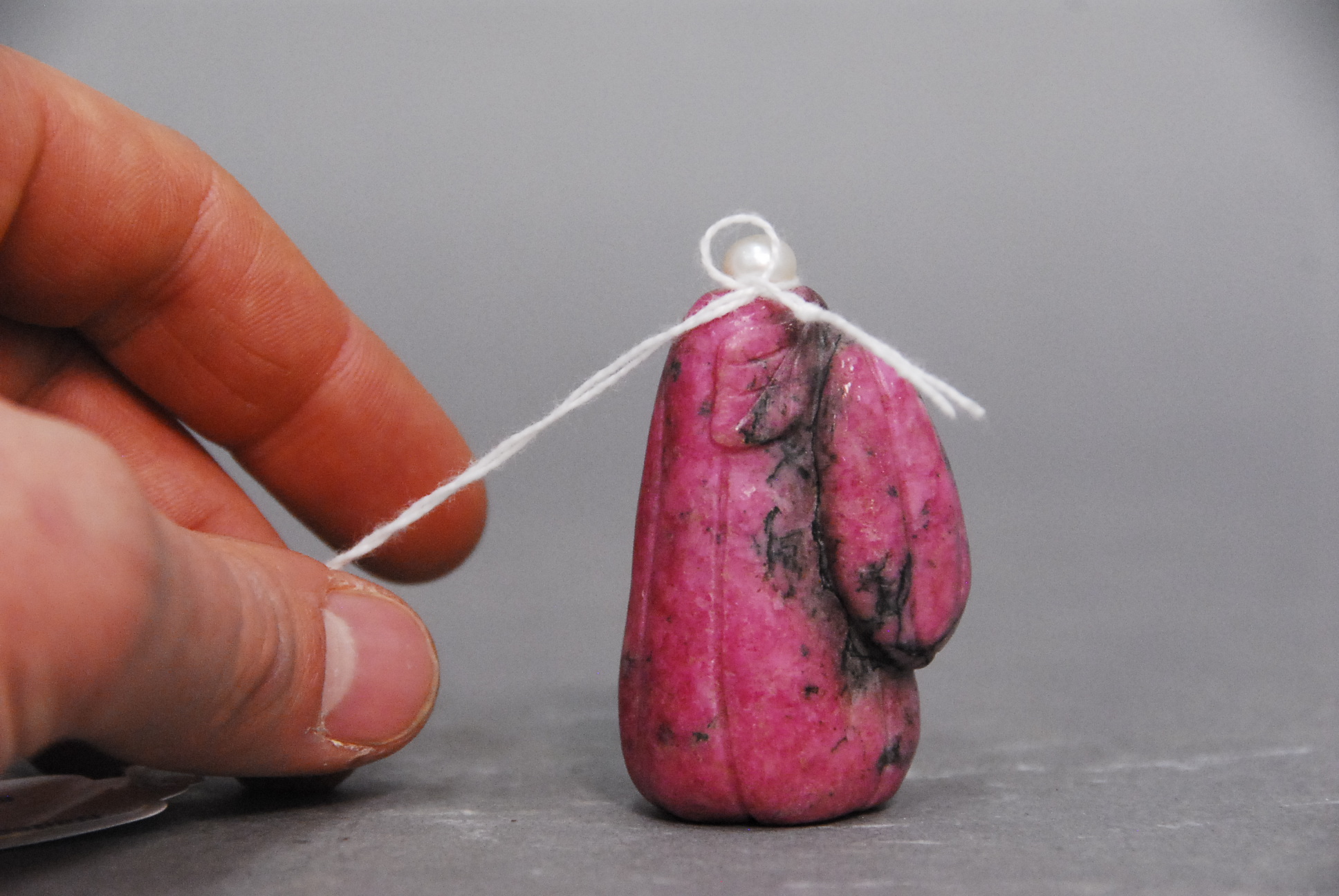 Pink rhodolite snuff bottle carved on the shape of two squash, with pearl stopper, ht 2.