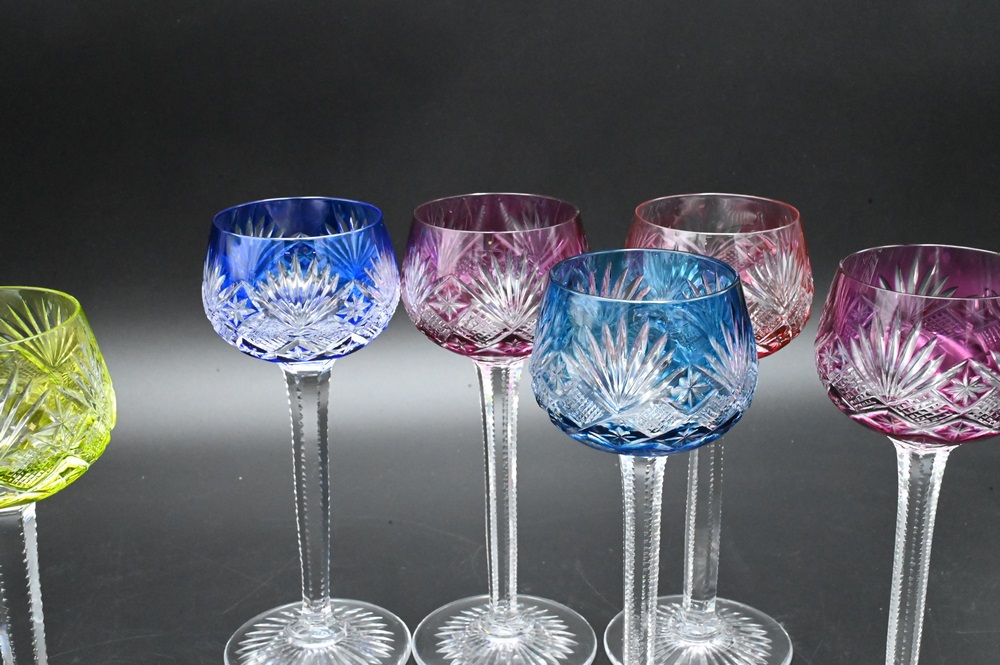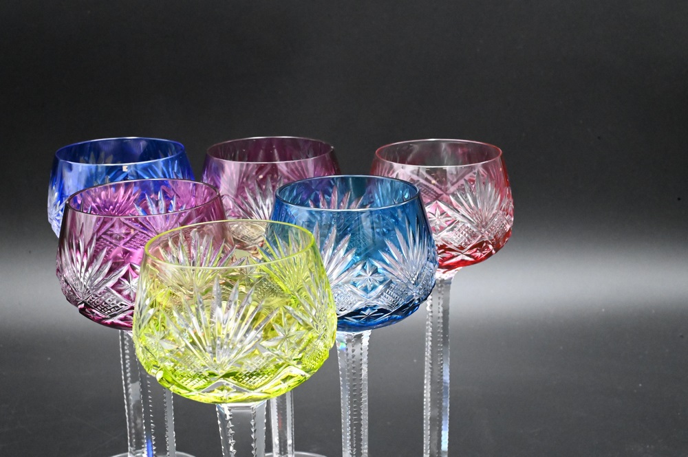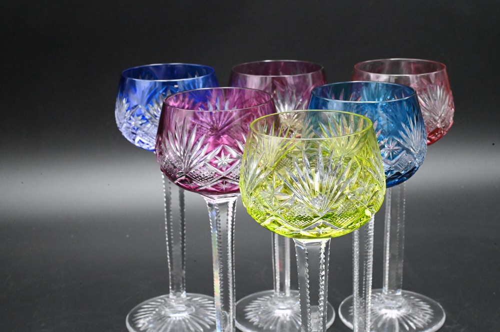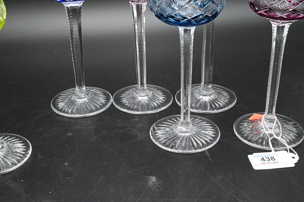 Set of Six St. Louis Multicolor Cut Glass Stems, cut to clear, having zipper pattern stems, height 7 1/2 inches.